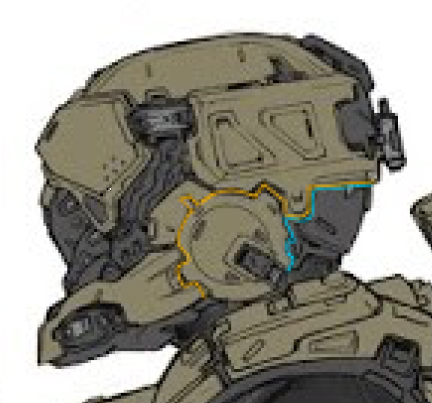 Alright, so I'm looking at the helmet system a bit more in terms of how my head will fit into it realistically and make it so the hinge system is not a thing, as it wouldn't work due to how some parts would collide and prevent it from opening properly. So I'm looking at either two designs of making it open and close up. The blue/teal line is for the simplest and easiest to achieve way of opening up the helmet and slipping my head in, but my worry is that I wont be able to fit in while wearing FPV goggles when slipping the helmet on, so the orange line would be for greater area to slip into (wider) and I would just use magnets for both ideas to keep it closed while being worn. With the orange line I would need to first slip it to the side first before pulling back, as I guess there are some higher friction parts that would act as "locks" and prevent it from sliding straight back.