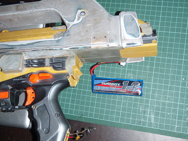 Boxed in the battery box and gave it a sand so its mostly smooth/straight. Note there is a seam down the middle that allows it to be split in half for when you need to get to the nerf internals. (Also you cant really see it but i evened up both epoxy sculpt rails so they match better with the upper shroud.)