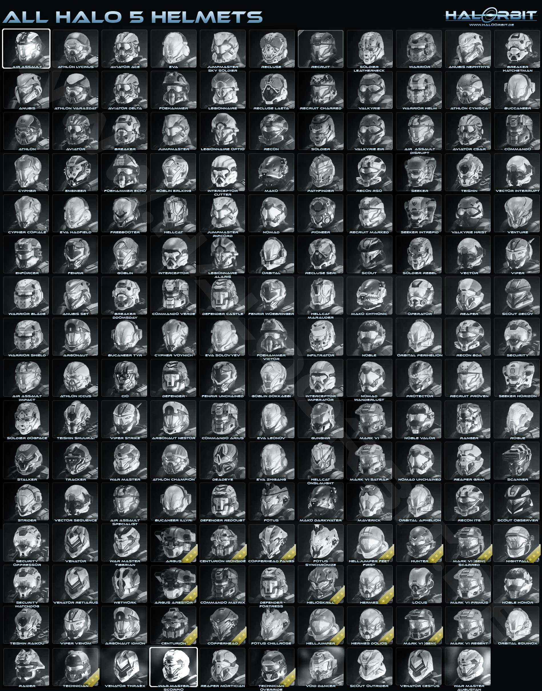 Just to let you all know this is not all the helmets. There are a total of 200 helmets in Halo 5. Some of them are DLC only helmets. Meaning you can only get them by buying Req Packs with real money or getting them with different merch.