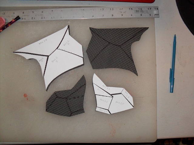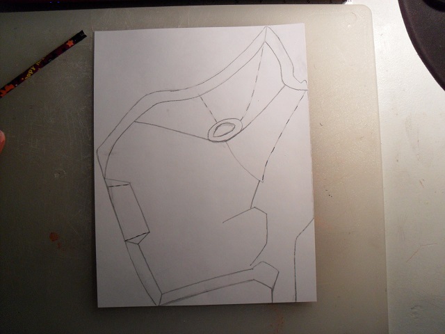 Next, I draw the parts onto cardstock. If this is my first piece, then I perform many measurements to obtain the design. However, these are built off of the plate above, so I used that piece's cardstock template as my base. I then freehand the rest of the part, using my body and common sense as reference. I then draw in where the peaks and valleys will be.