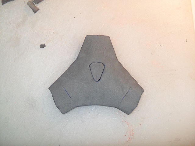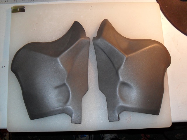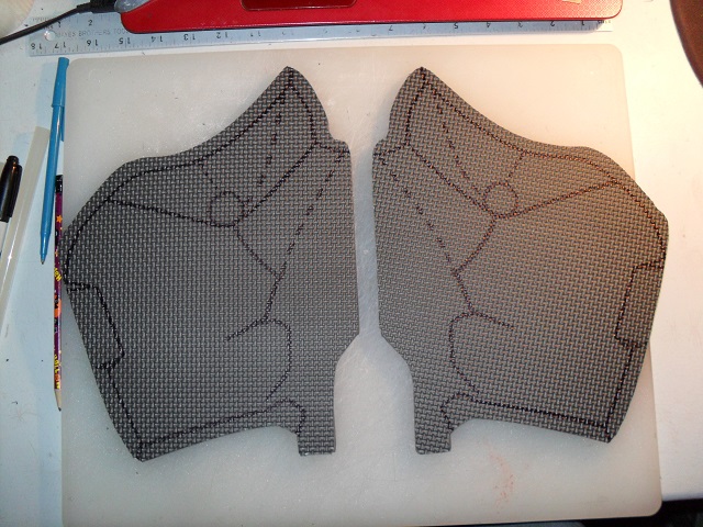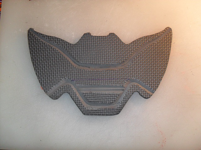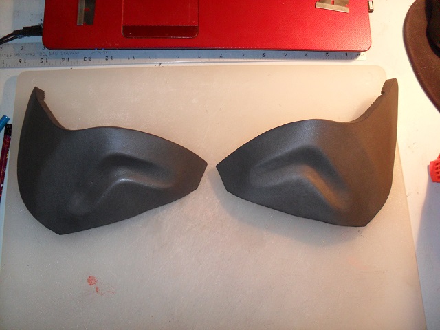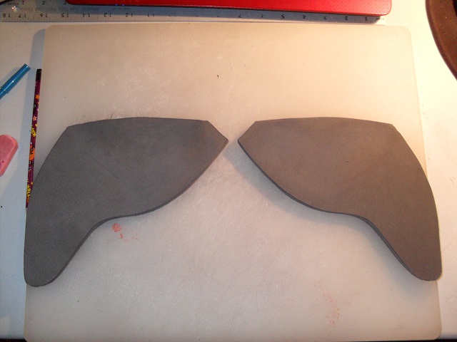 Then, with my heat gun on LOW, I take time to make sure that both sides are very warm. I want them to be easily bendable, but not so much as to melt the EVA. Here is each of the pieces after the initial forming process is done.