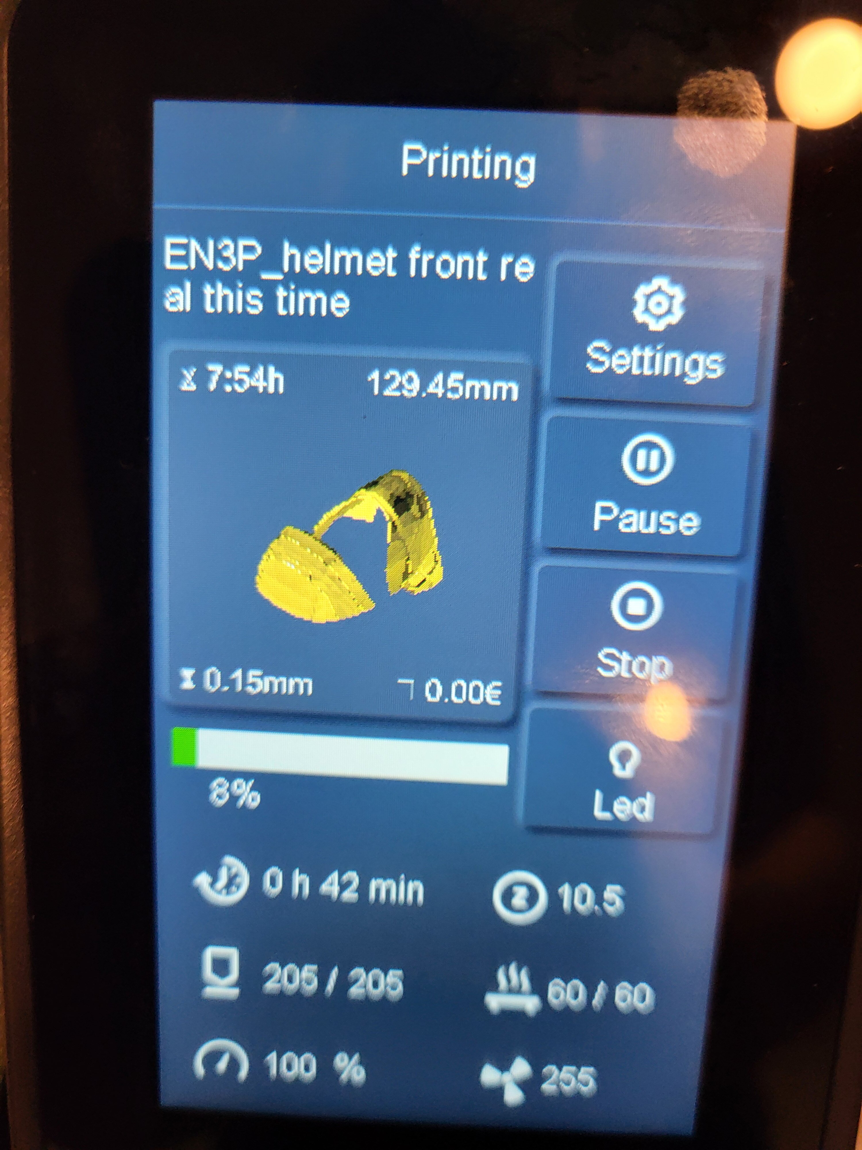 Spent a while on the helmet, took about a week to print all the pieces, and took about 1 kg of PLA Pro filament for the whole helmet.