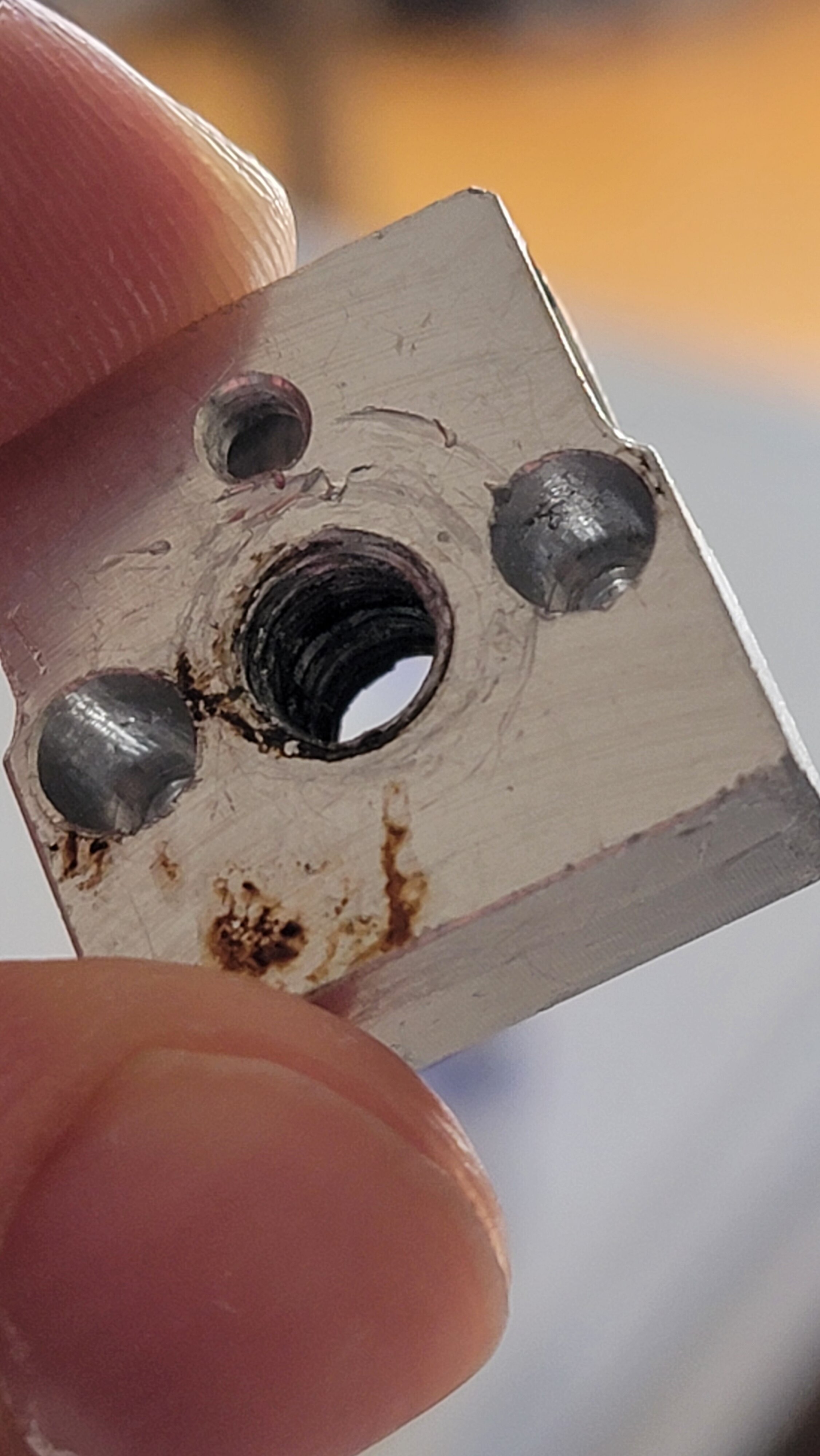 After attempting to print my first forearm of the build, my printer decided to give me some troubles.. I narrowed it down at first to a cleaning issue and gave it some TCL. After cleaning it out as good as I could at 1 am, I gave in to my need to start it back up asap and put a new nozzle in the hotend. After tightening it back up and giving it one last look I noticed that the nozzle looked a little crooked.. turns out the hotend block was a little more dirty then I thought, and it had cooled down before I tried putting in the new nozzle. Since I tightened the nozzle with the strength of Thor I ended up cross threading the block..