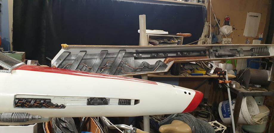 The three-footer is a scaled down version, using the same build formers and methods. I used scrap wood and putty from around the workshop, bits of wire, coathangers, cable ties and whatever else suited the job. I only hope the life sized one turns out as good or better. You can see parts of it in the background.