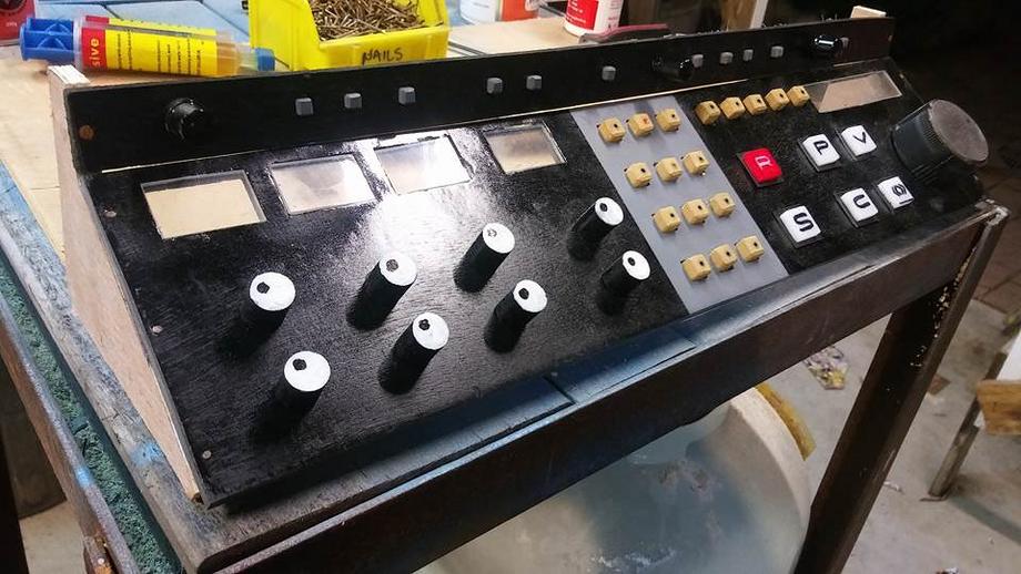 The large knob is the lid of a methylated spirits bottle with a steel plate glued to the top. The small knobs I turned from wood and painted up. The screens are clear perspex sheet and the large buttons are hand cut from opaque white perspex sheet. The red one is just coloured in with a permanent marker pen. The small buttons are dressed timber, cut and hand sanded into shape.