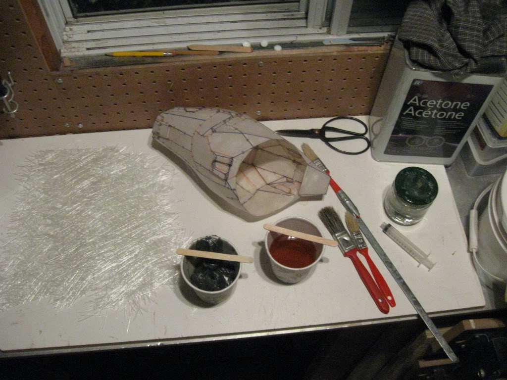 When I've done the fiberglas in my parts I used a mix of home made rondo and resin at the same time. Put some rondo where you think it will be hard for the fiber to stay in place, like in corners, recess, strange details and small edges. Then put your precut fiber over it and add resin, with a brush remove the excess resin to keep the part lightweight. You dont have to do a part in one shot, do one half in each shins, wait for it to cure, when the heat as come down do the other half's.