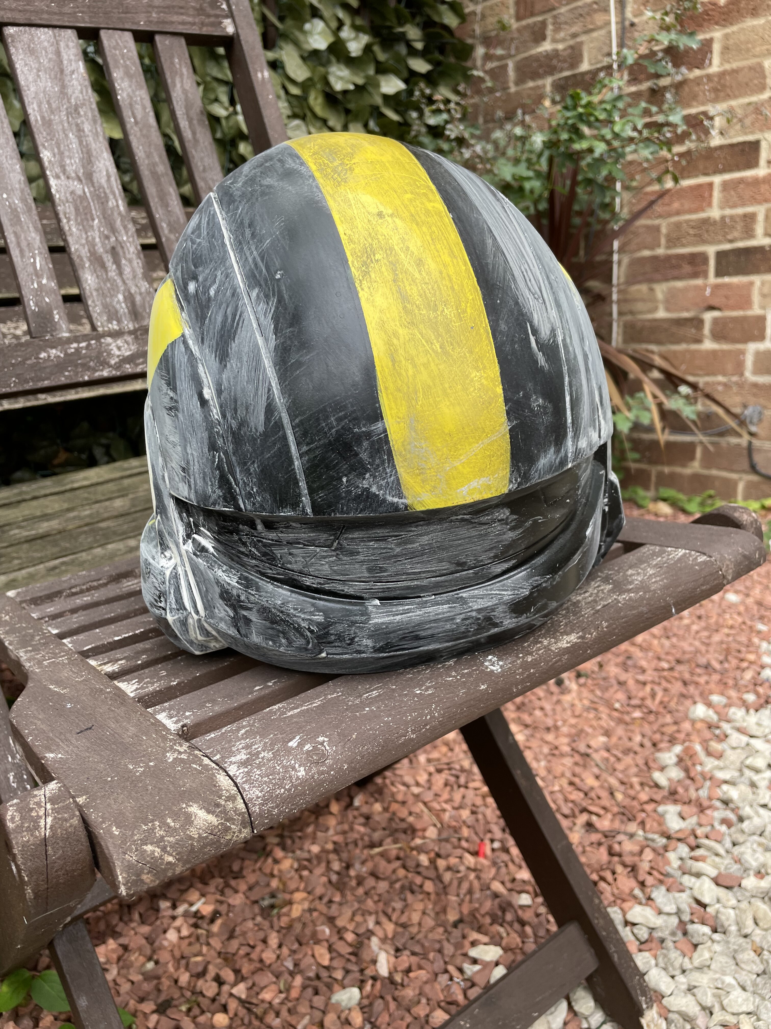 Respray the entire helmet gloss black, add in chip’s yellow stripes, hand paint details and round off with some silver dry brush and a clear coat pass.