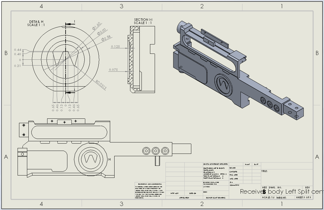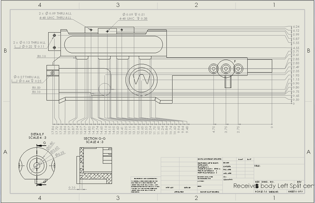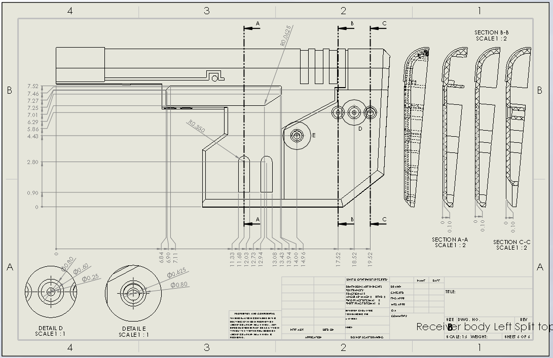 Alright, so on to the new stuff. The original intent for the receiver was to build each half in two pieces making a total of 4 pieces for just the body. The maximum length of material that I can get (based on my online shopping) is a 24 x 36 inch piece of plate aluminum. And each half of the body is 44 inches long. Therefore they need to be split up. However, after some hole features were added, it became evident that the body needed to be cut up some more. So now the body is in three pieces per side for a grand total of six pieces. Here's the left half apart and together:
