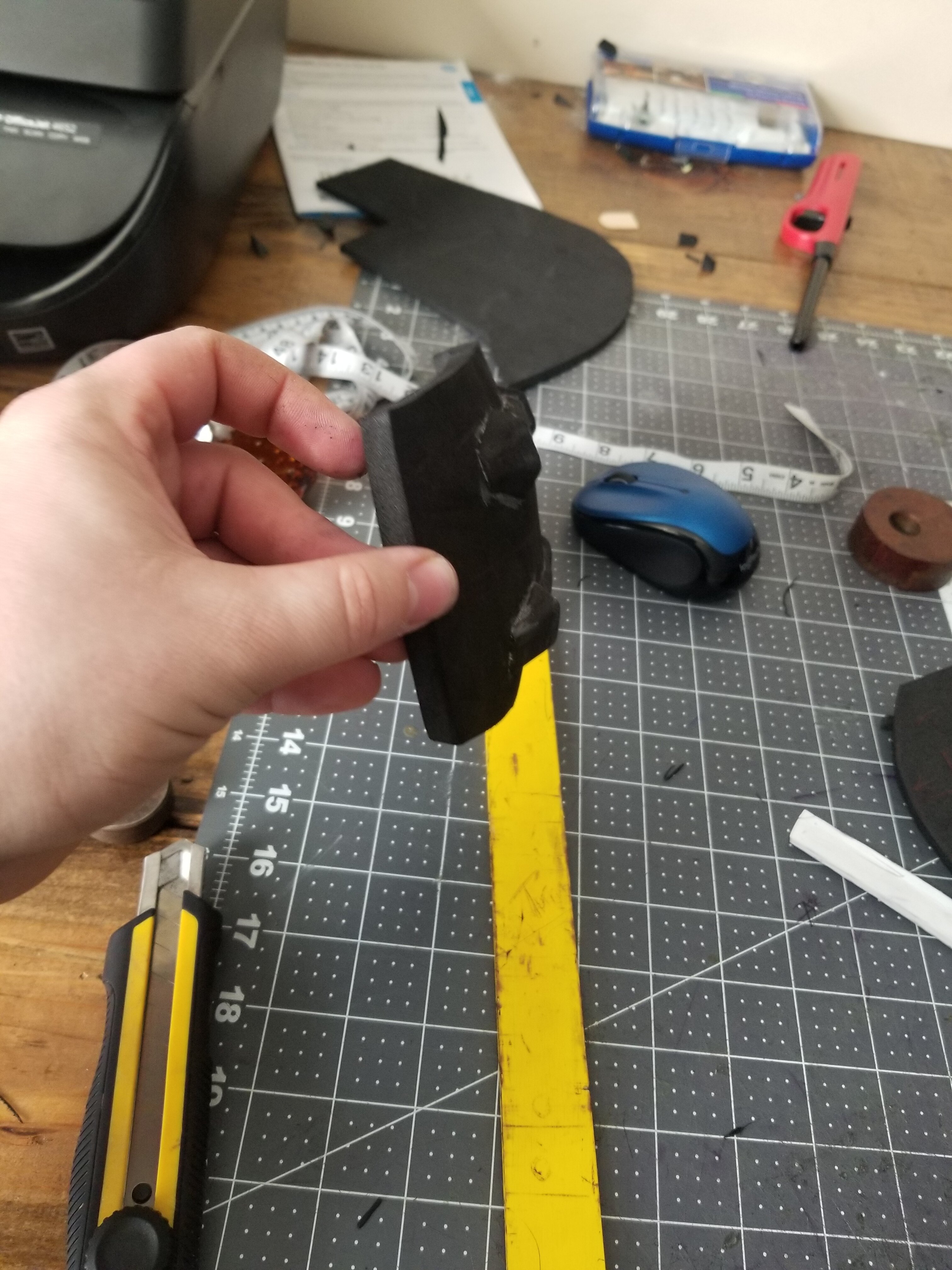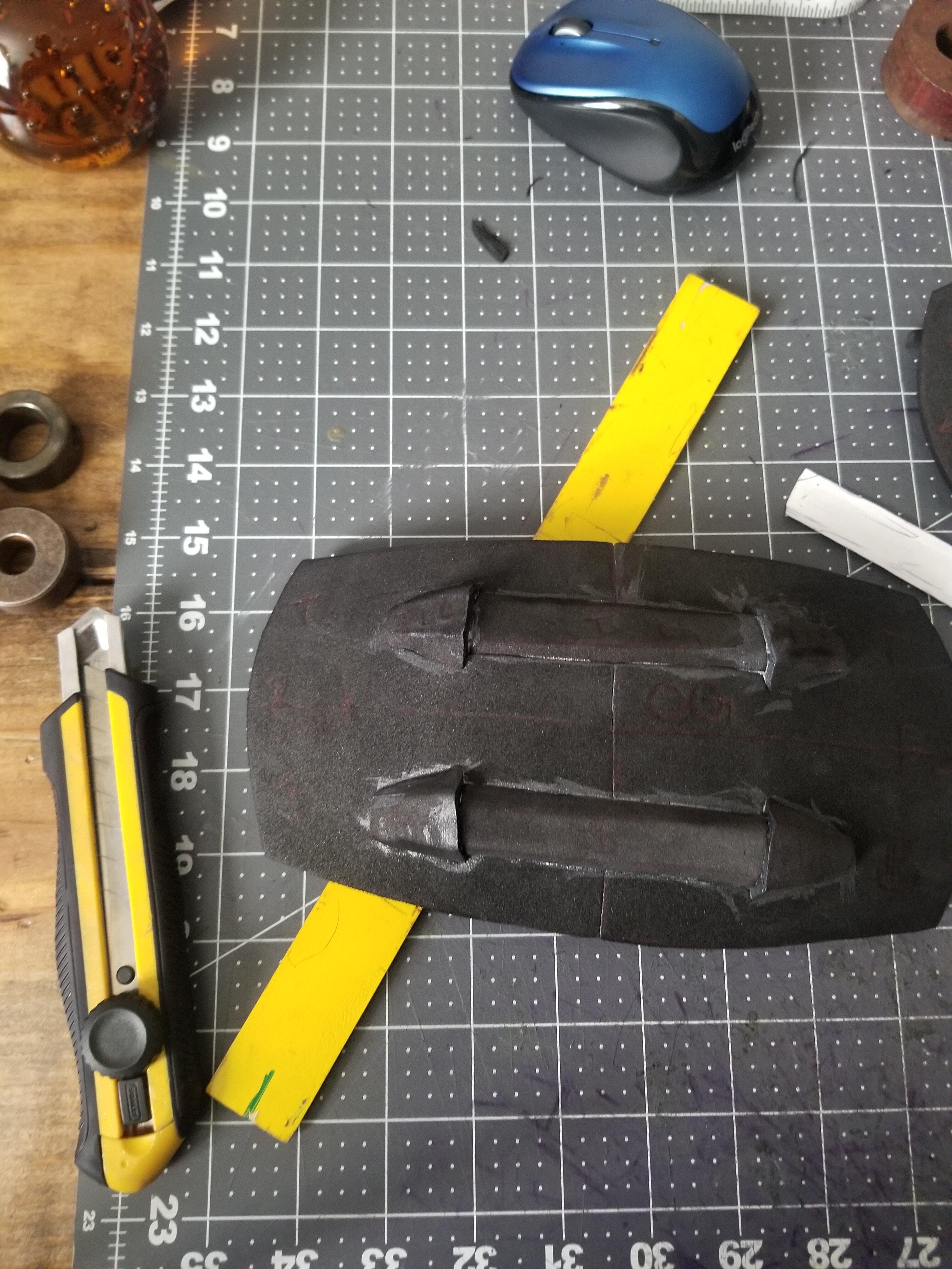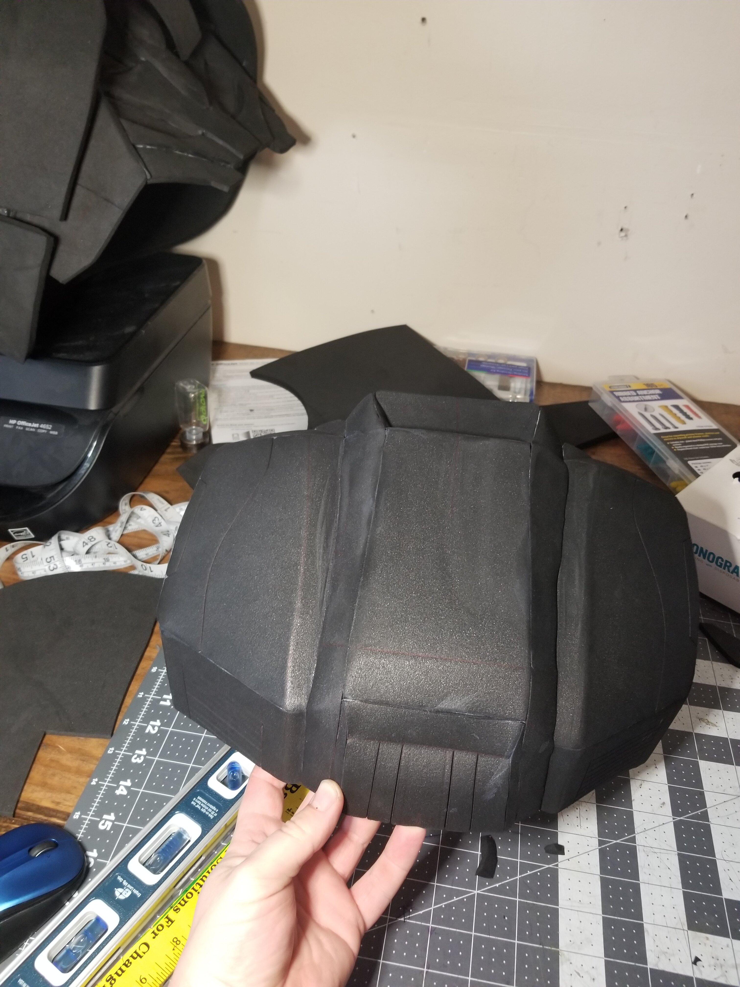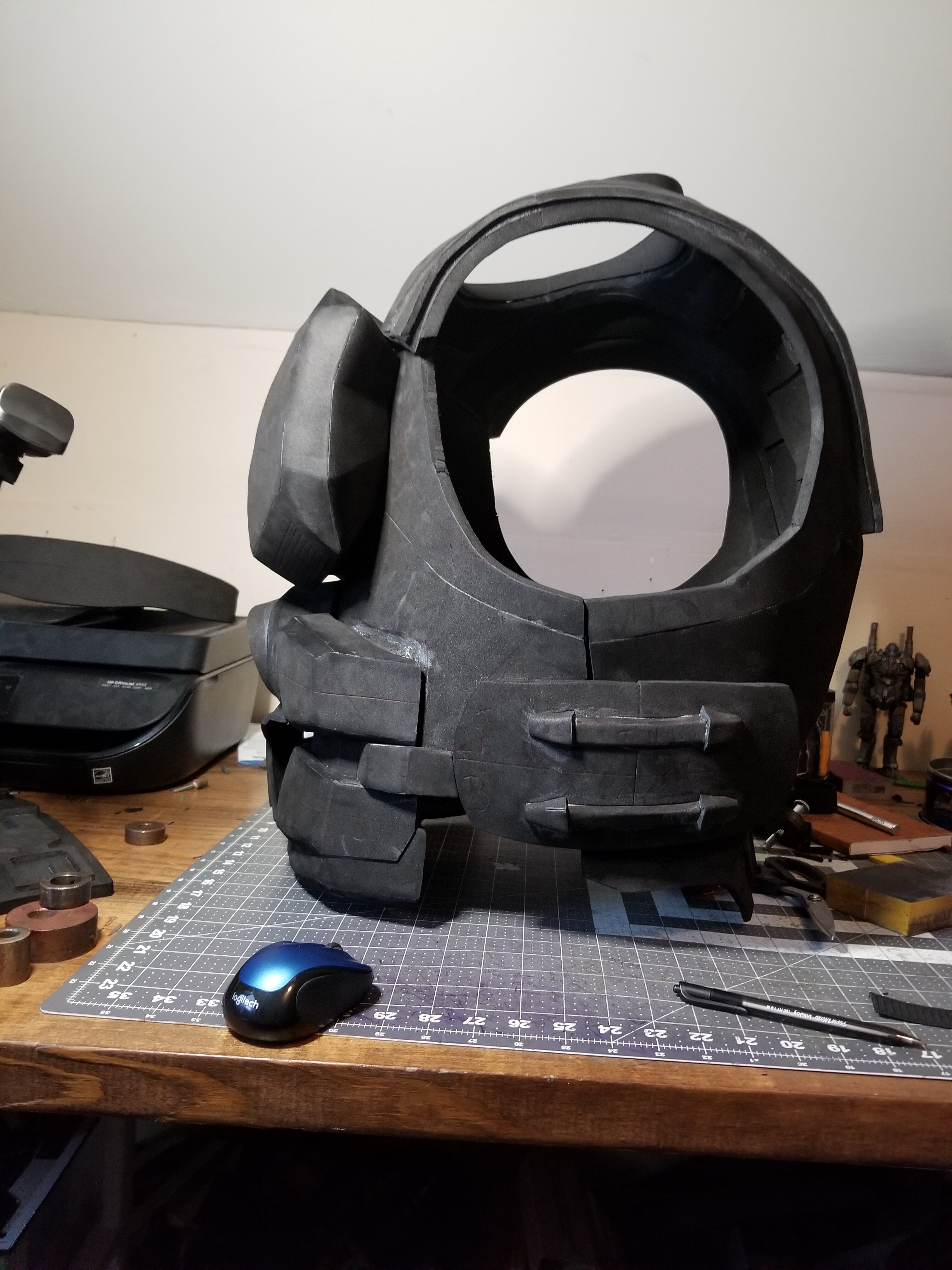 it looks like the pieces are the same size but you may have just cut the angels different. That may account for the appearance that they are different sizes.....heat it a bit w/ the hot air gun and try to coax it in to position.....other wise, its looking great!!!This is V1 of my chest plate, too thin for my taste and some how the left side is too wide and the right side is too tall, maybe I will ask Dirtdives2424 how this happened, he has loads of experience at doing that, anyway I just took a quick snapshot, I like my "scoring" job on it at least.