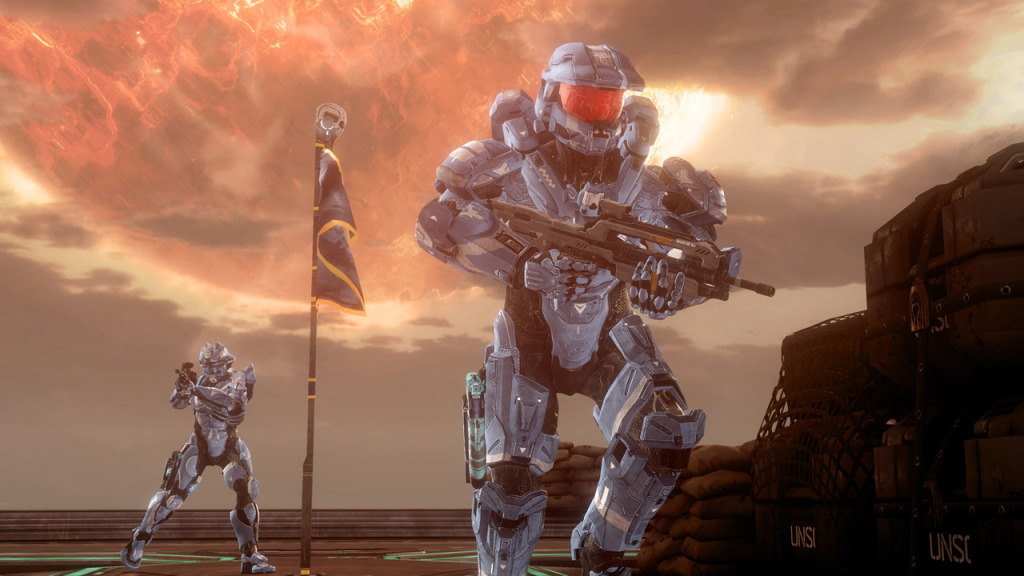 This appears to be a CTF game, with the Spartan in the foreground eqiupped with the H4-Styled Mk VI helmet, and the Spartan in the background wearing the new Raider helmet, which appears to have some eastern influence in its design aesthetic.
