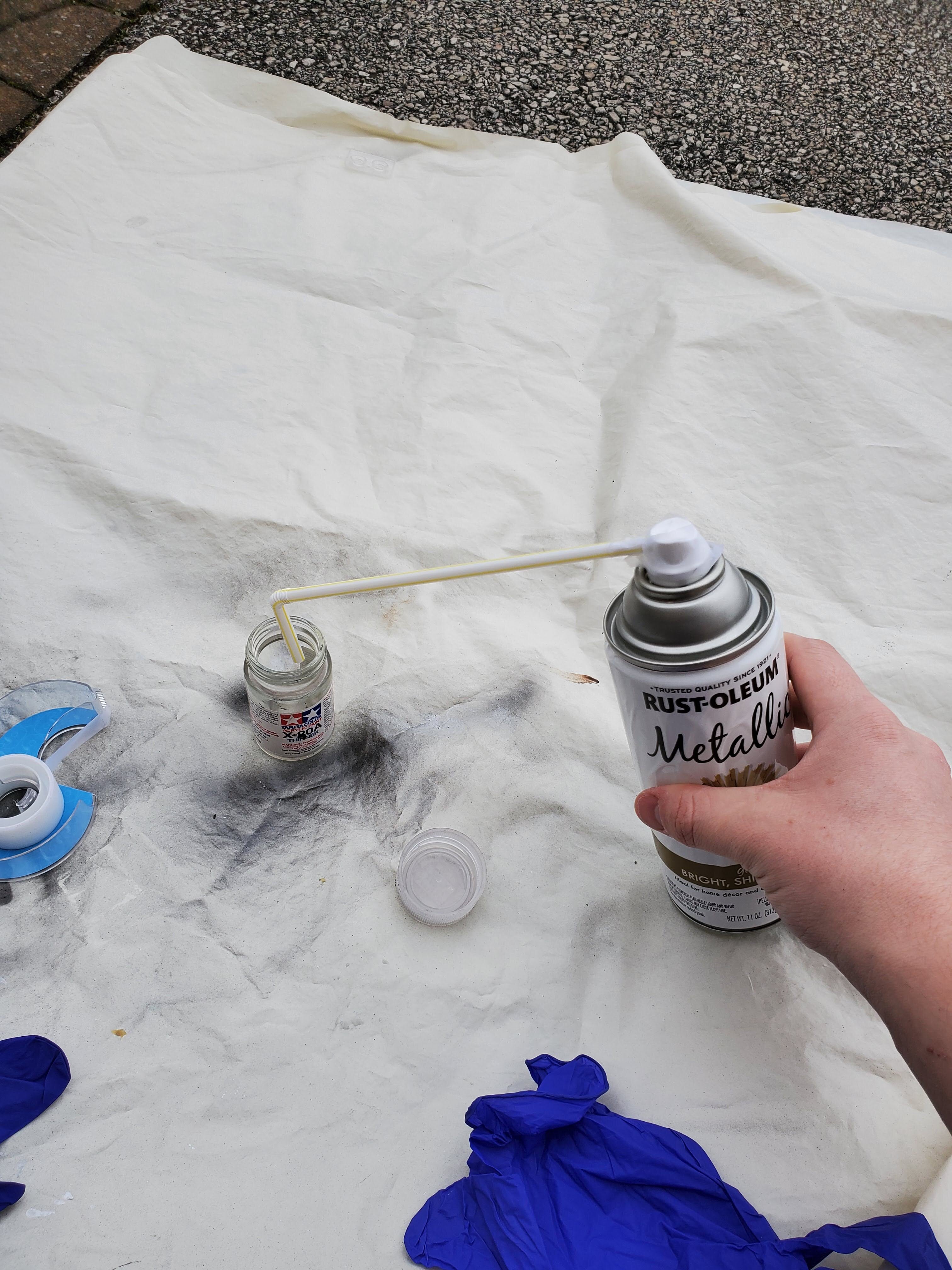 Put your gloves on and position the straw into the bottle. you will want to hold the straw tight to the can with one hand and the other depressing the top of the can. The paint will come out fast so I'd recommend taking it slow and steady while you spray. Move the end of the straw so it's not submerged in paint (this will make it bubble and messy)