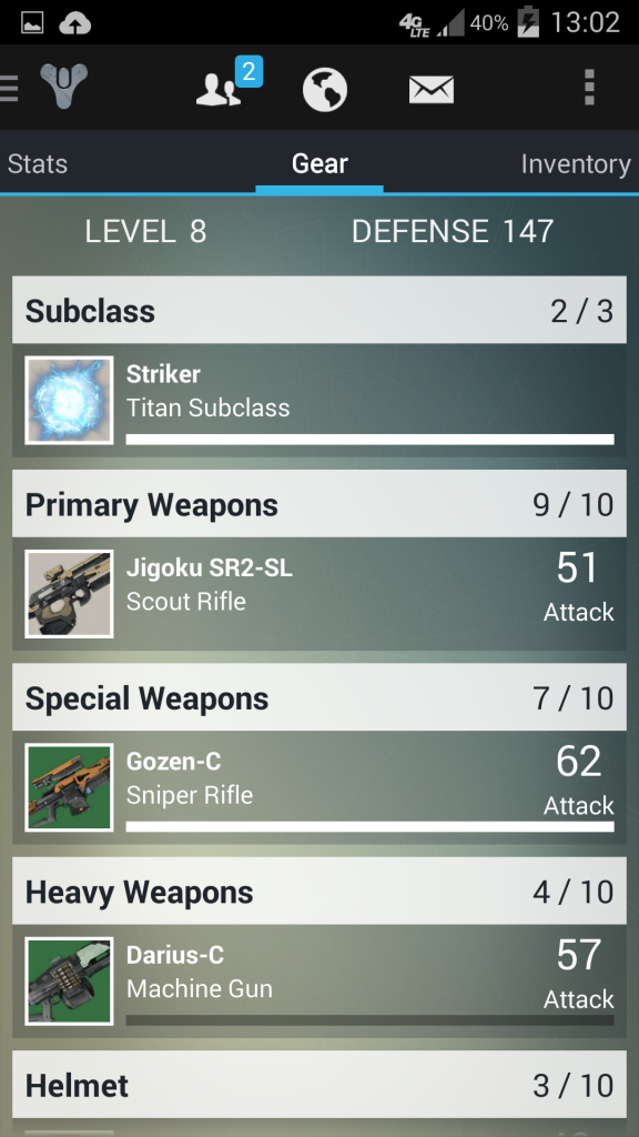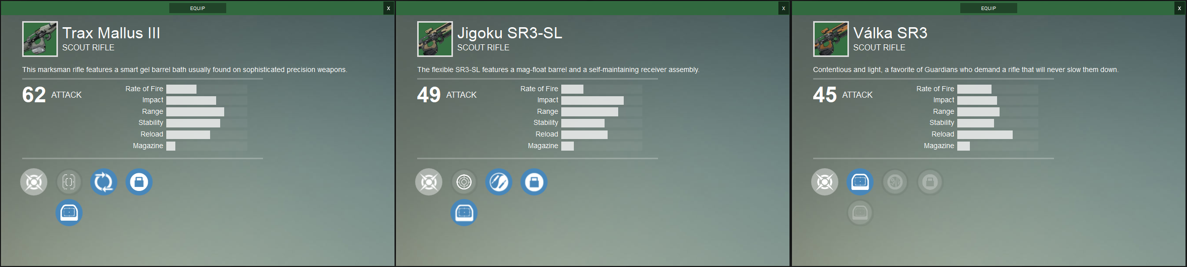 But I will say, that interestingly, I had saved a few rifles, and when I started my Hunter, at Level 2 (I think), I couldn't use my Common scout rifle that had 33 Attack, or the one that had 39, but I was actually able to use a Jigoku SR3-SL with the Red Dot-ORS1, Zen Moment (Causing Damage increases Stability), and the Damage Upgrade for 49 Attack.