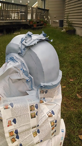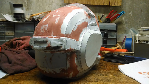 As far as my own progress goes, I sanded over my filler and put a coat of primer on. You can see rough spots where the paper got torn up from not being completely soaked with resin. These should sand off easier with the primer, though.