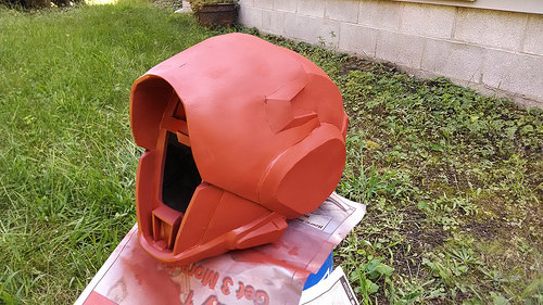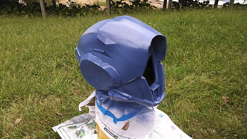 The sizing for this helmet turned out a little... disproportionate. The width seems about right, but it seems over tall and oblong. This could probably fixed by scaling along the y and z axis in Blender, but hey, that's what I get for sticking to video game proportions. I don't have any good pictures of me wearing it yet, but I should get some once I start smoothing and painting.