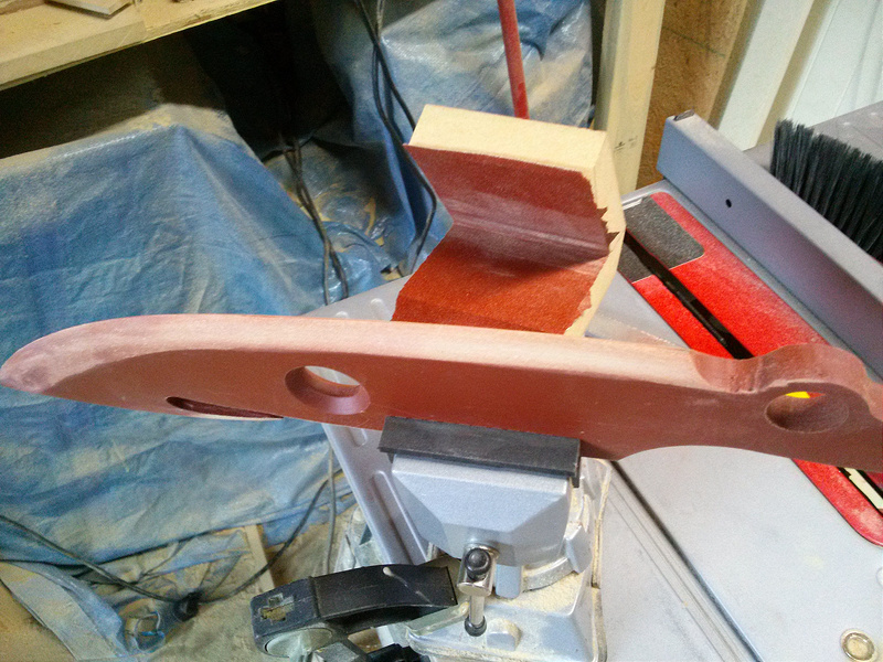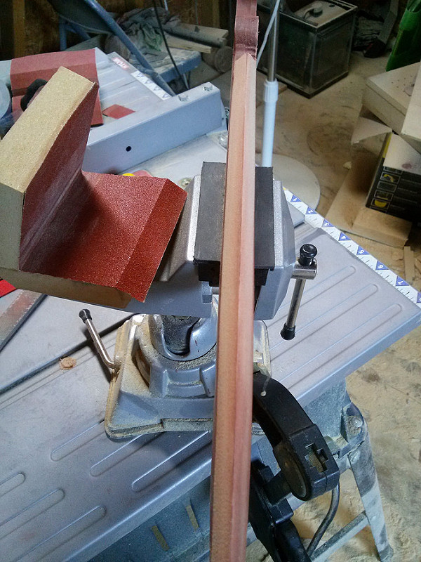 The hole in the blade was cut with a forstner bit to ensure that the hole would be perfect and the edges of the hole were beveled with a 45 degree router bit. I didn't get any before and after pictures, but I tapered the last third of the knife on my belt sander because the entire thing being 1/2" thick would just look silly. I made a custom sanding block to help keep the "sharp" parts of the blade even along both sides of the entire length of the knife.