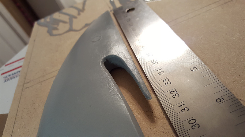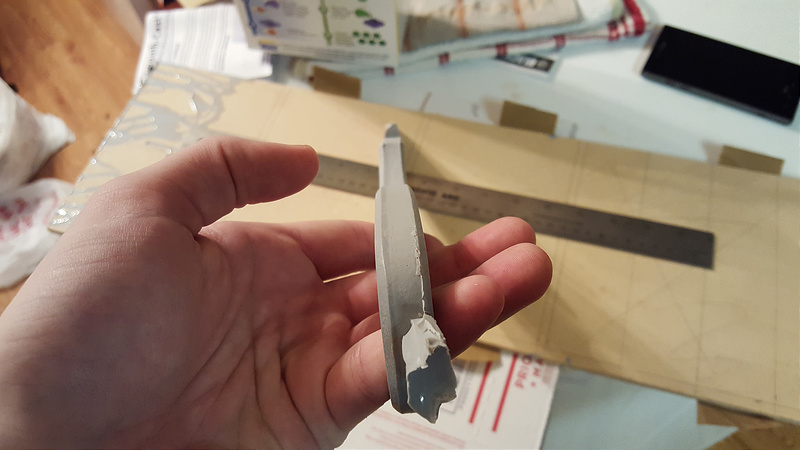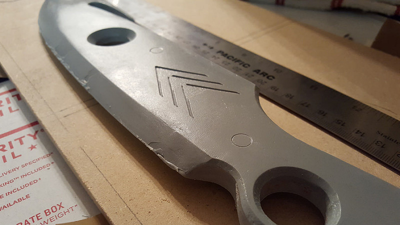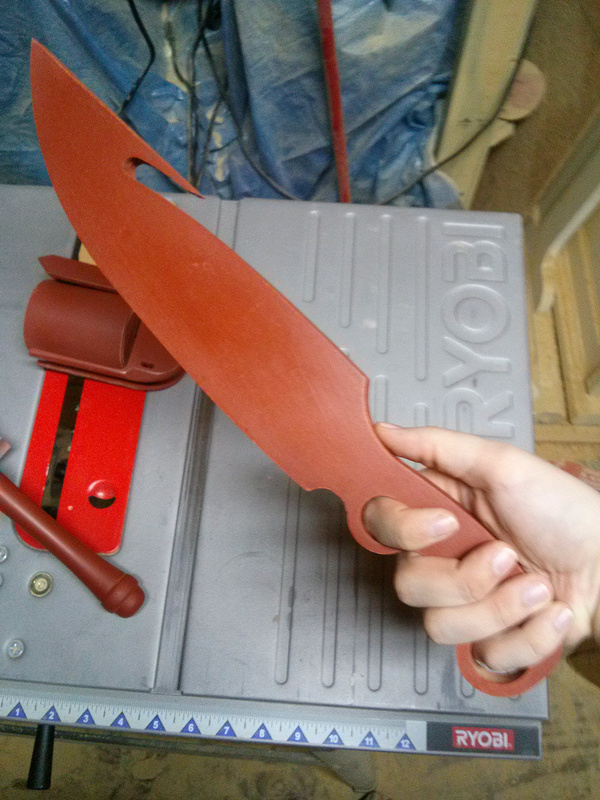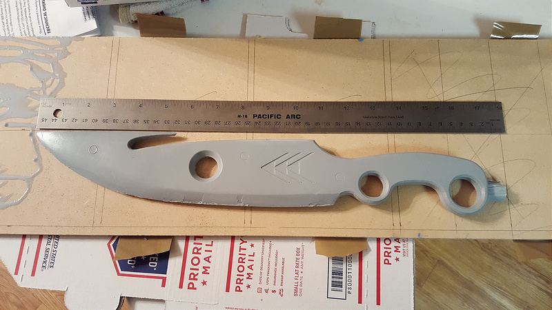 It started with drawing blueprints using the image that Bungie graciously provided that shows the knife from every angle you could possibly need. I took those and cut the basic shapes (the handle and blade were made separately) from two halves of 1/4" MDF because that's what I had lying around. Here's the first couple passes of sanding and primer.