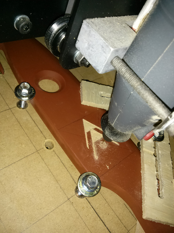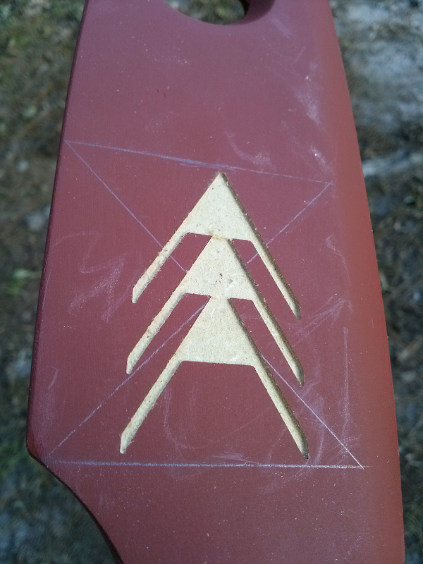 Today, it went back under the knife (Ha.) for the engraved Hunter symbol on both sides. Letting my Shapeoko have it's way with this thing that I've been working on for weeks was pretty terrifying, but both sides engraved perfectly. Very little cleanup is needed because the primer acted as masking layer, which eliminated the MDF fuzz.