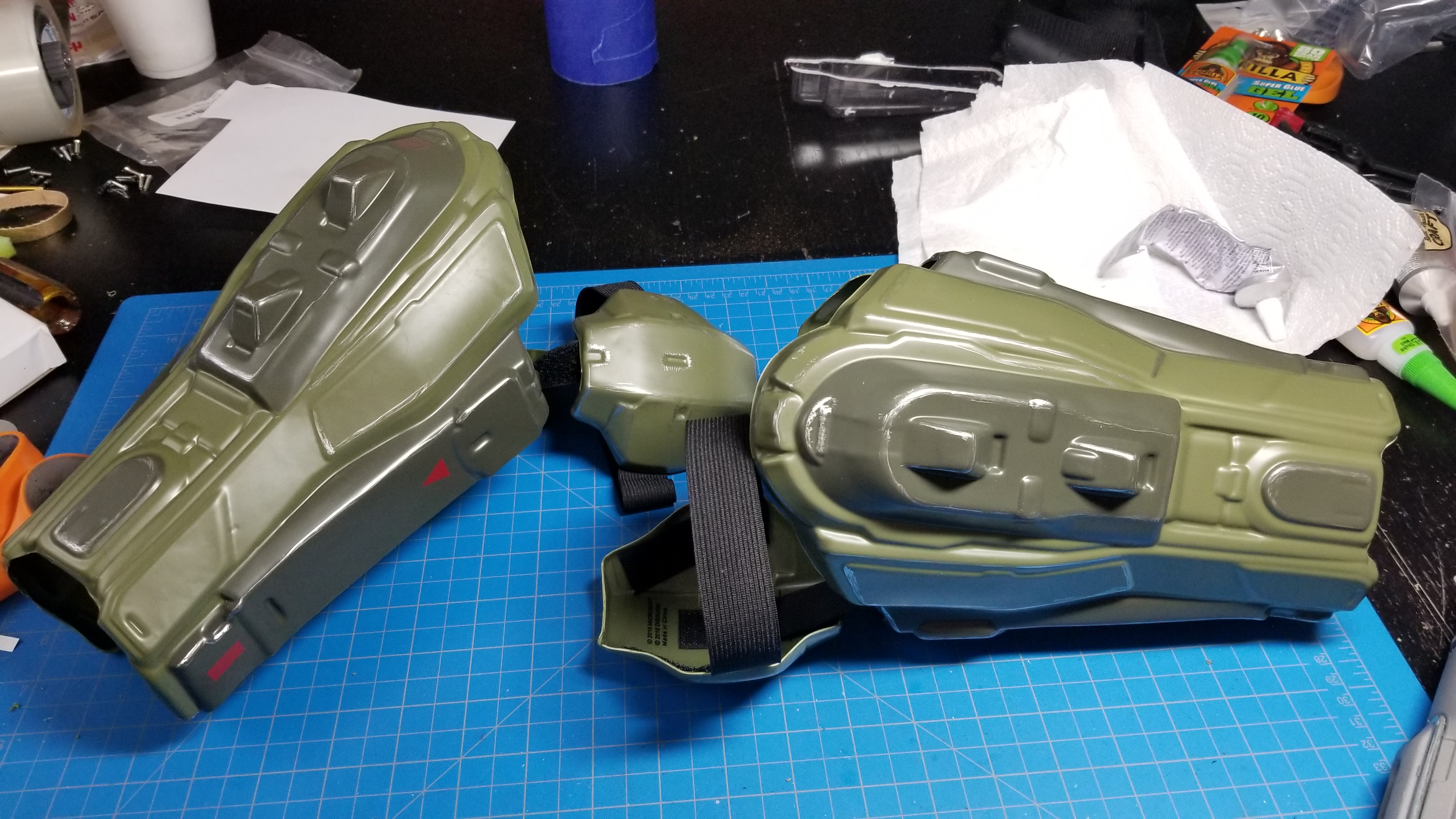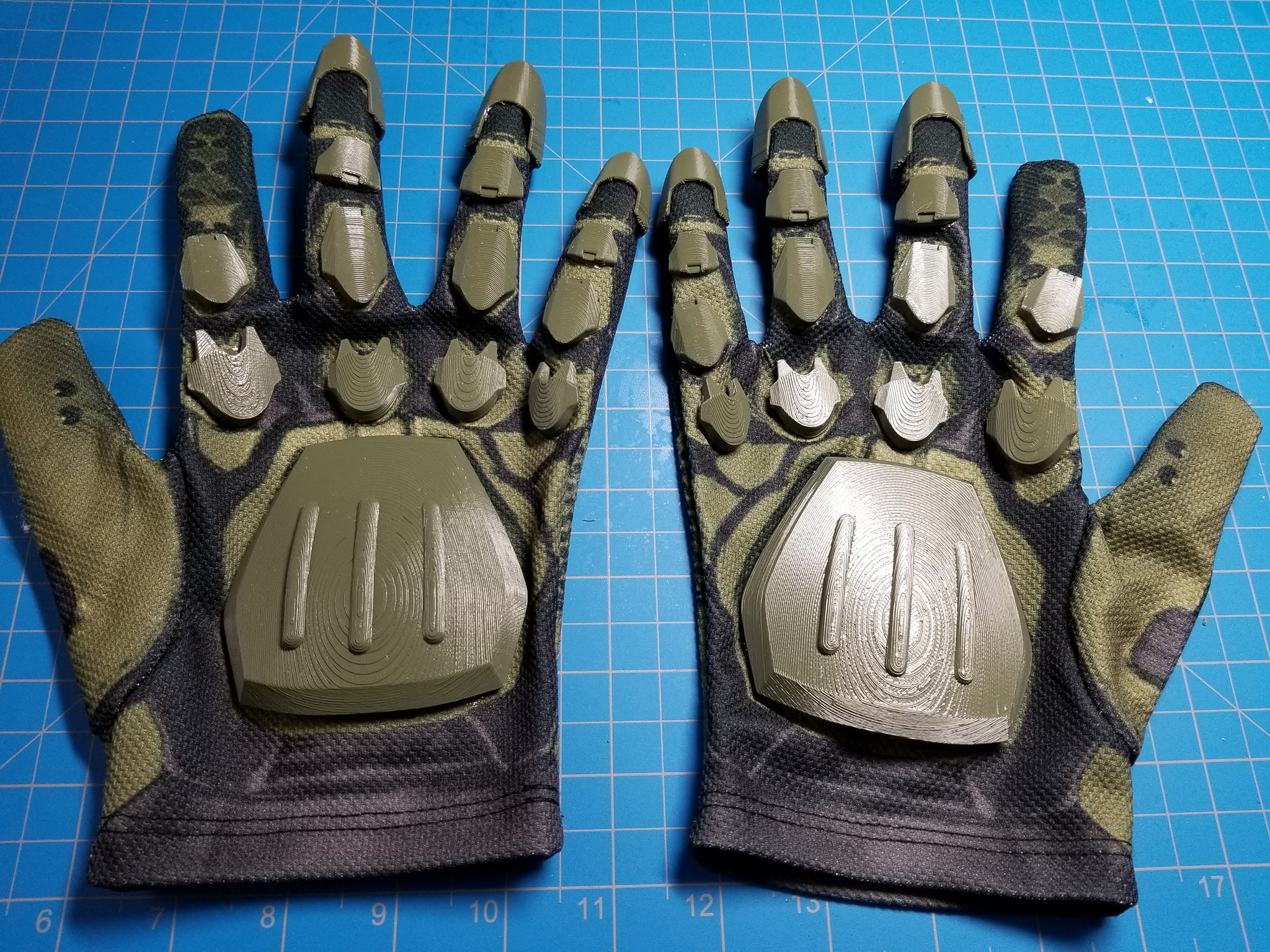 The gloves were a bit hokey looking, but good enough to reuse. The material's texture or weave was great for E6000 application, and the screen printing (or whatever method they used), was great as a template to adhere 3D printed plates to. This could have been done with eva foam as well if you don't have a printer. Thanks to the forum here for the files.