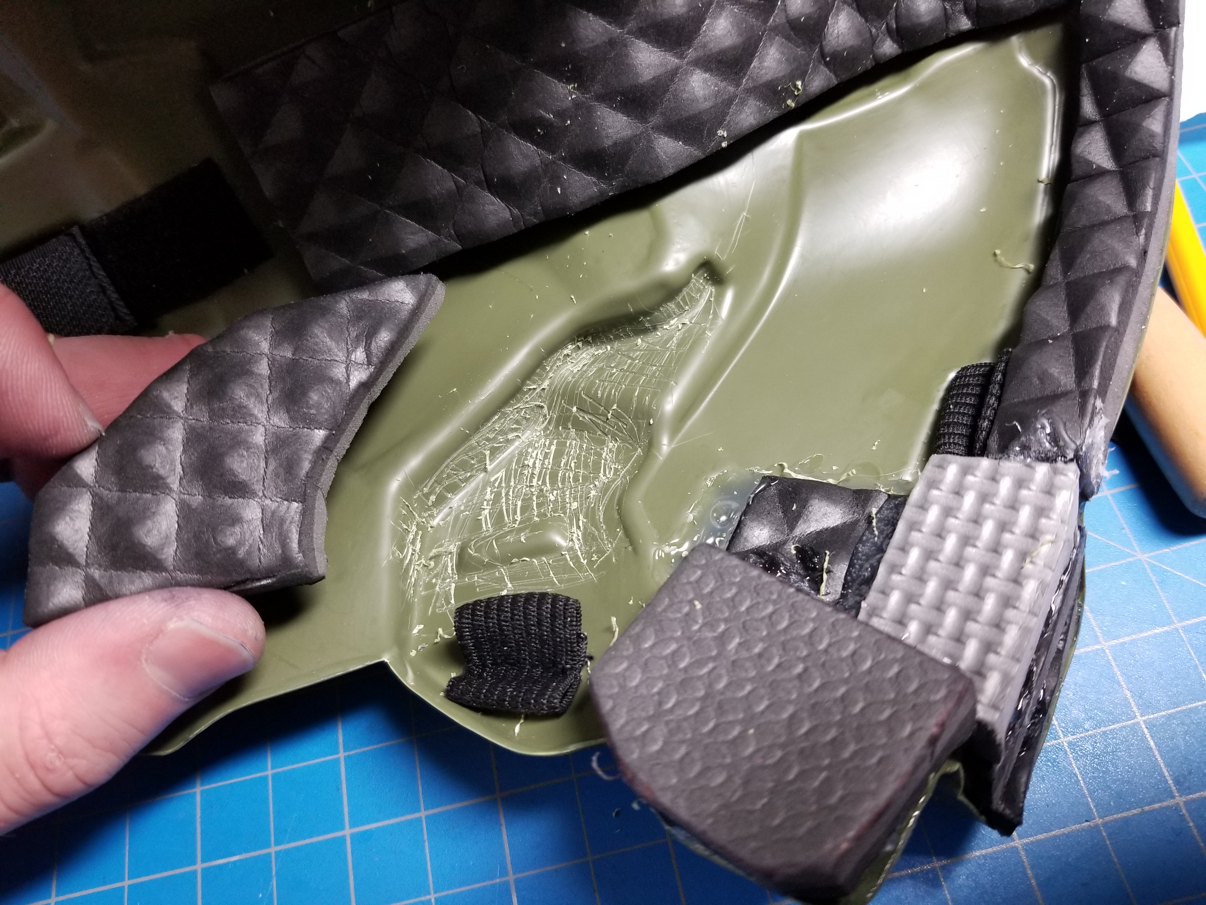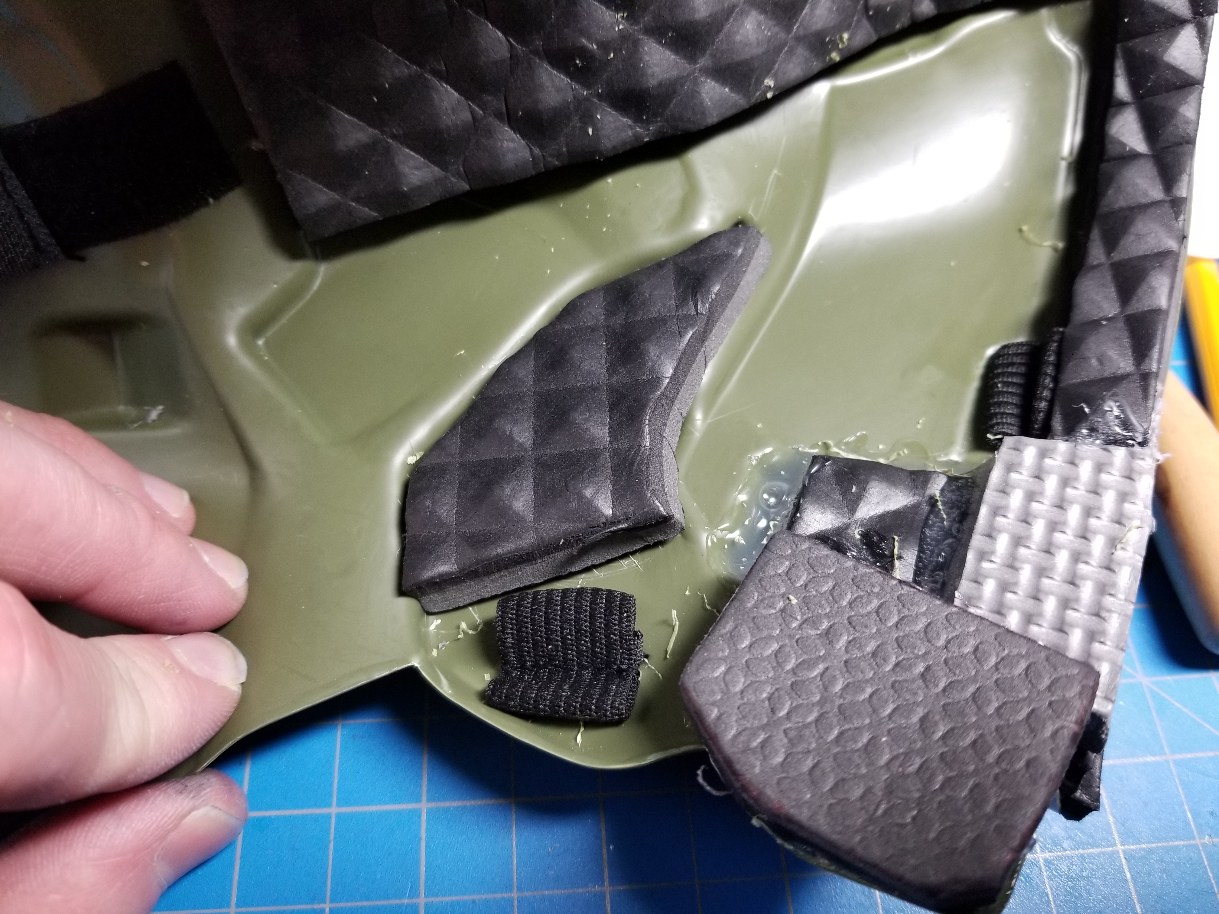 I forgot to take a picture of the next part, so I'll try describing it the best I can. Using E6000, I traced around the edge of the area, not everywhere I scored, just where I expected to put the eva foam or strap. Immediately after, laid down hot glue in the middle.