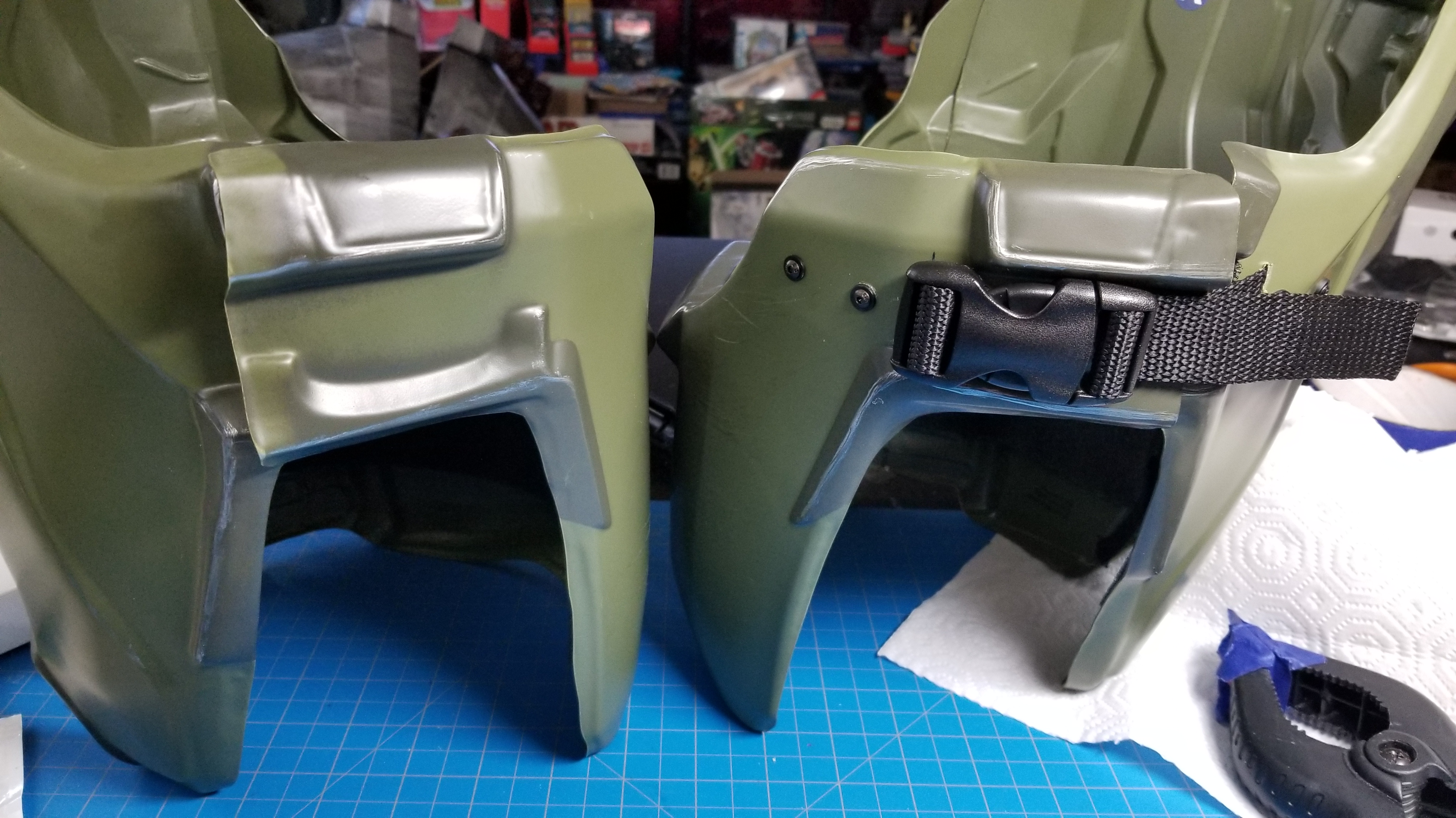Next post will cover the hip plates. BUT, before that, real fast. The only thing I wanted to upgrade on the shins are the little top sections. They should be black. They are already an even darker green Disguise used, but its really hard to tell its different from the darker green the used around it and most of the suit. So, I just airbrushed them black and it pops now. Left is painted.