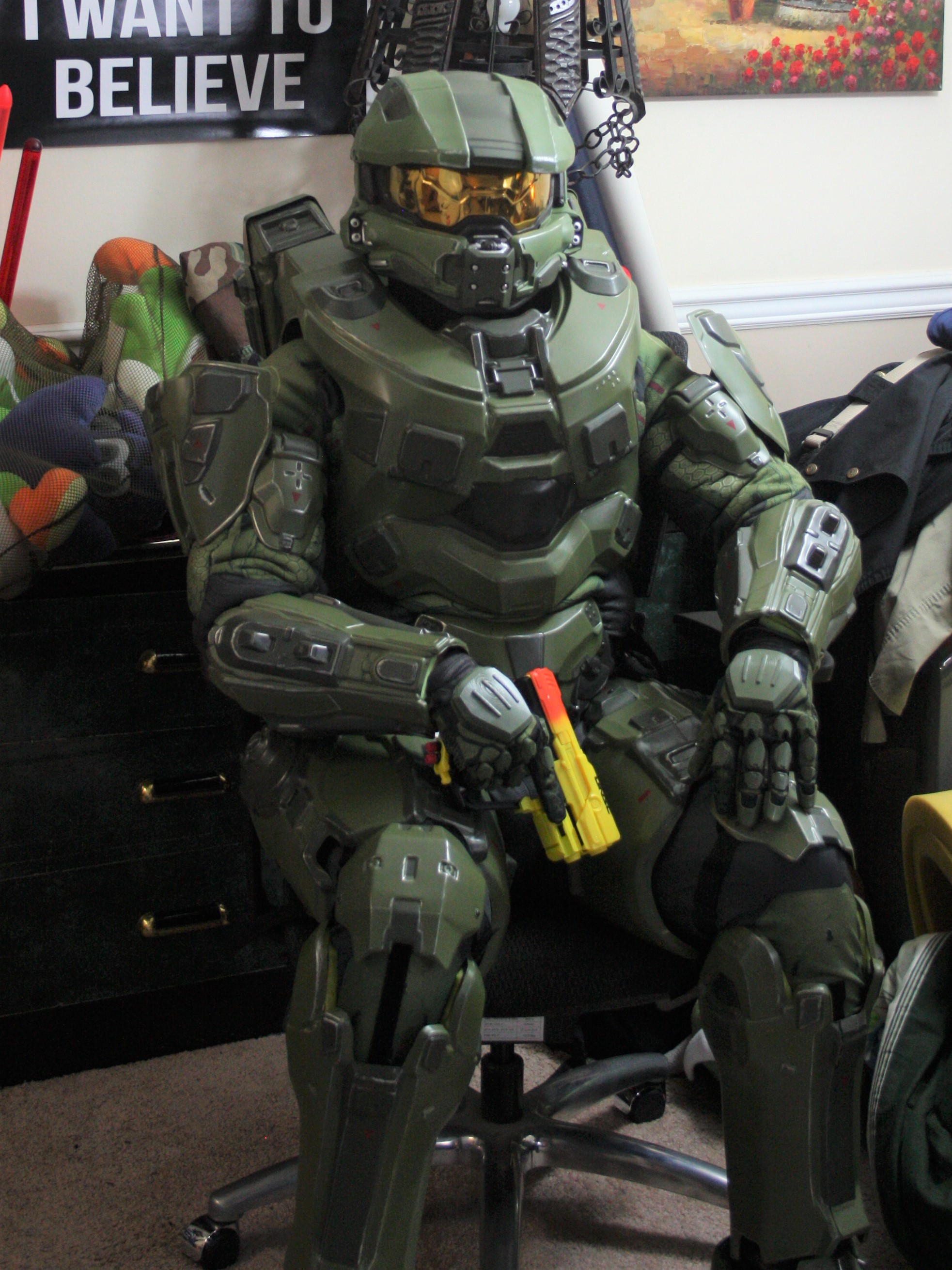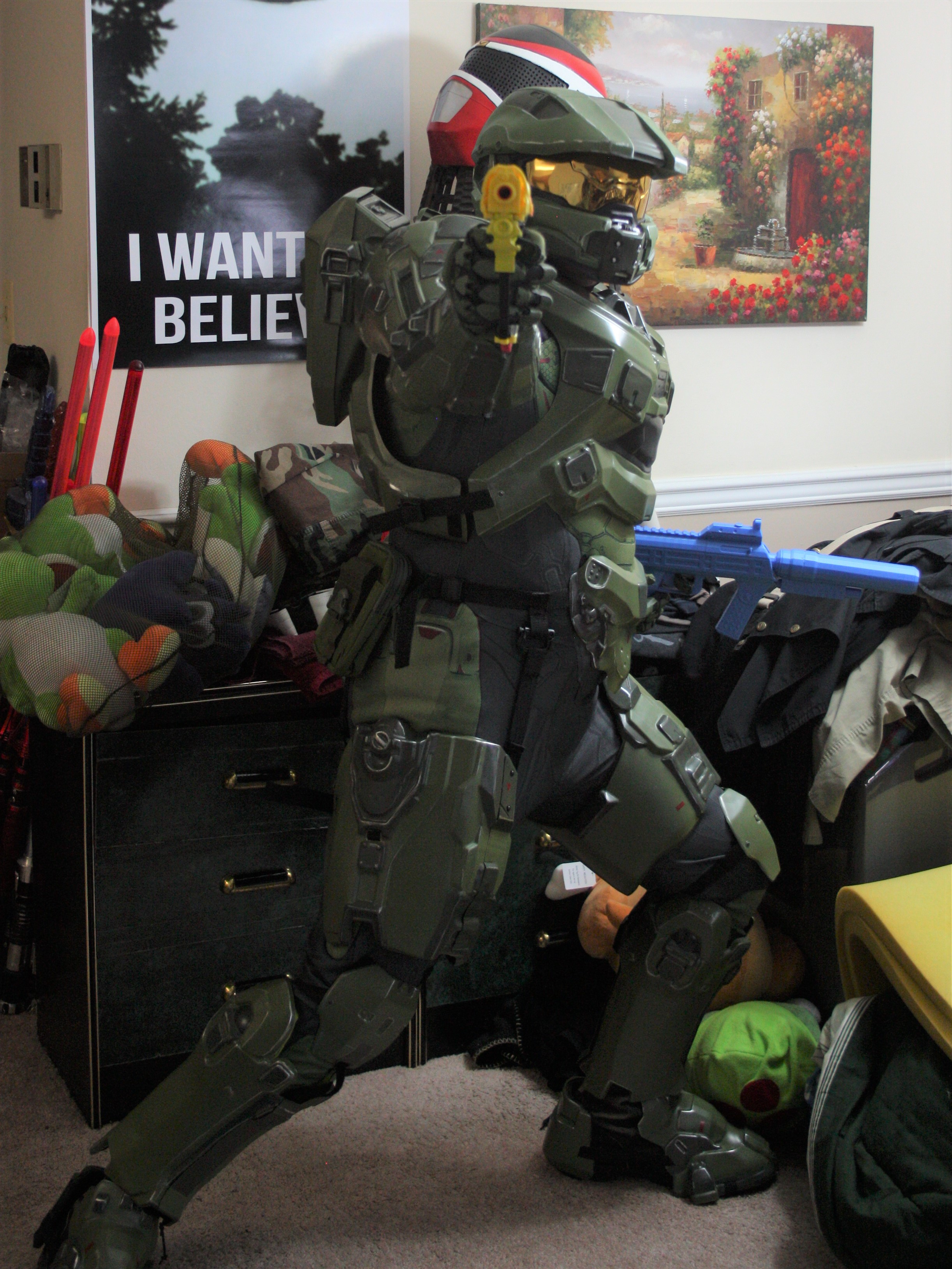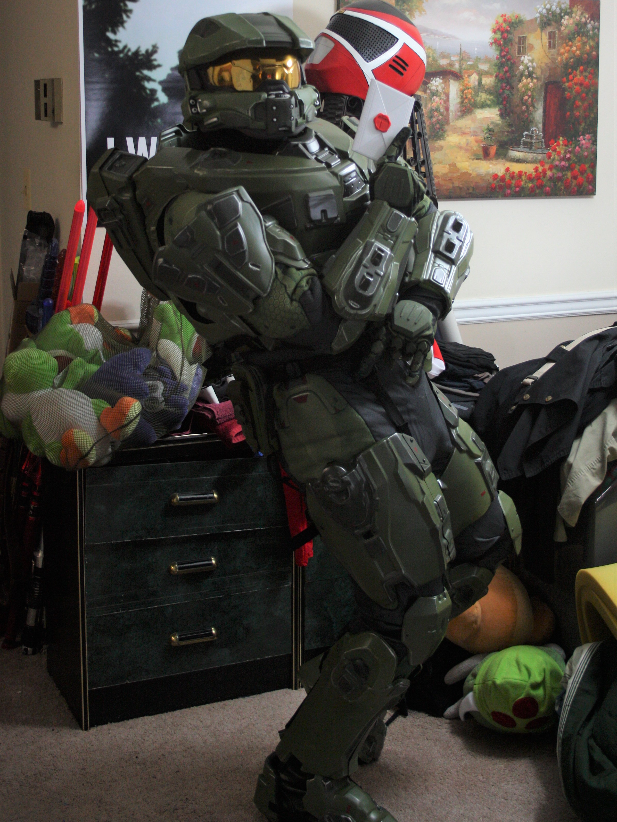 Test run time! It went great. Needs a bit of adjustment here and there, and may need a tad bit of second hand help (like securing the bottom torso), but I wore it around the apartment for a hour and two, doing a bunch of things with it. Sitting, running, kicking, punching, swinging lightsabers, crouching, etc with little problems. I'm still afraid to go prone in it or down on one knee, but its not like Master Chief does that in the games.