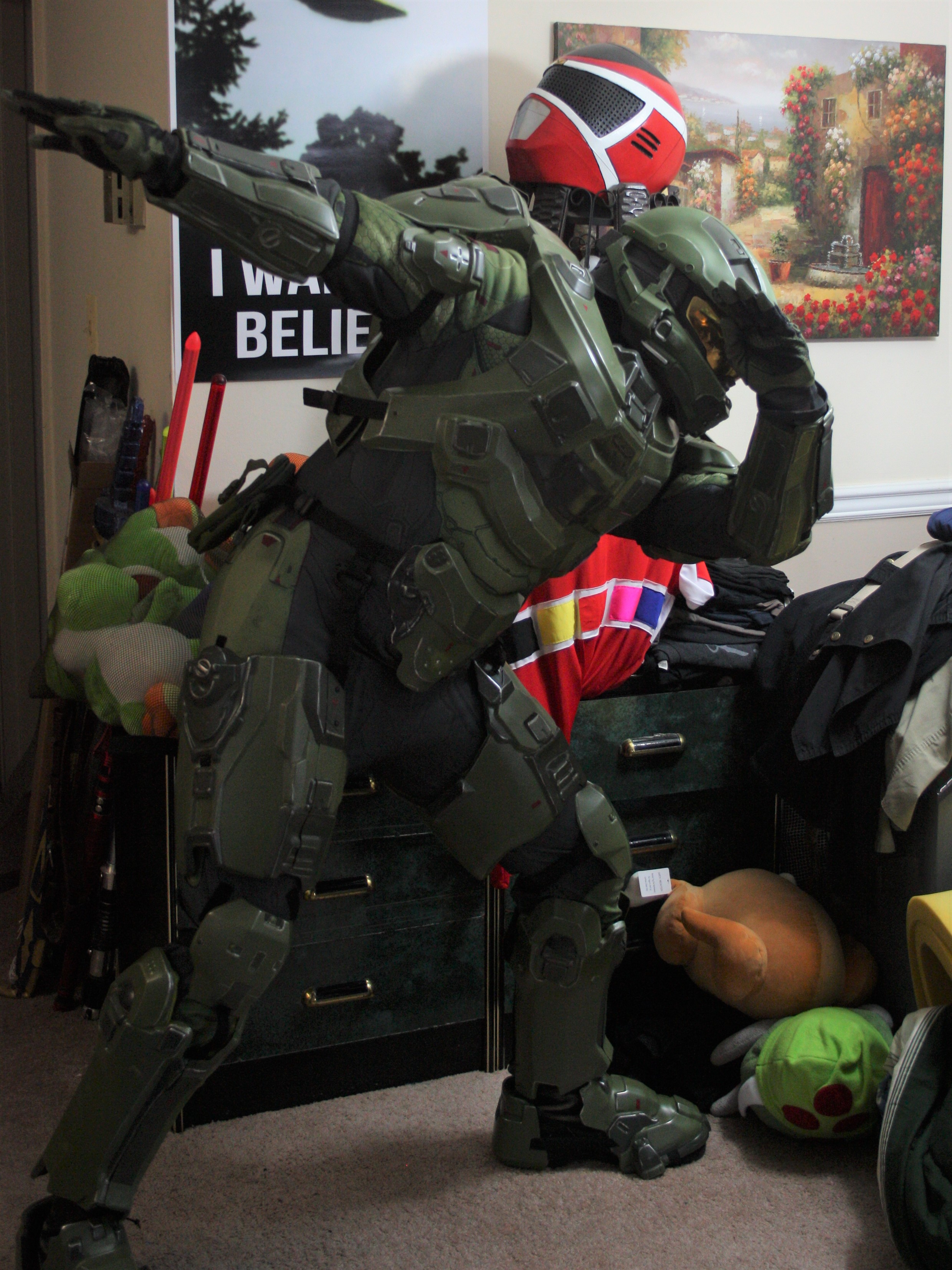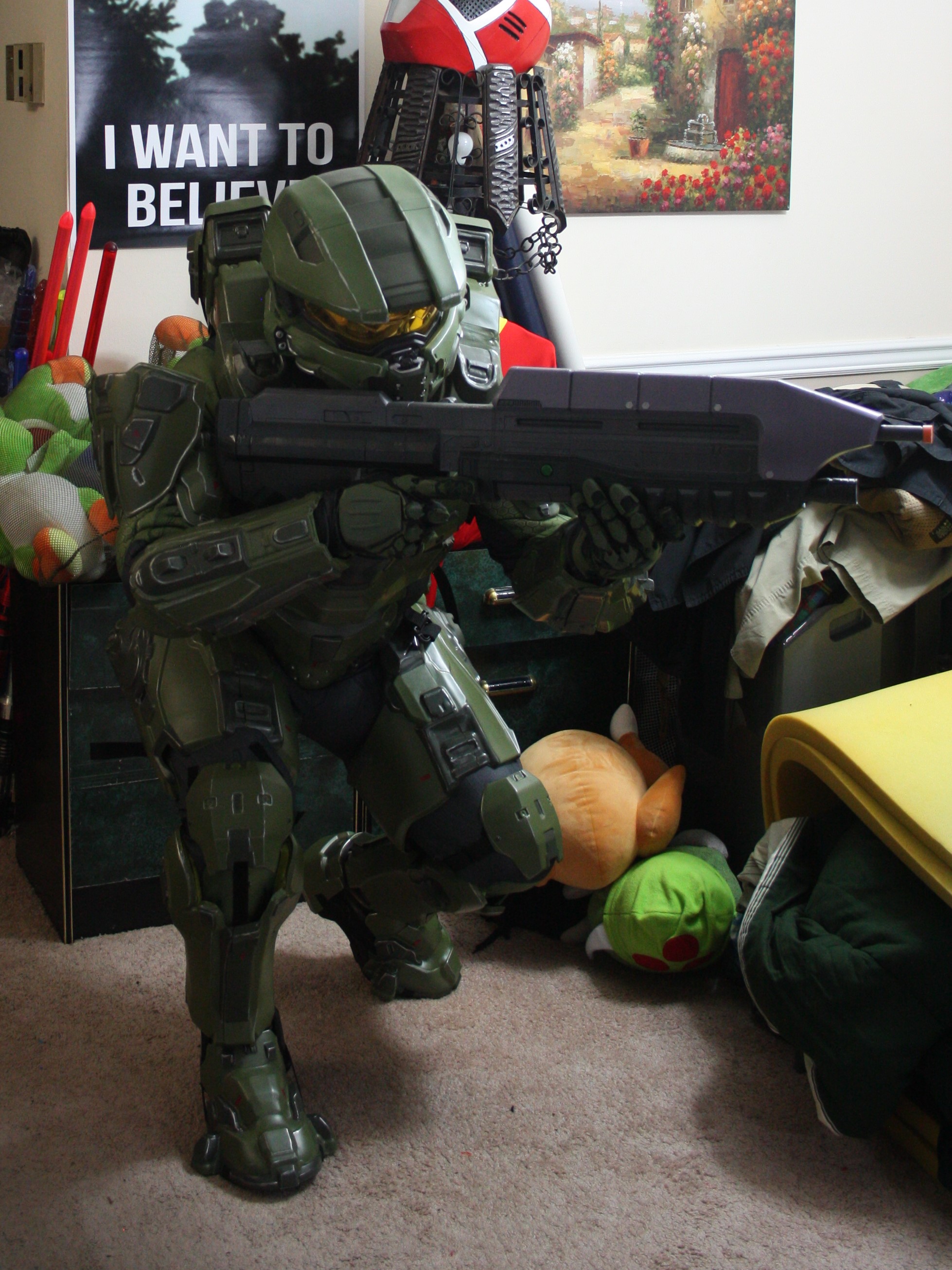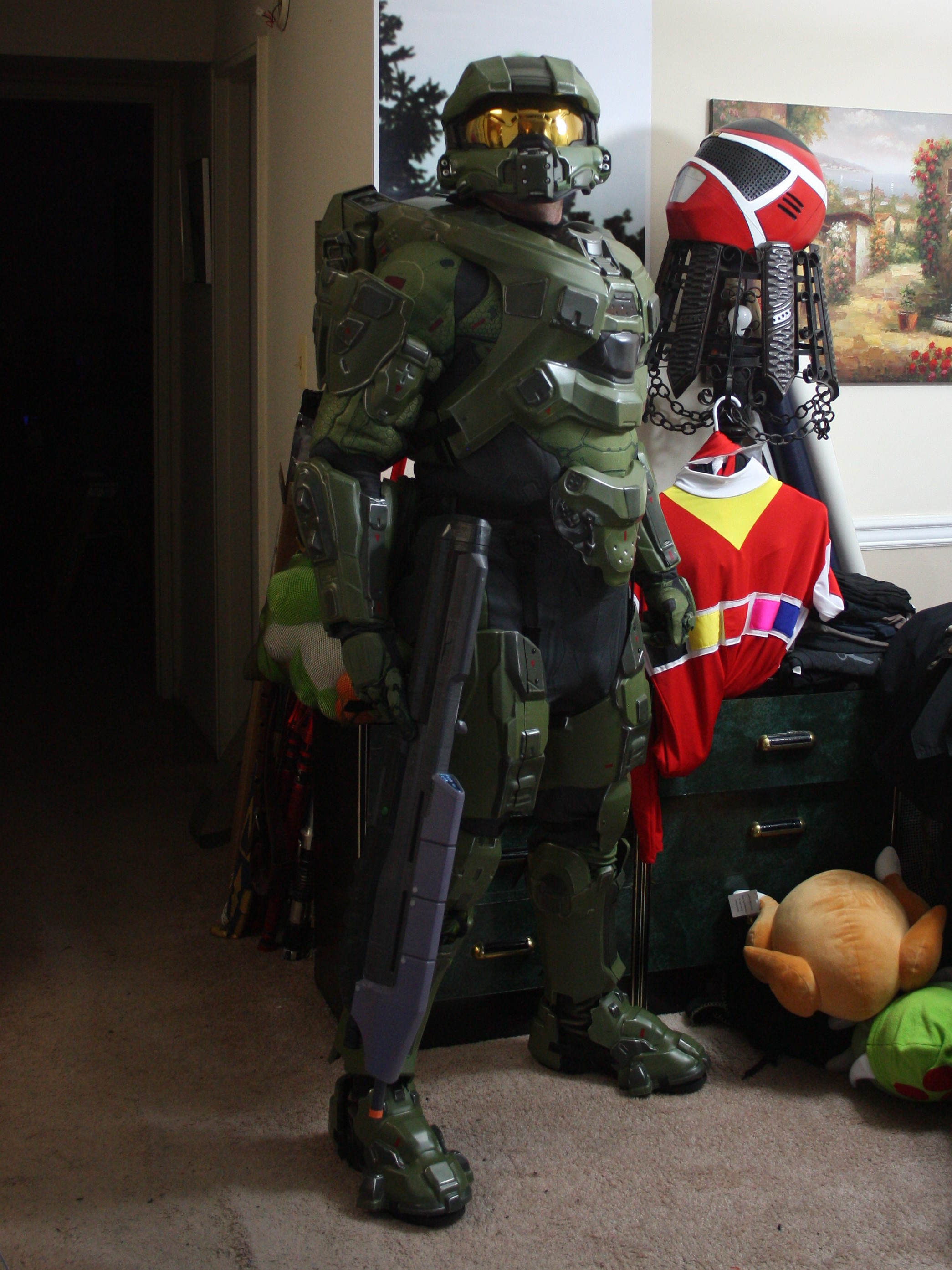 Test run time! It went great. Needs a bit of adjustment here and there, and may need a tad bit of second hand help (like securing the bottom torso), but I wore it around the apartment for a hour and two, doing a bunch of things with it. Sitting, running, kicking, punching, swinging lightsabers, crouching, etc with little problems. I'm still afraid to go prone in it or down on one knee, but its not like Master Chief does that in the games.
