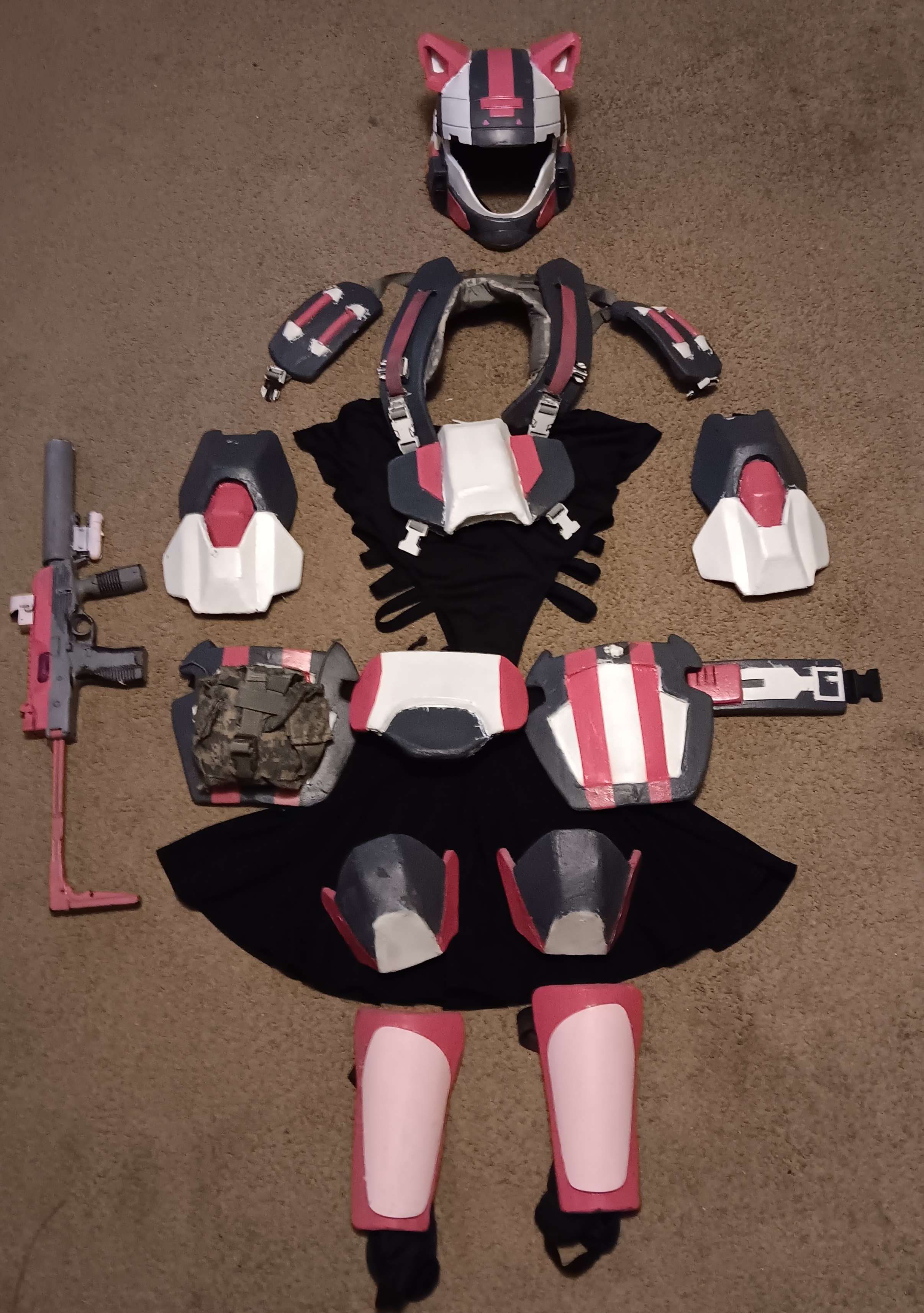 This is a cosplay I made called femboy odst. The armor bits are all foam but I minimized the overall armor. The chest itself works more like a h-harness then a chest rig. The pink and white color combined with the skirt and cat ears give it a cute touch it needed to be fabulous. Hope you all enjoy this as much as i do lol