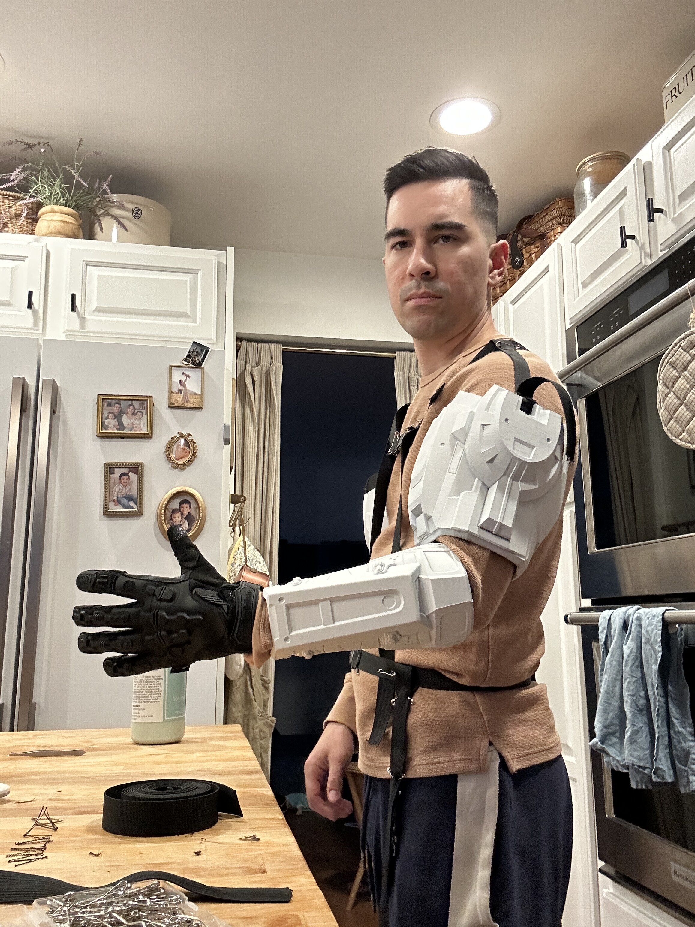 Sharing what I’m working on with the bicep harness. I’m using an elastic V to provide ample flexibility and also pull it back to a neutral position on the side. I’ll add an elastic band inside around my bicep and Tri-rings to the shoulder elastic for height adjustment.