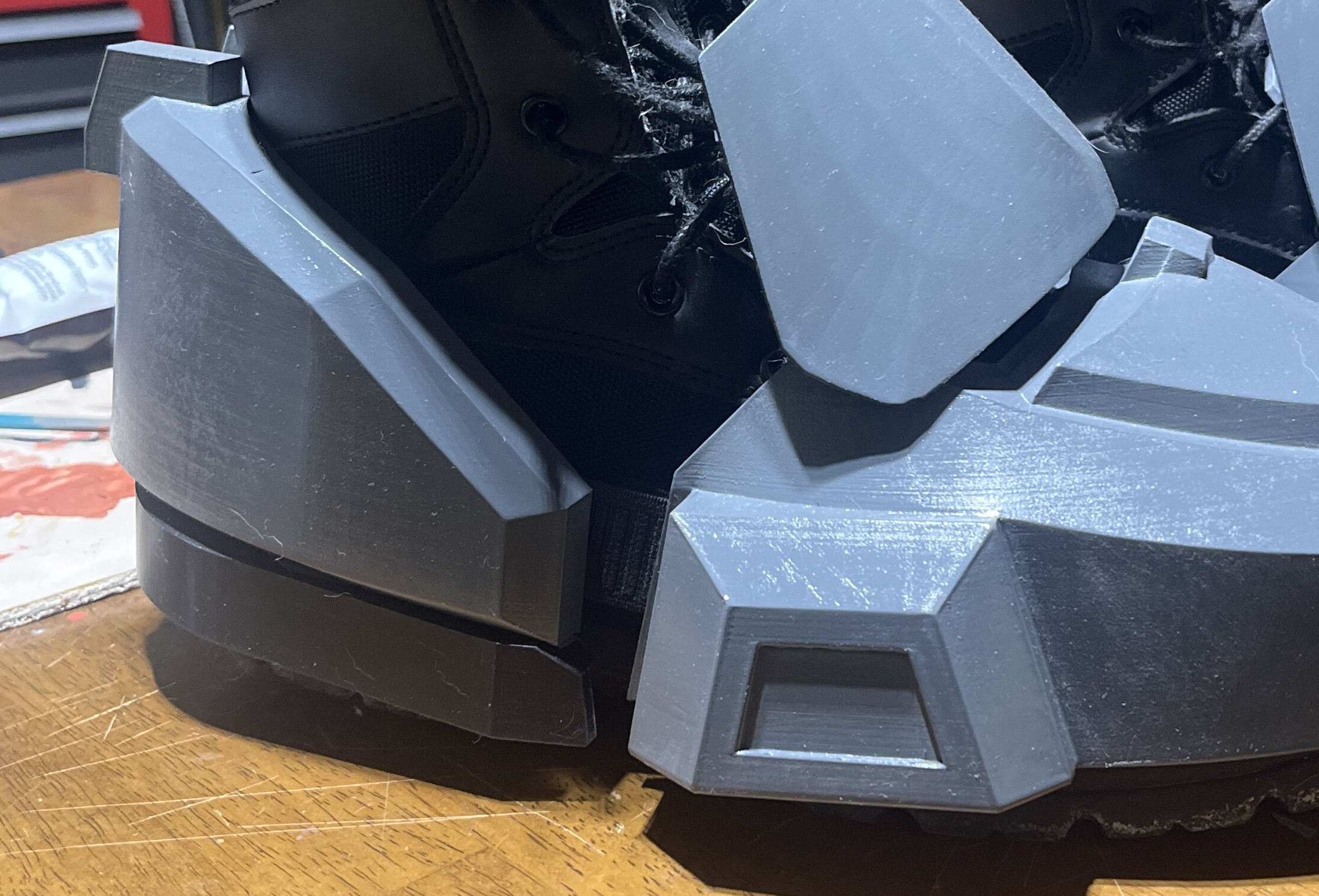 As for the boots... are you wearing actual boots underneath or more of an athletic shoe? I built mine in front and back pieces similar to how it appears you printed yours. I simply attached the front to the back via some 1 inch elastic straps so it can stretch over the top of my footwear. You can slightly see it in this picture between the boot pieces. This might be an option for you.