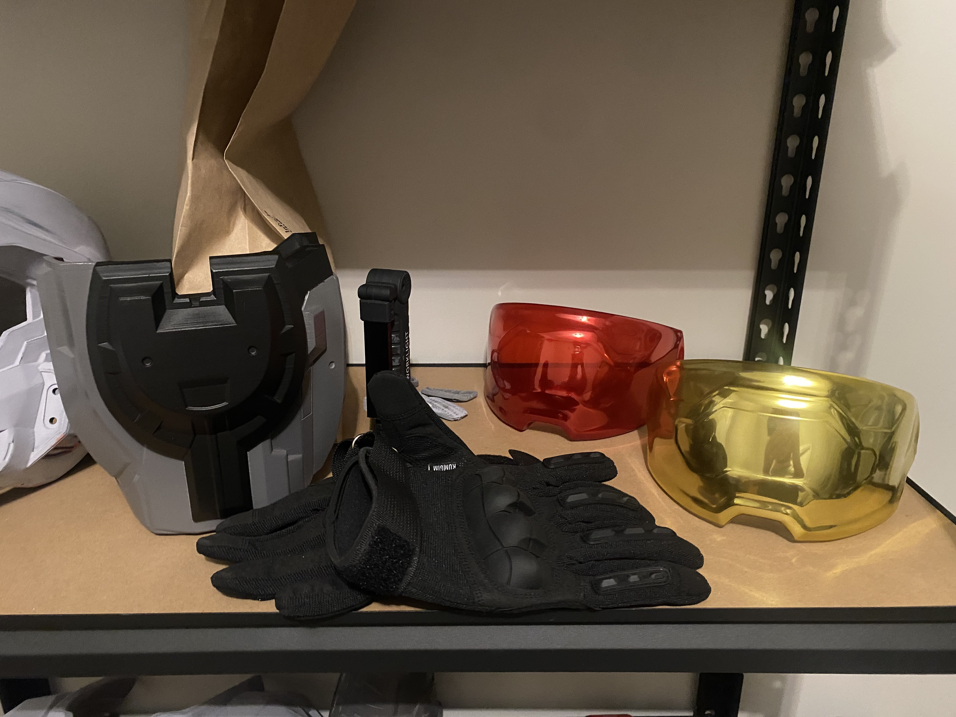 I ordered a Red Chief Visor from Galactic Armory since I used their files for the helmet. They mistakenly sent me a gold one and were nice enough to let me keep it and send me the correct red one. Im a little worried about the transparency of the red visor but i think it will be better once in the finished helmet. worst case scenario I use the gold one instead or just figure out how to chrome it more myself. The gloves I will be using are pictured below with the visors and bicep armor piece.