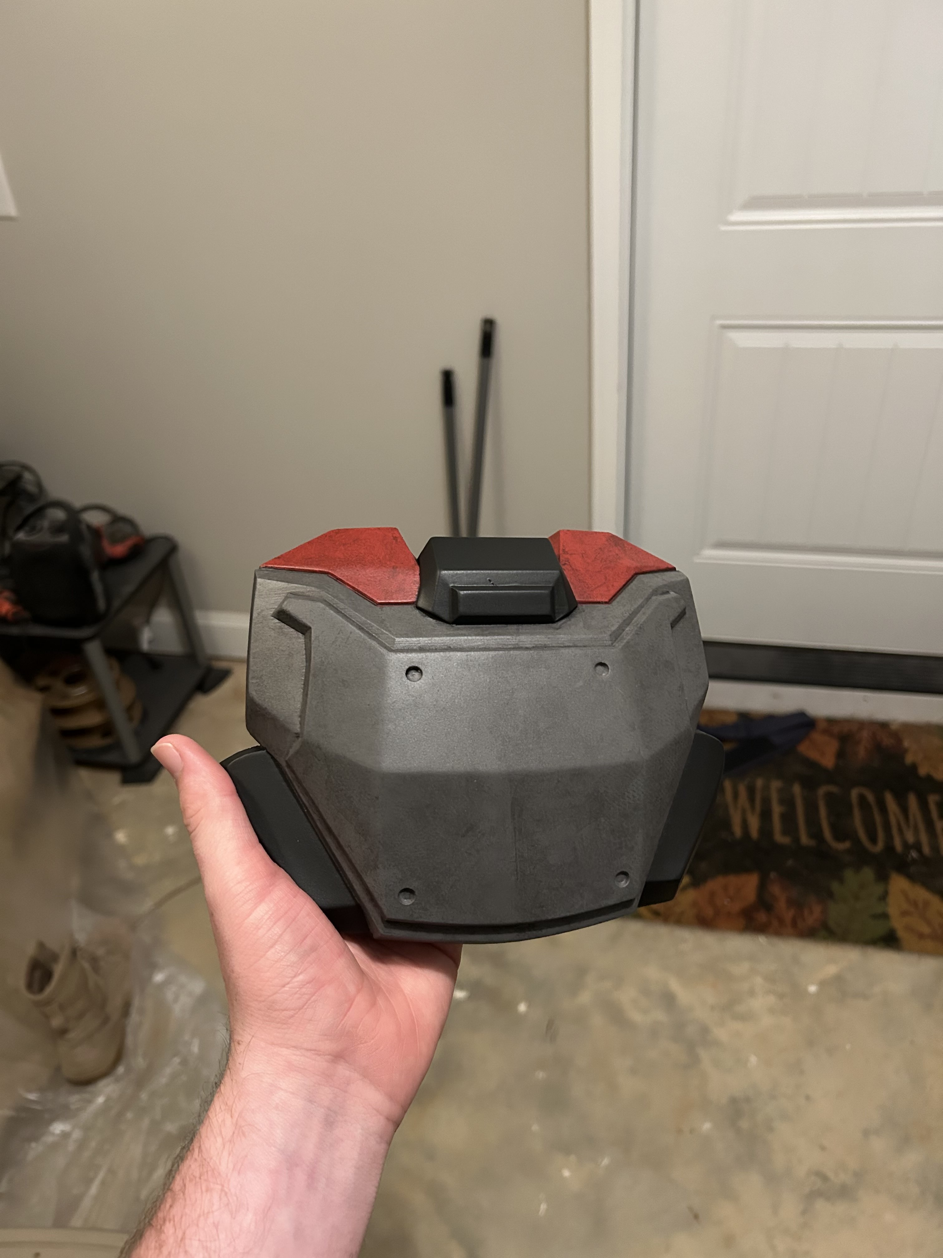 While putting the final piece of foam in the helmet... Im talking the LAST 30 seconds of this 220 hour project... I dropped it while it was covered in fresh hot glue directly onto my hand. Out of reflex I grabbed at it with my other hand and dropped the helmet. This gave it a crack on the front top portion of the helmet and burned both of my hands pretty bad in the process. Im all good now and was honestly more upset that I dropped the helmet than anything. I tried to fix it by hitting it with gray spray paint and then turning it into a large silver scratch. I think it sticks out but others think it looks fine. I guess im my own worst critic. At least now I can say I put blood, sweat, and tears into this thing and I have actual battle damage.