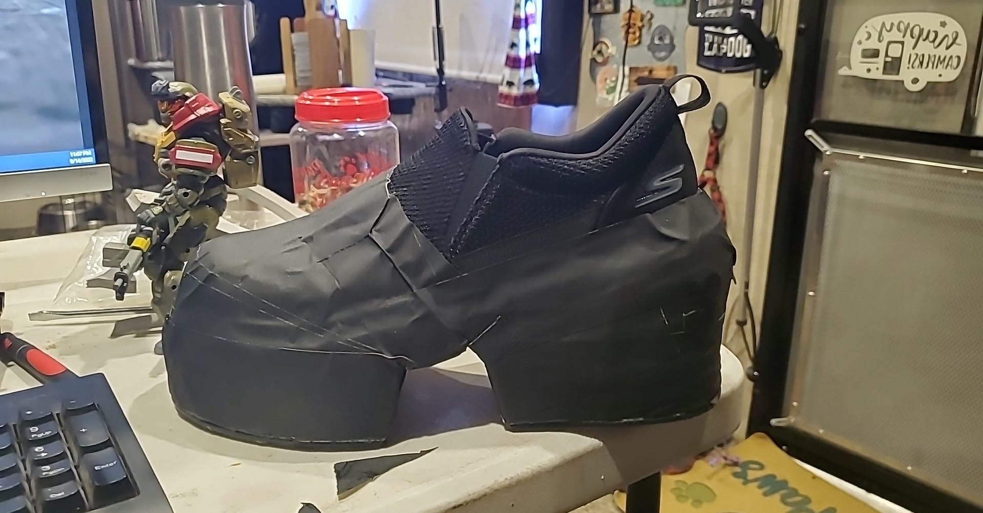 So the gaff tape I ordered didn't hold for long. I ended up scrapping the tape. Ever gap between the shoe and the foam platform was filled with hot glue. It had a great bond and was really strong when I tried to pull it off. So I pulled all the gaff tape off, re-cemented the rubber soles directly to the foam. See "Lessons Learned" in my original edited post.duct/gaff tape for the win...