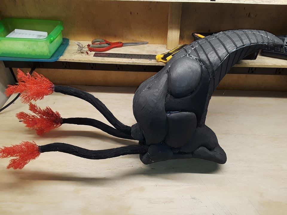 Made with eva foam, hand drew my own templates from the reference pic below. Legs and tentacles are foam dowels with coat hanger wire inside and plastic fish plants for the feelers. After dremmeling all the texture I then filled the hollow inside with expanding foam for rigidity so now this boi is DENSE. I can kick it around and pass it off to people at cons for pictures and don’t have to worry, even made a custom cardboard shroud for an rc car for it to go on when I went on stage for a cosplay contest!