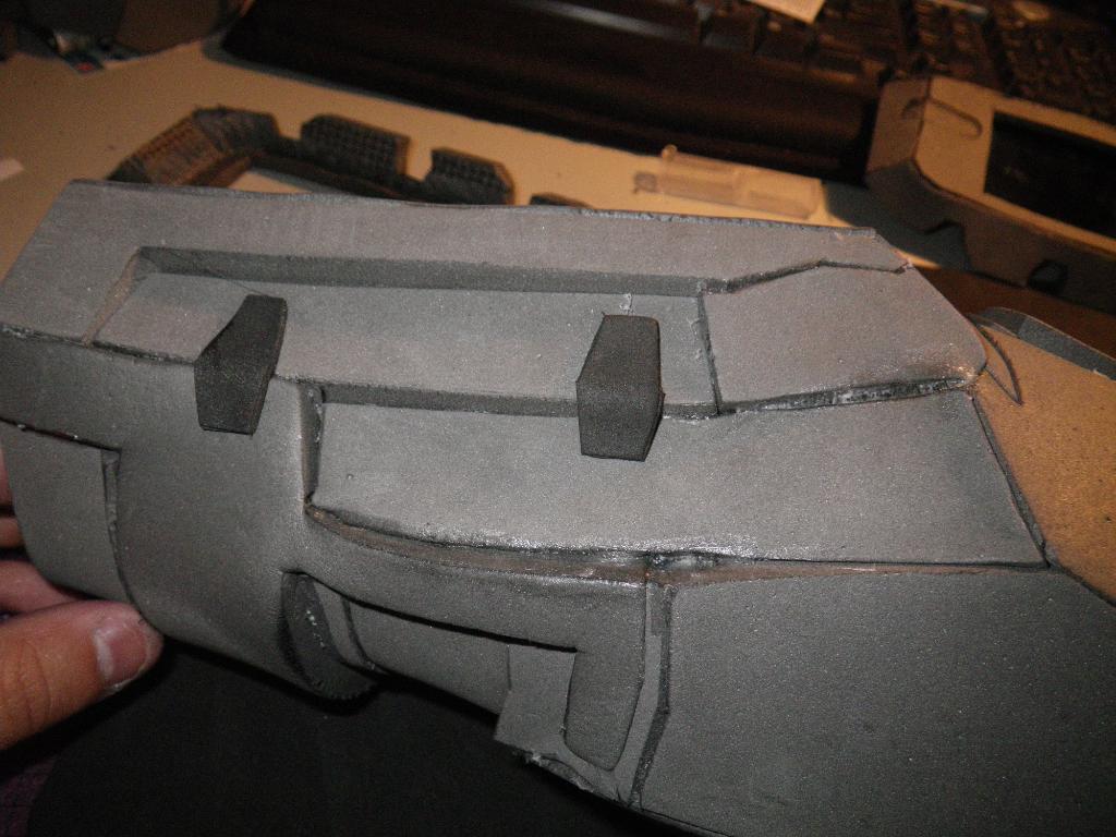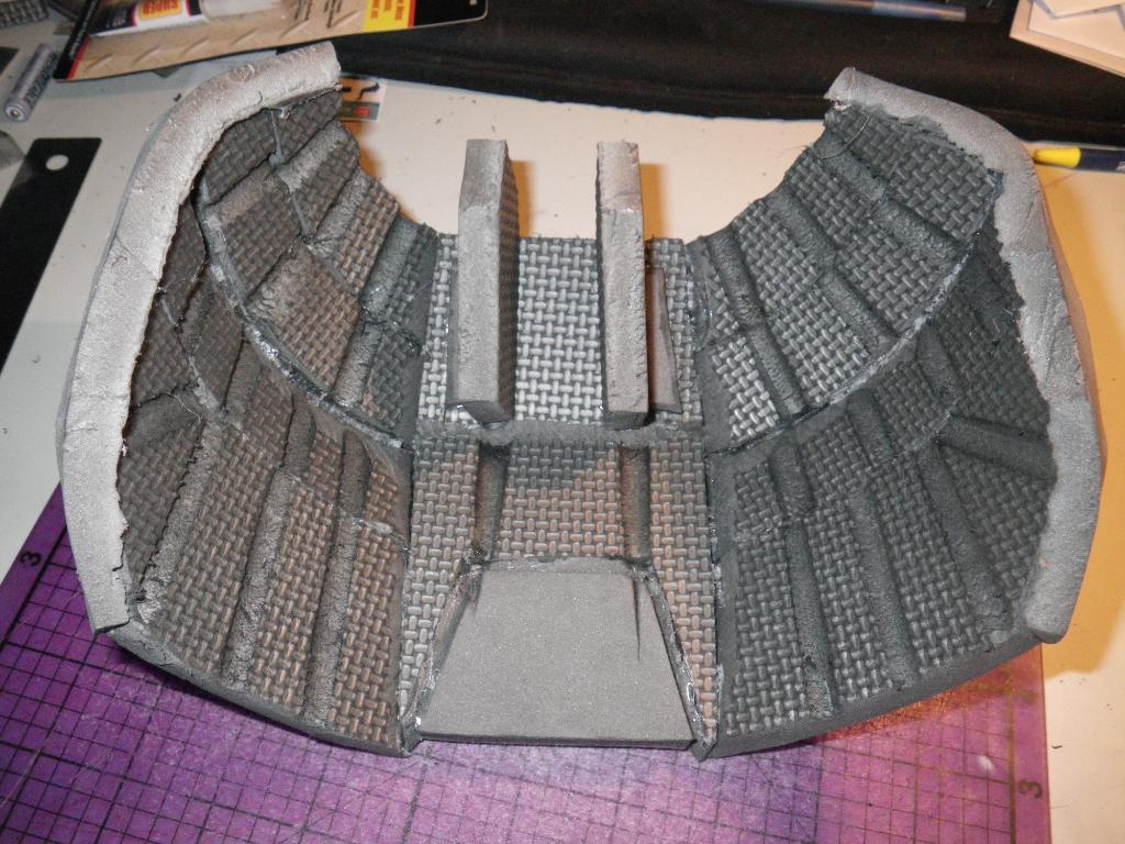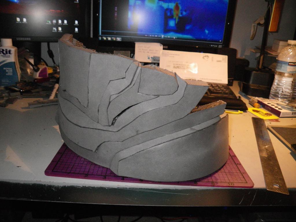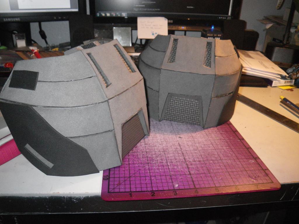 On the foam front, I decided to make some replacement shoulder pieces for myself. The first one I did was oversized, so I had to redo it again with this more reasonable sized piece. The grooves I burn in the back coupled with the heat gun really help make nice curves: