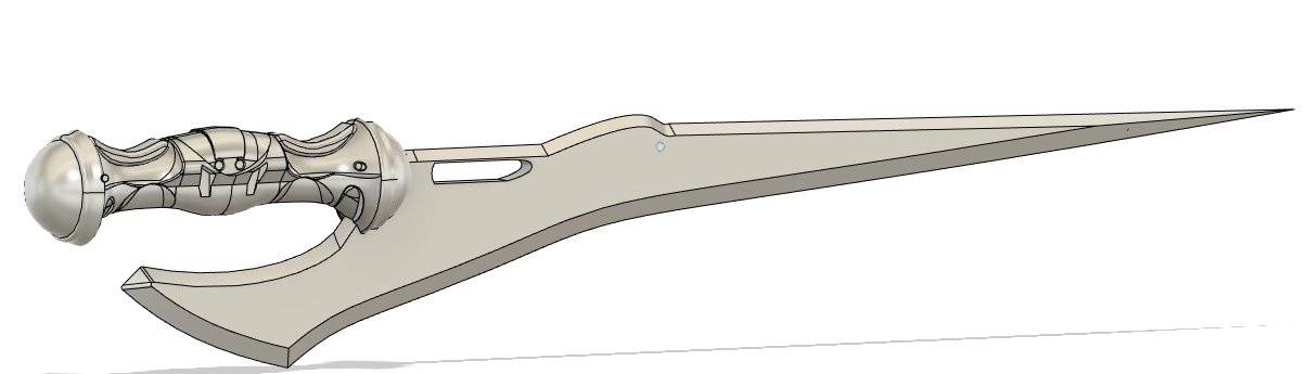 The weapon is about 1m long. It can be printed in multiple pieces without support. I think it took about 400+ grams for a single blade. My first attempt was ok in printing due to machine error and modeling error(Slot was too small and much sanding was needed for the dowel(But let me tell you the fit was super tight, I can swing it around without gluing it.))