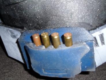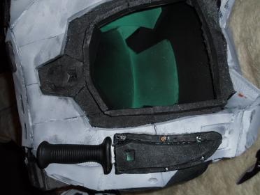 just added these spent shells into the belt for some extra detail. Also my dad had a practice rubber knife for self defense training so i thought id add a knife to the chest plate, made a sheath out of foam and poped some screws in to make it look legit