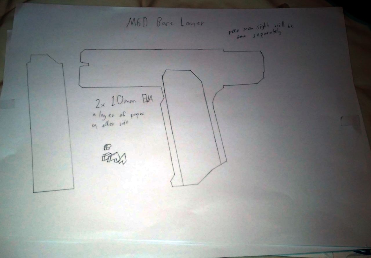 I regret choosing to do a 'game accurate' prop as it's going to be HUGE. I'm using a similar process as my last prop attempt which can be found here. I'm going to use 2 10mm thick EVA foam layers as a base, supplemented with thinner foam and finally; foamie details. The trace below is the (sharpened) result of playing around with the first person M6D model, getting it 1:1 and then destroying my thigh tendons tracing off my monitor (very gingerly).