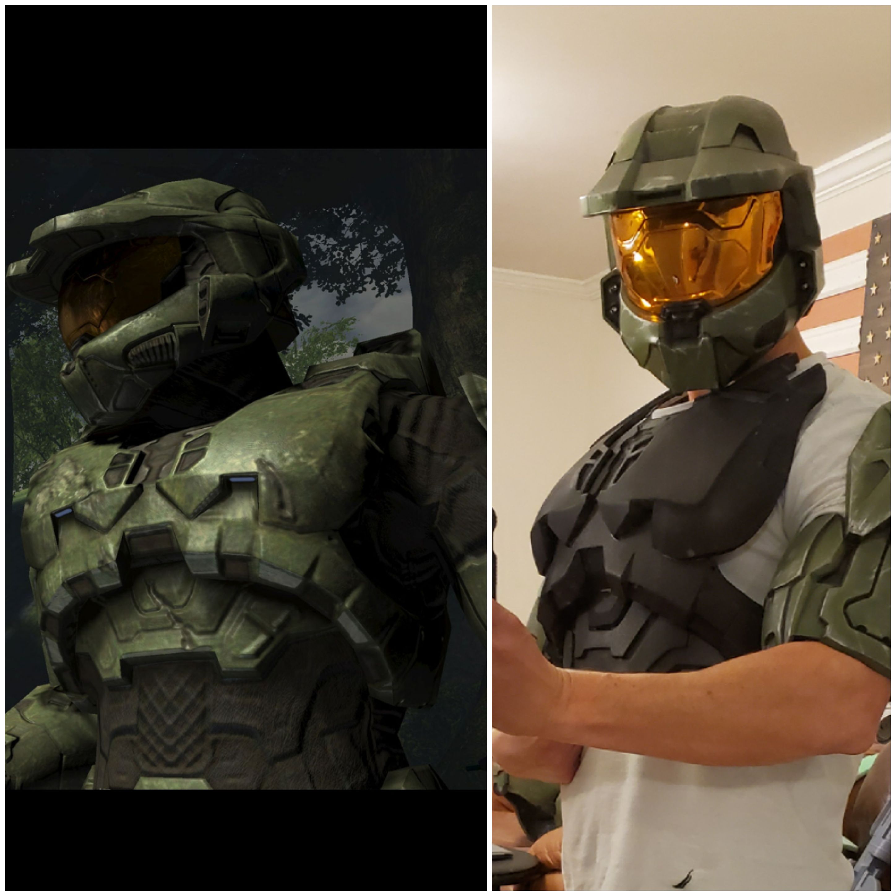 Well guys.. I've been a lousy 405th member lately, not having much time to get on and see people's builds or share my own progress. That said, I have been working on the new torso lately as I have time and I'm very stoked with how much more game accurate it is in detail and scaling then my current one. I'm hoping to have it wearable by the end of this weekend, we'll see! This new torso is almost completely freehand, the templates are pretty much entire free hand drawn using pdo as a starting point, but completely altered for game detail, it's been fun and challenging! Also here are a few recent suit up pics with the new helmet from back on Halloween night.