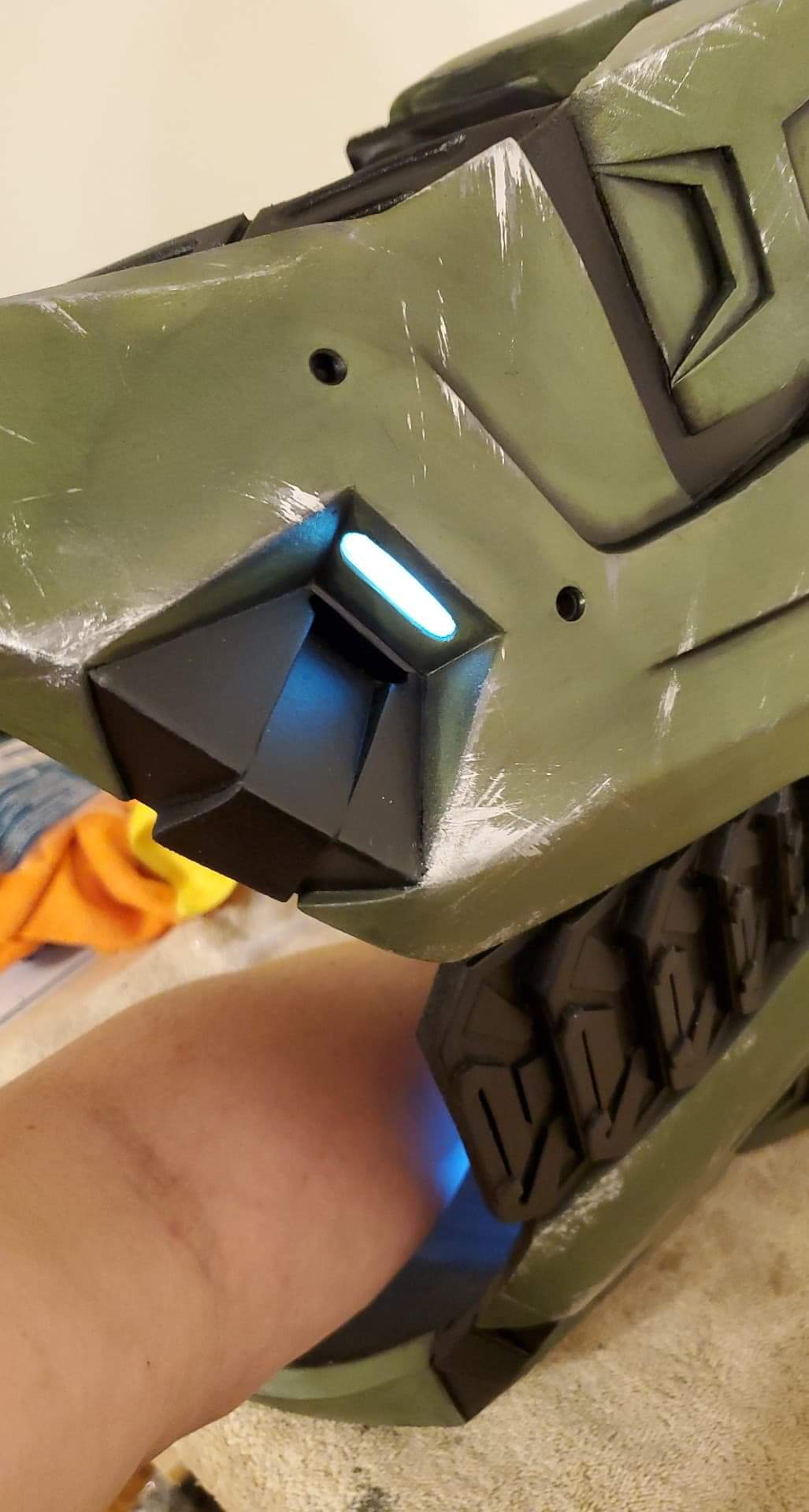 Rockin, rockin and rollin. Down to the beach he's strollin!Yes I custom make it all..the leds are just 3mm white leds. I use phone charging cables and cut them down to length I need and solder to the leds. The connectors are jst 2 pin connectors you can get off Amazon. For the light diffusion itself, I use acrylic sheets and cut down to shape, I rough the inside with 100 grit samd paper then tint the lense on the inside blue with my airbrush. From there I hot glue the lense in place which is also part of the light diffusion. Then I hot glue the led in a position where it lights up the whole lense. Then I hot glue a eva foam cover with metal reflective tape inside to help it shine and also keep light from shining inside the suit. To pretty up the wires I hot glue them down with anchor spots then airbrush the glue spots to make them blend in to the interior of the suit. Here are some pics of the process.