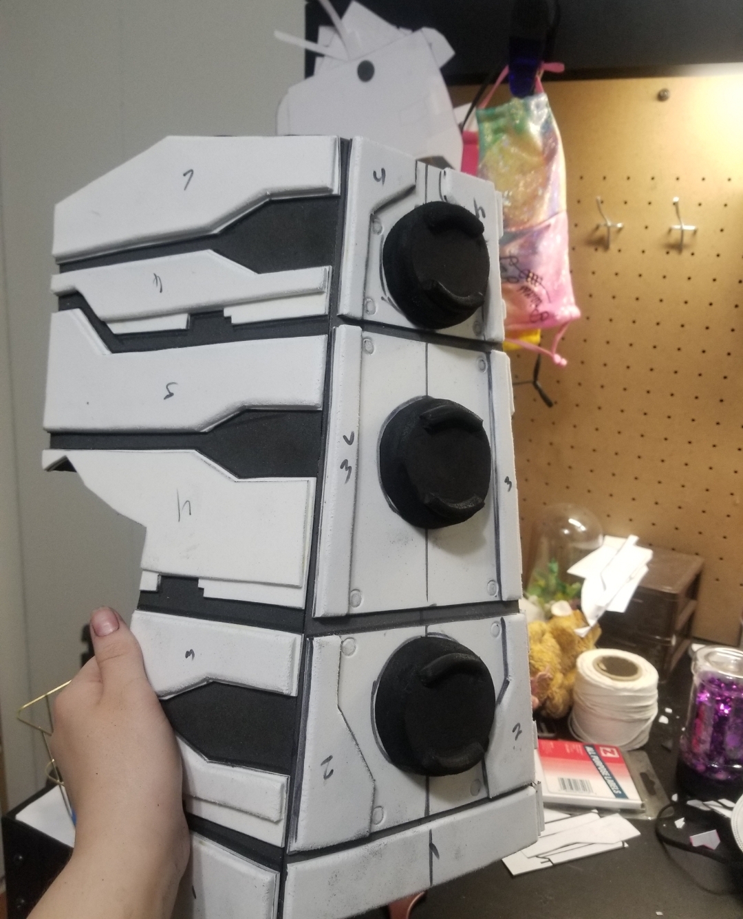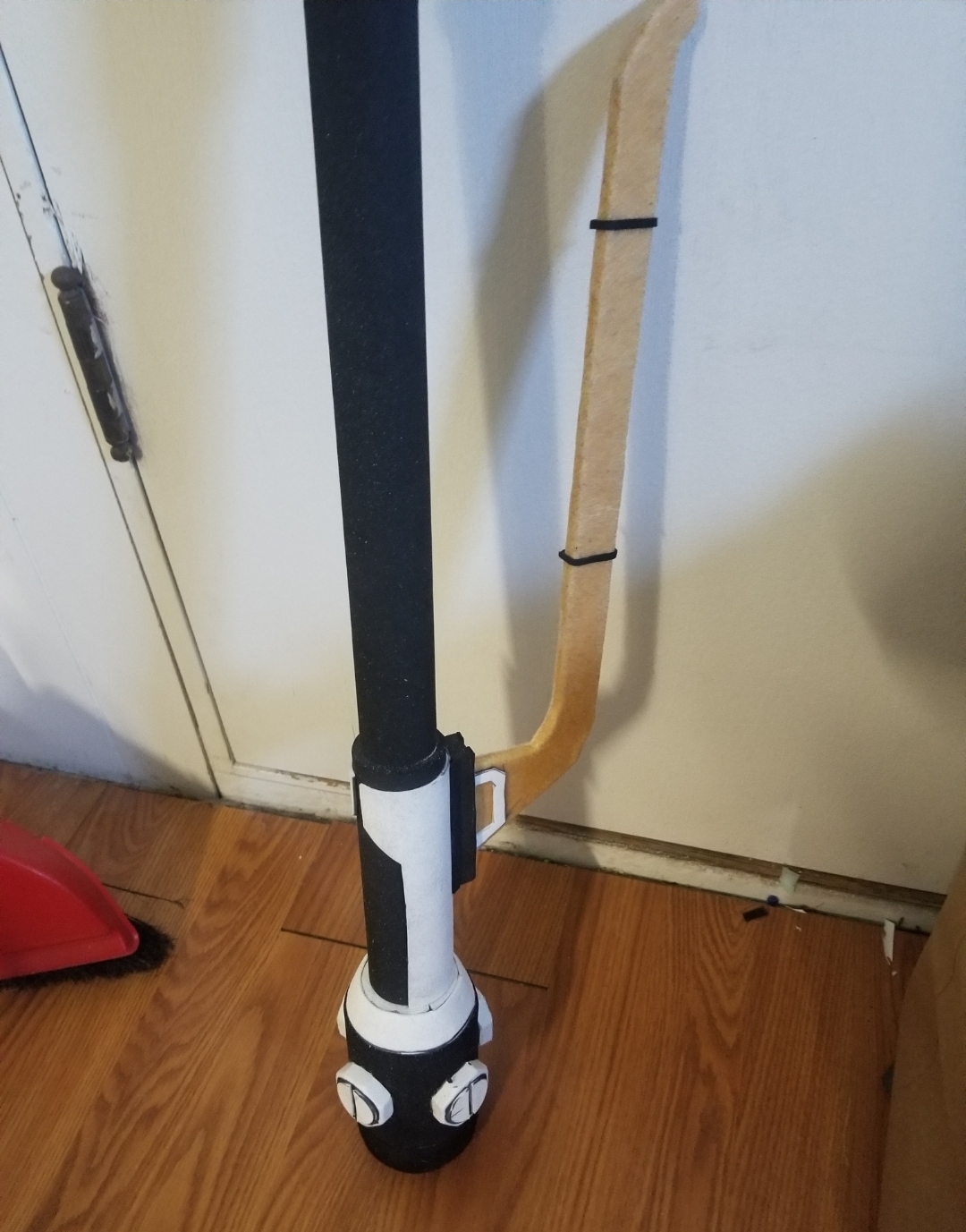So, I'm having a bit of a hard time figuring out how to mount the hammer head and the blade to the PVC pipe. I sort of have a method going but it's still paning out to be pretty difficult. I'm hoping that when I get it mounted I can focus on the details before I have to paint it and I need to be putting primer on by Wednesday to meet my deadline. I have had a ton of fun making this prop as much as it has been frustrating. Also, I hate working with worbla and I'm going to have to do more of that tomorrow so I can mount the blade when it is ready, fingers crossed that it isn't too heavy. In the mean time, I finished the handle of the hammer minus the fabric I'll be wrapping after it's painted. I also found it funny because I was testing the durability of the worbla piece coming of the side of the handle while video chatting and someone was afraid I was going to break it, but I didn't which is why I tested it! Always test your builds when you can fix them!