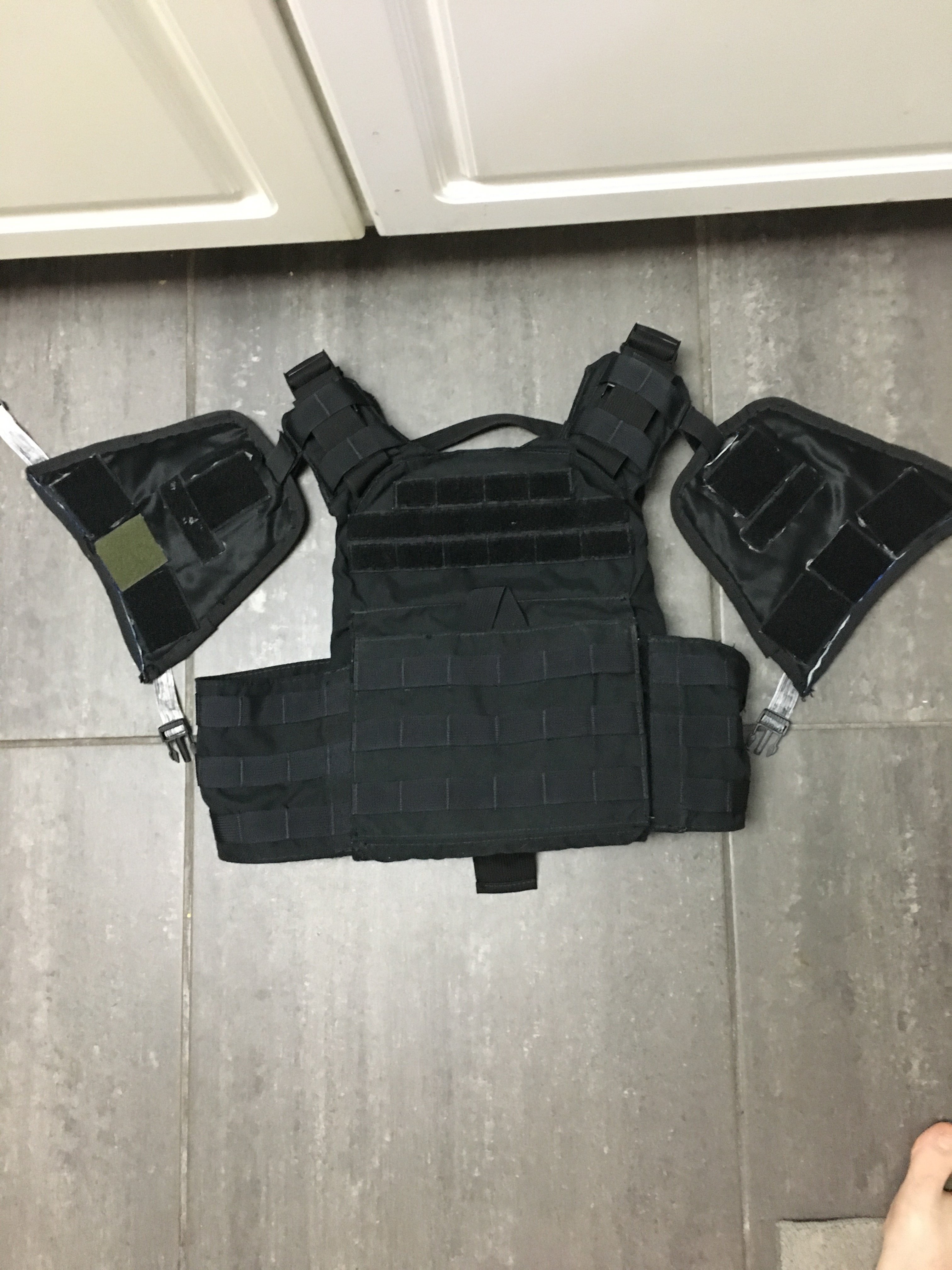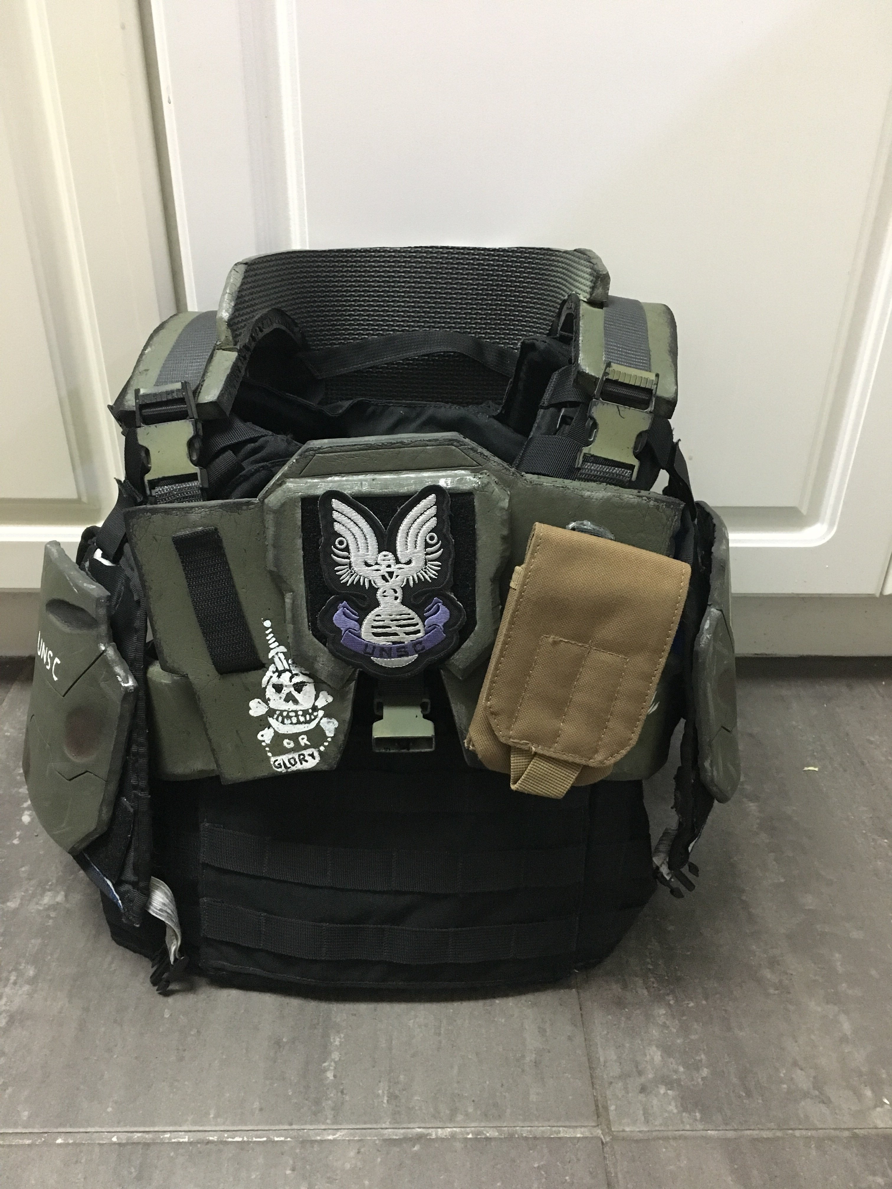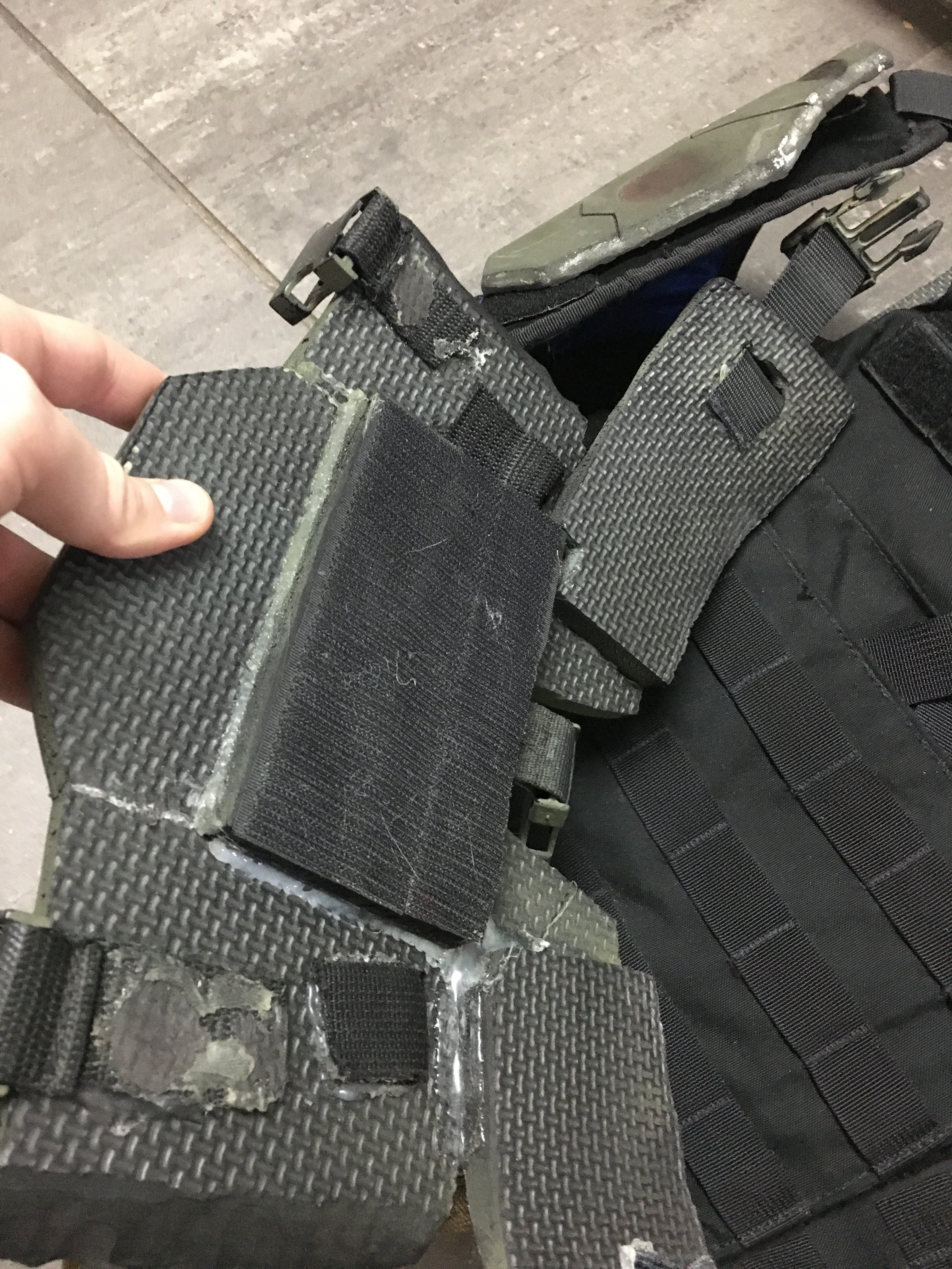 For the under vest on my marine I went with a Condor Cyclone plate carrier and a Condor gen II battle belt and a cheap pistol belt I found at a surplus store. For the shoulders I made them out of some umpire vest arm pads and slapped some Velcro on them. I took advantage of the Velcro sections to attach my foam armour directly to the plate carrier to avoid it shifting during cons