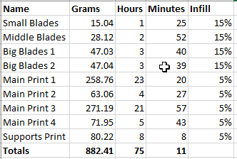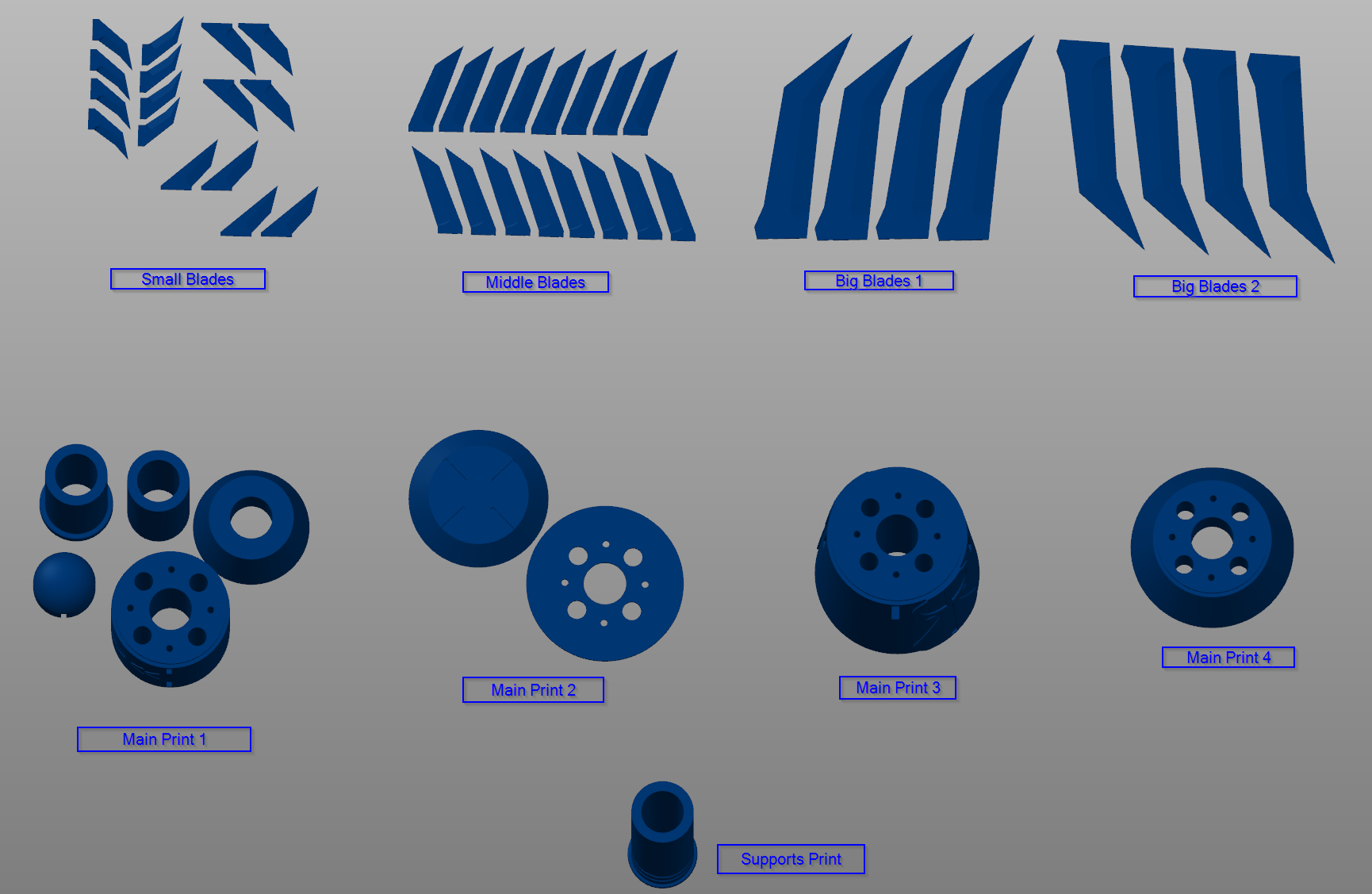 The model has a bunch of internal supports to hopefully make it quite sturdy in the end. The blades all split in half and also have channels for support rods.