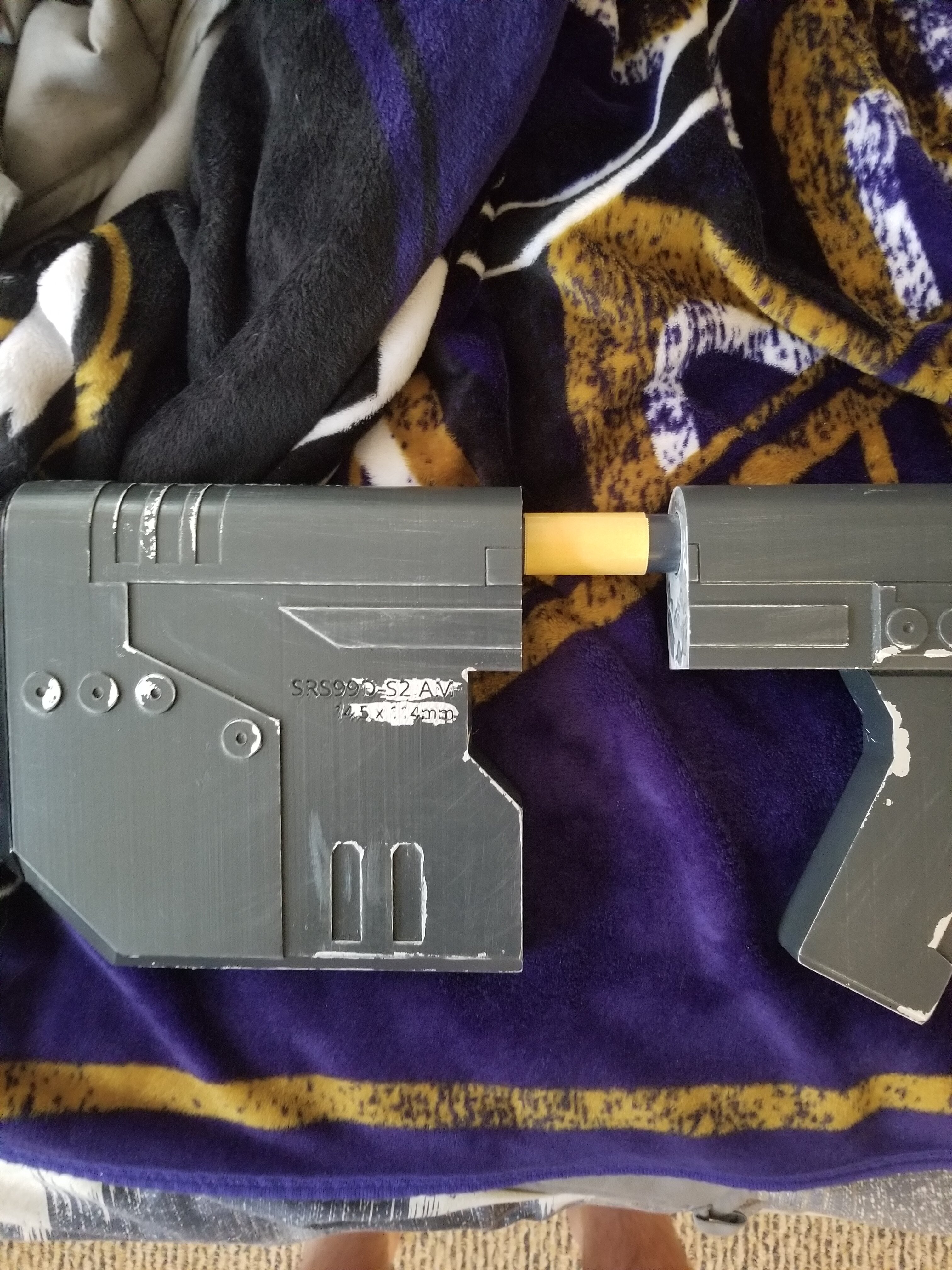 Repair Update: the E6000 is holding nicely and there is no movement in the stock now. Might need to touch up the paint a little bit later around the seal, but for now I think it's okay. Now that the glue has been left to cure for 3 days, I've moved onto securing the barrel. Made sure to have two other pairs of eyes check the alignment so its straight as an arrow. Once that's set I'll attach the carrying handle and the rifle will be all finished.