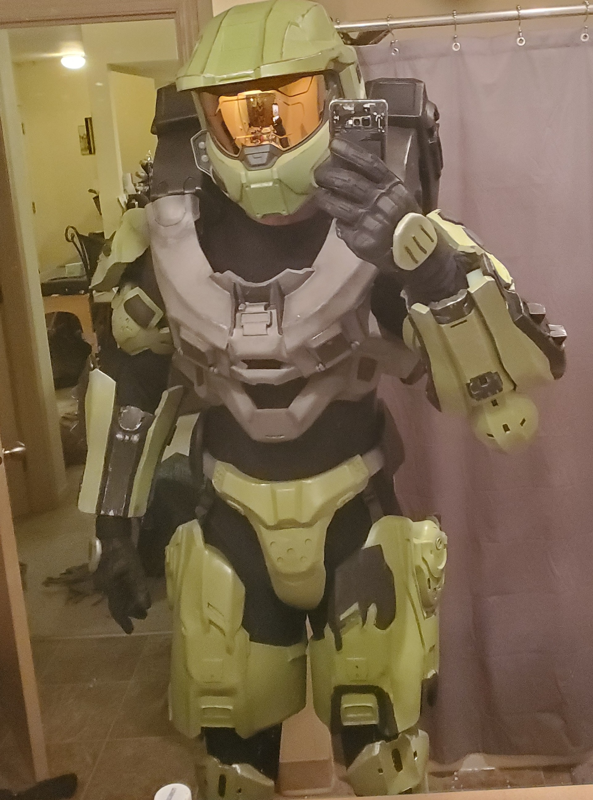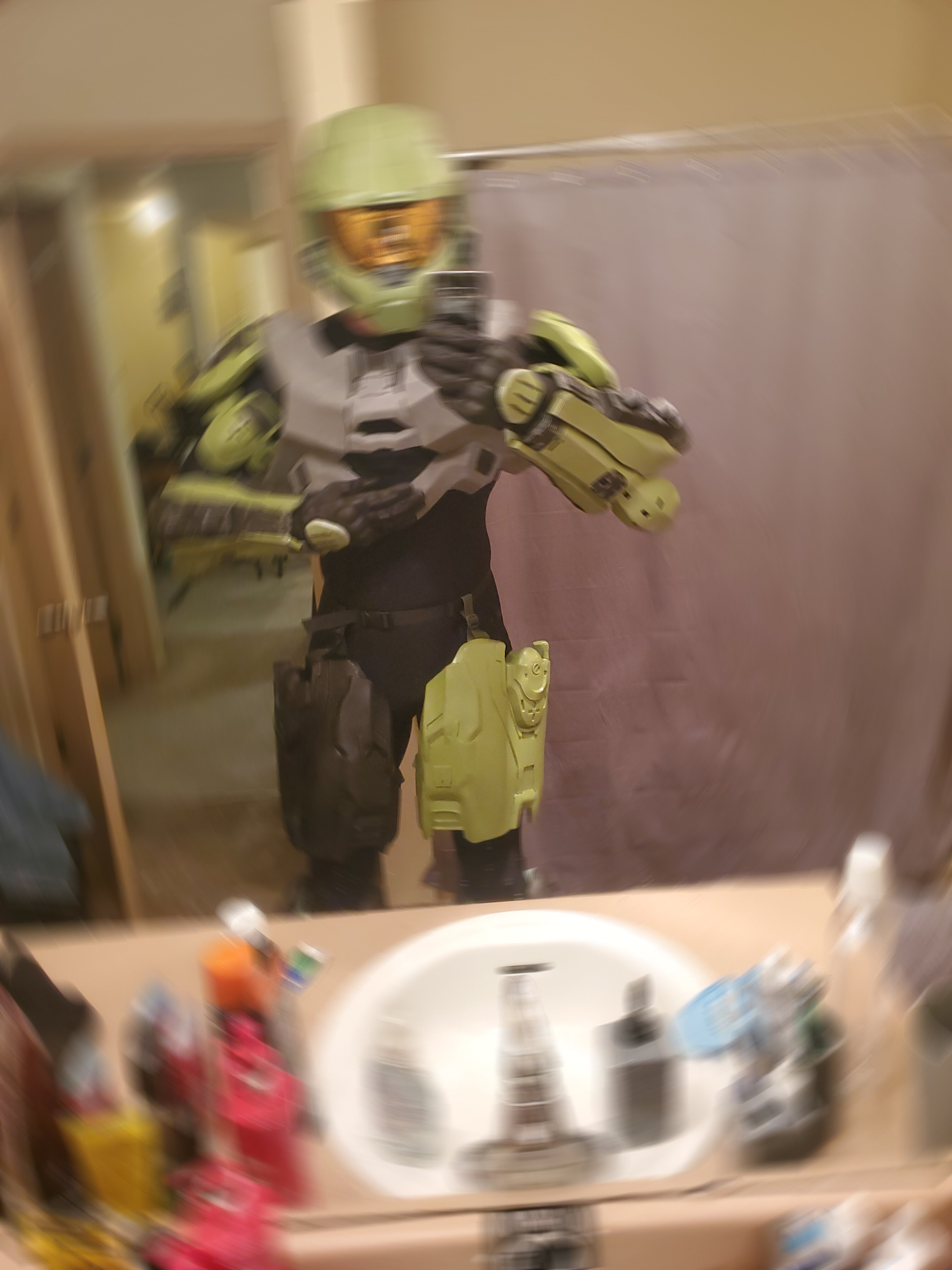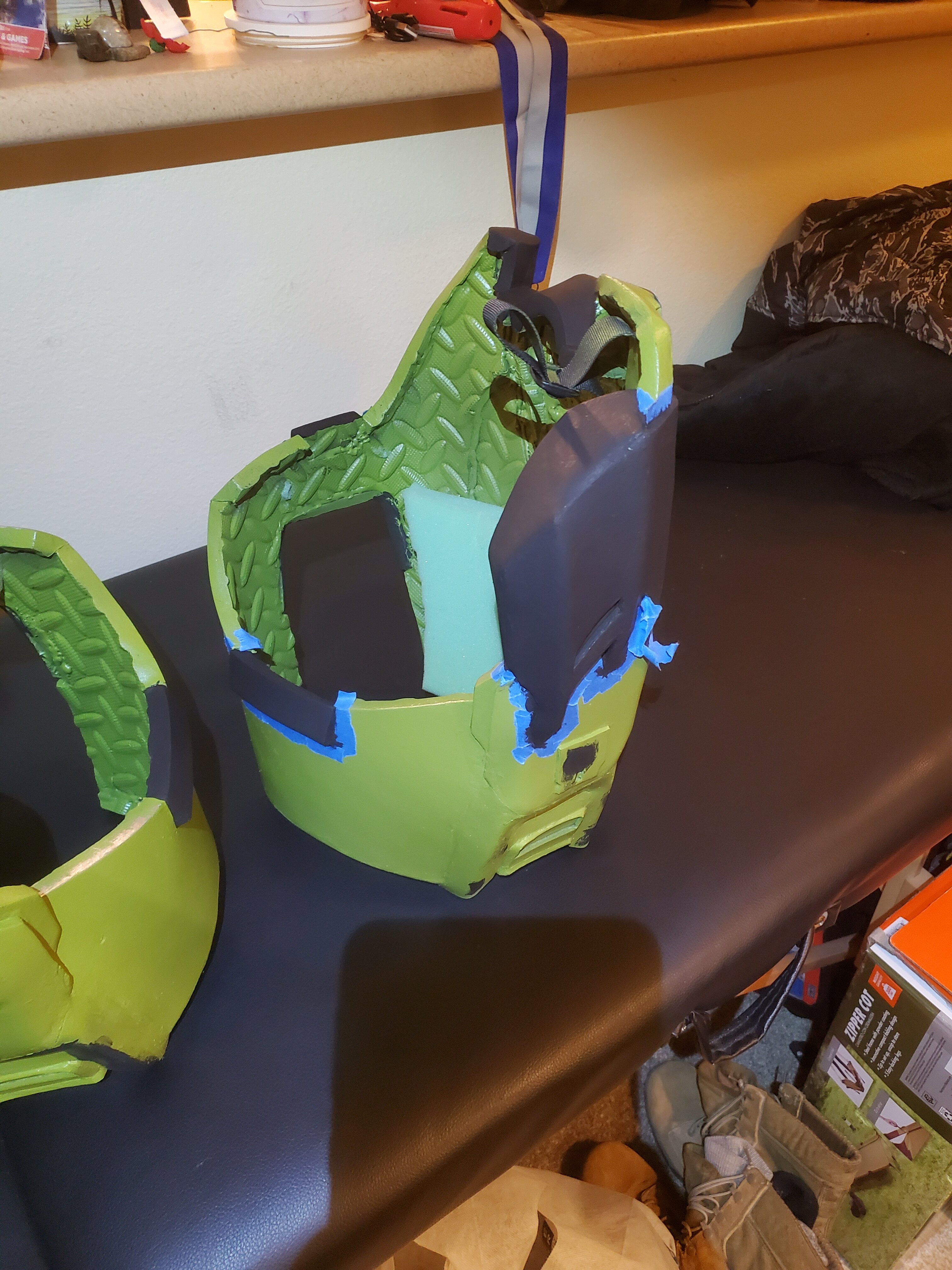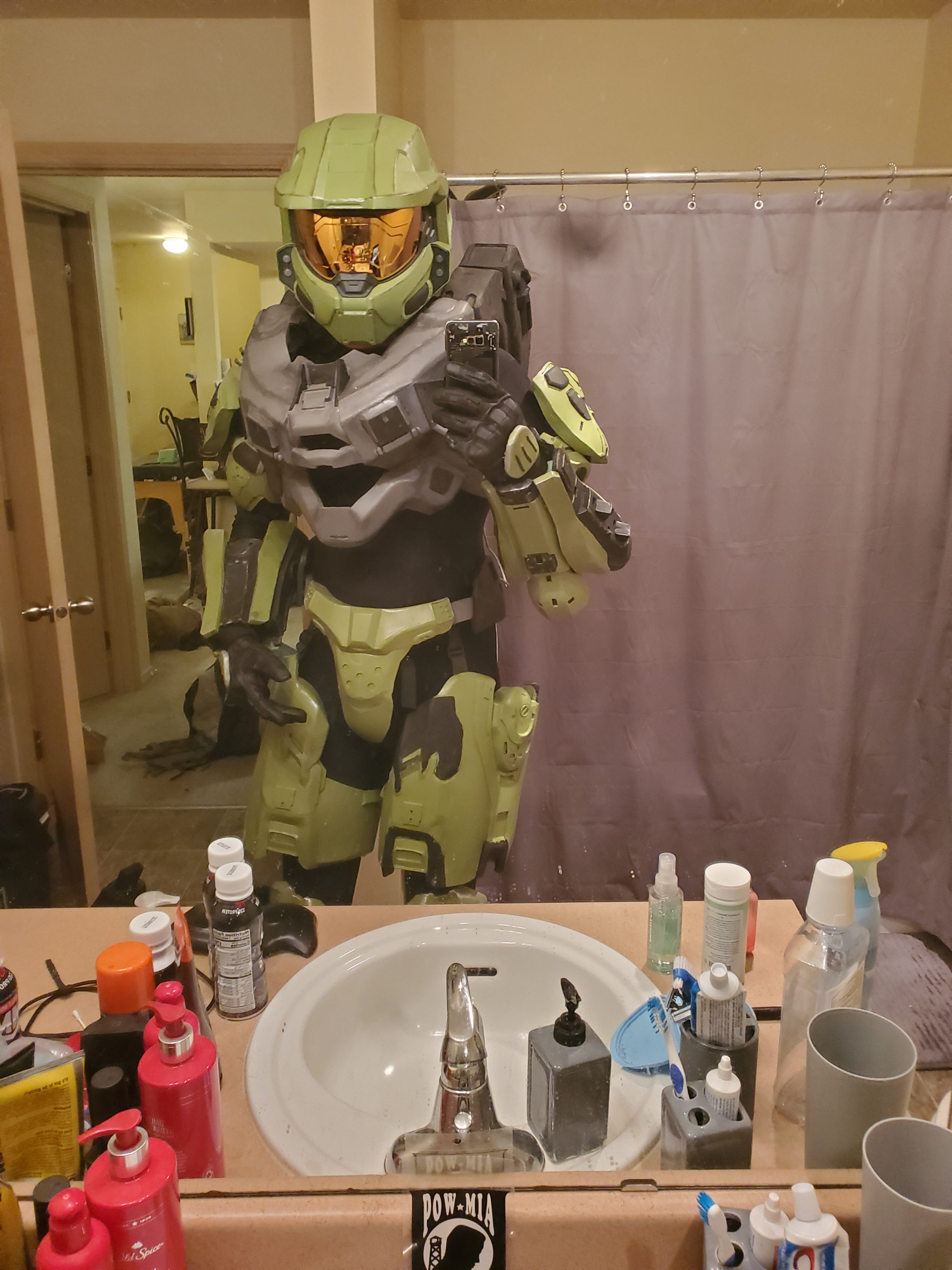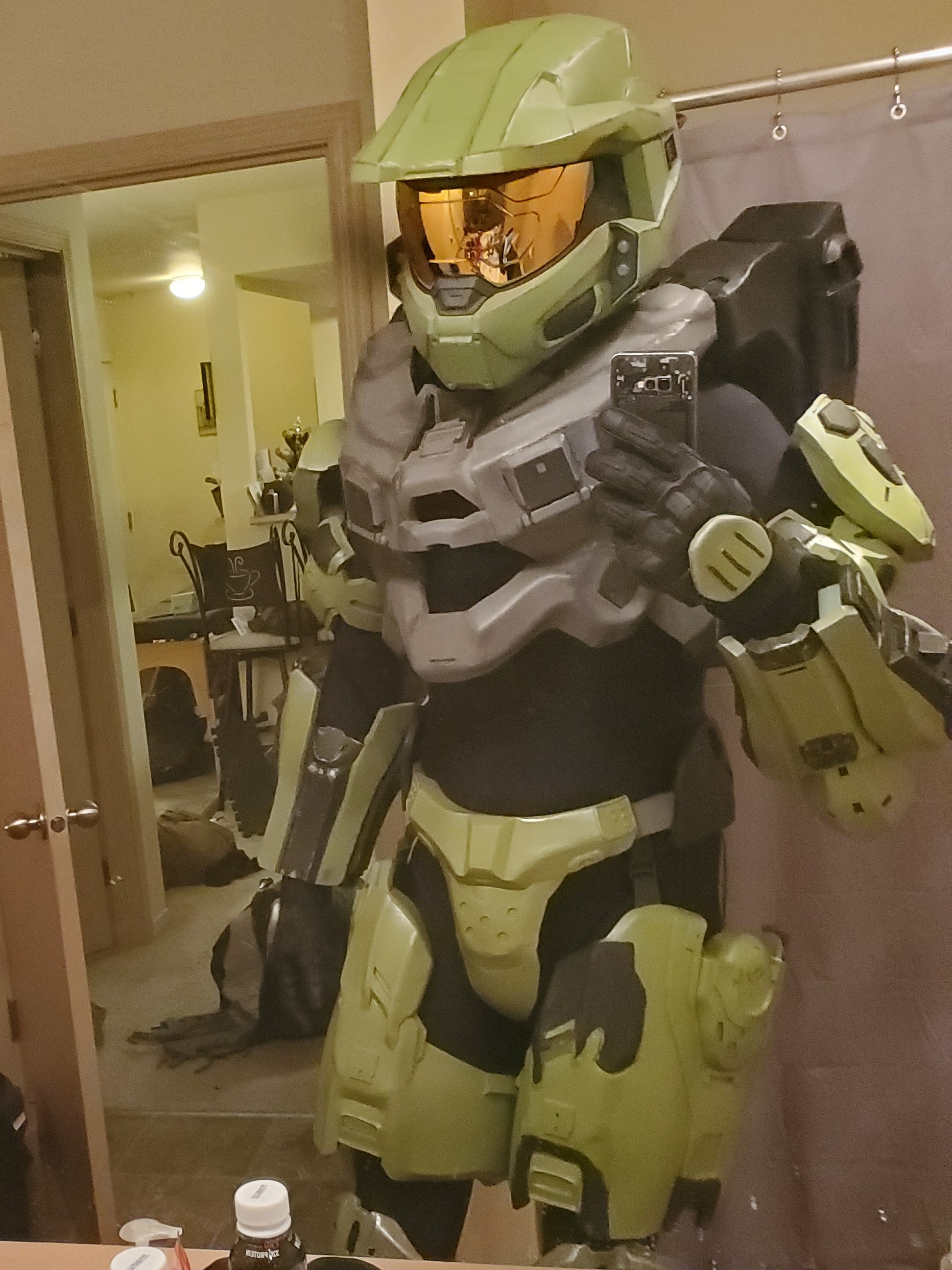 Progress update: the build is coming along and I think I'll finish in time for Halloween with time to spare to try to get some electronics installed: helmet fans, voice amplifier, hearing amplifier, and maybe even some lighting. I was thinking of trying to add a setup with some lights on the armor that glowed a steady blue but when I press a button a speaker plays the shield break sound effect and then the shield recharge effect, with the blue light changing to a flashing red light and back to blue when the sheilds recharge. I found some kits for the sound effects but am unsure how to get the led lights to sync with the sound effect, so we will see.
