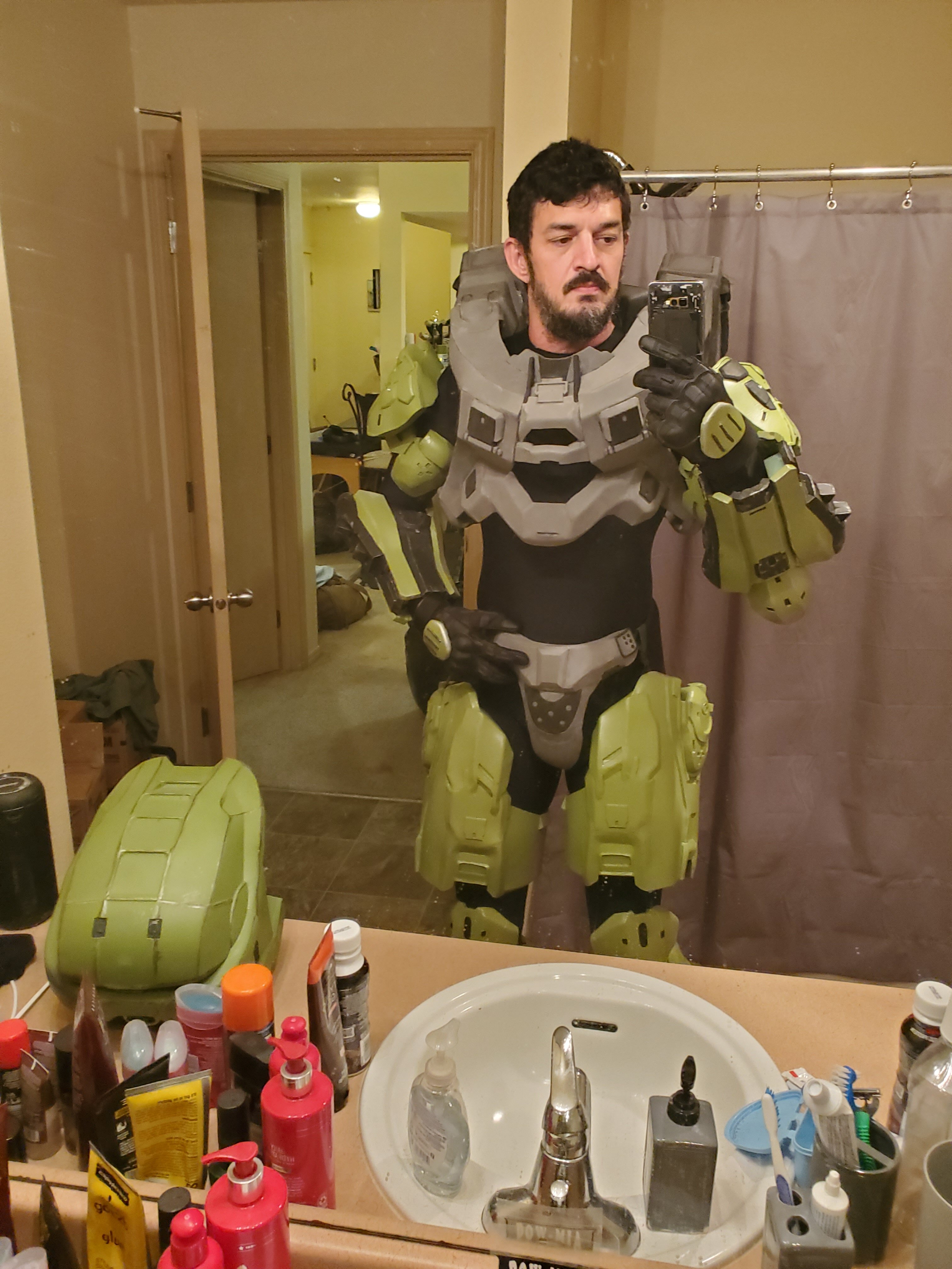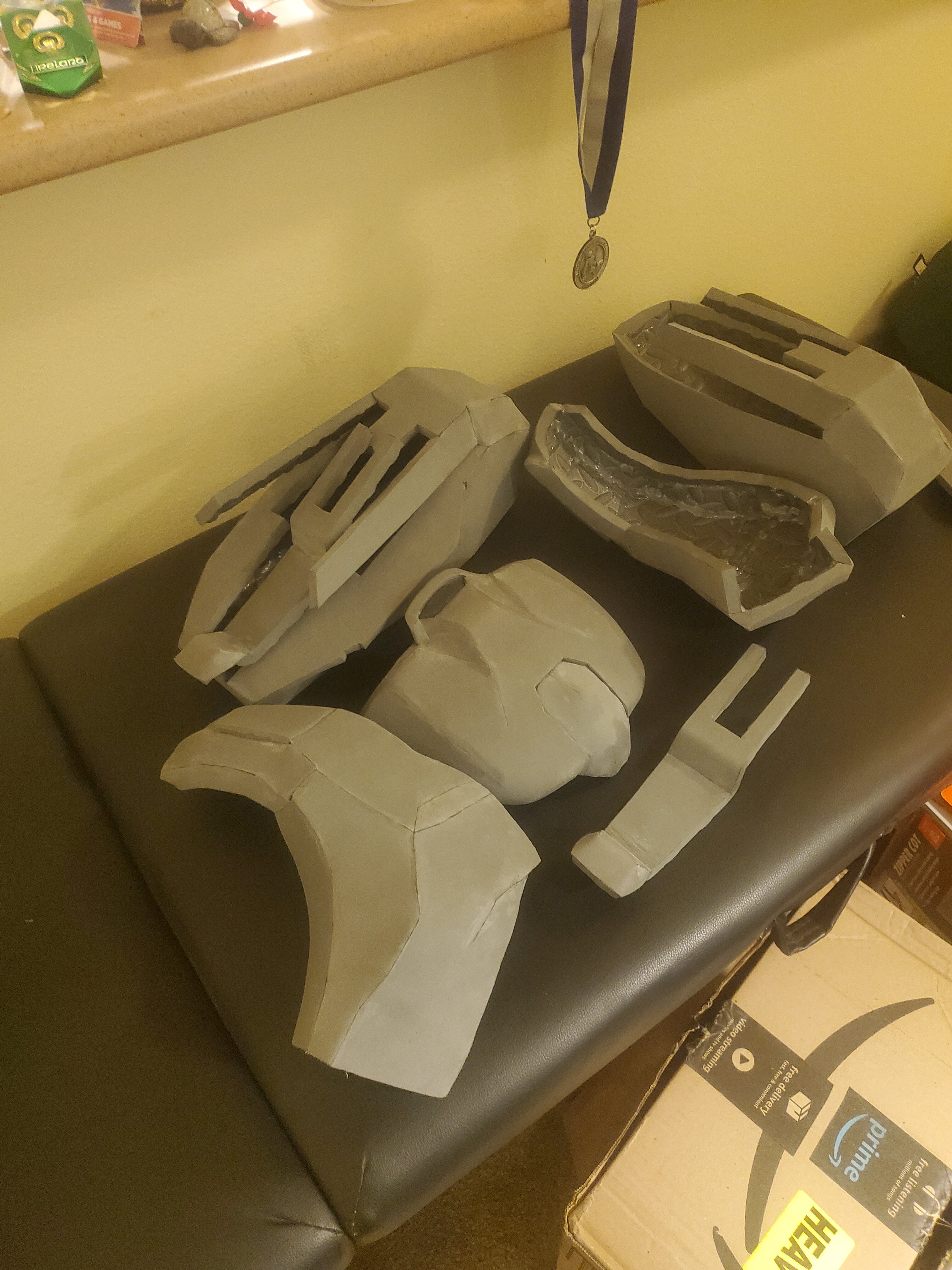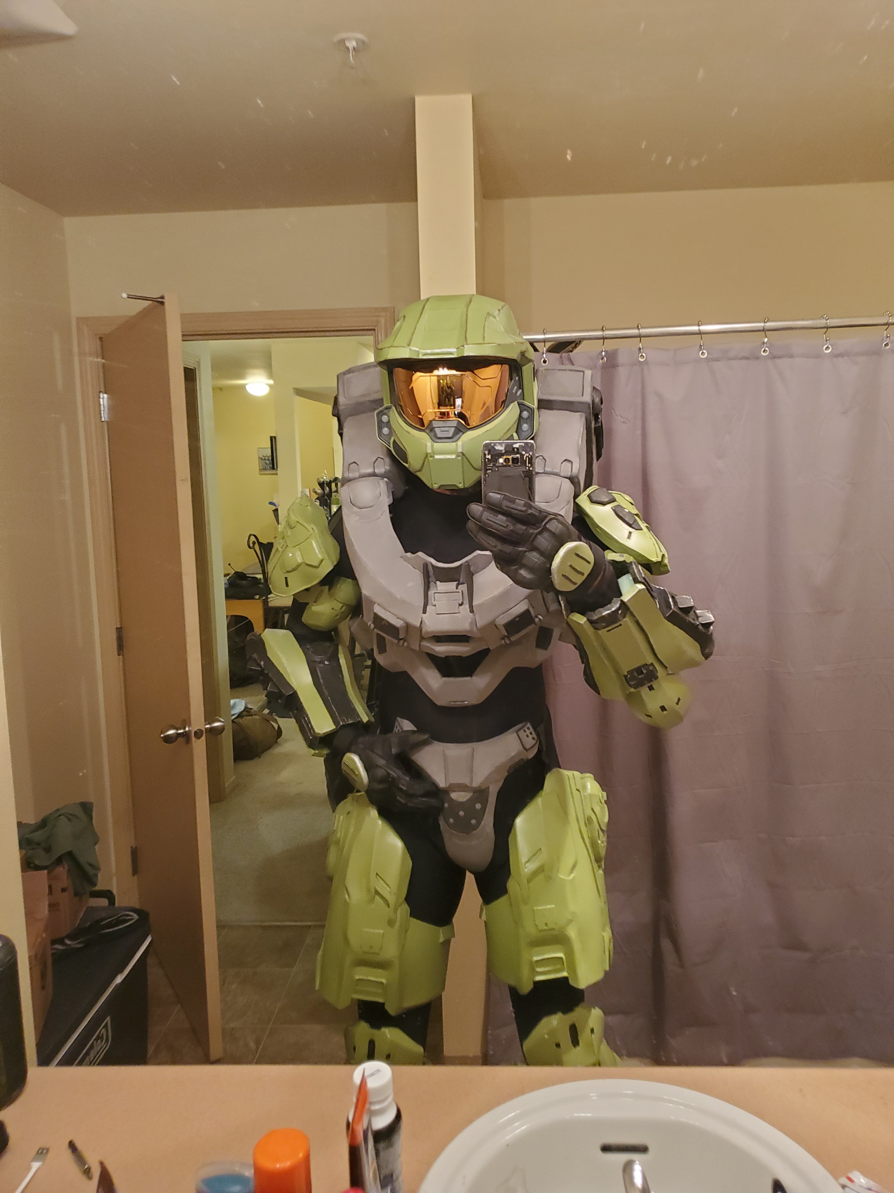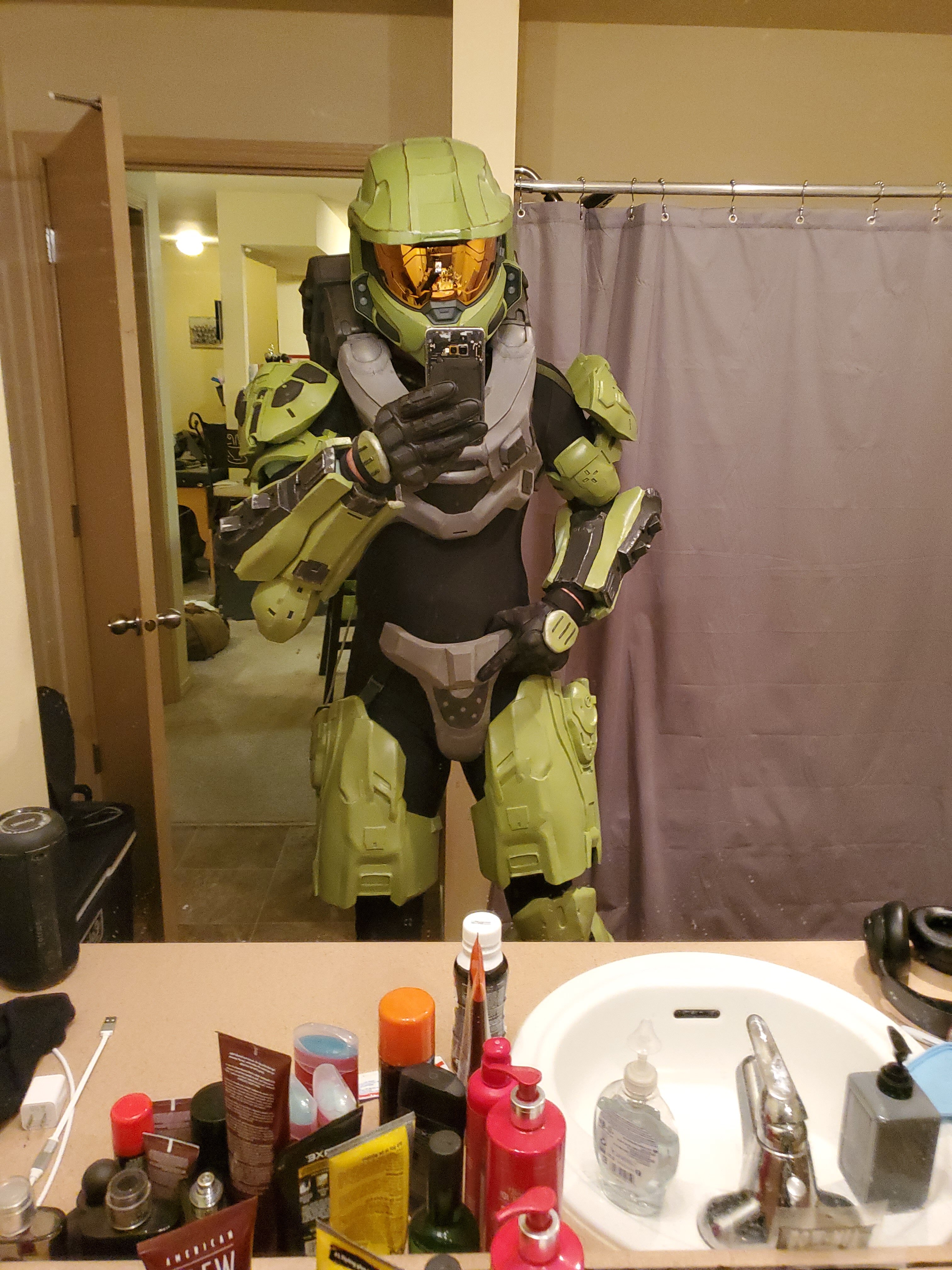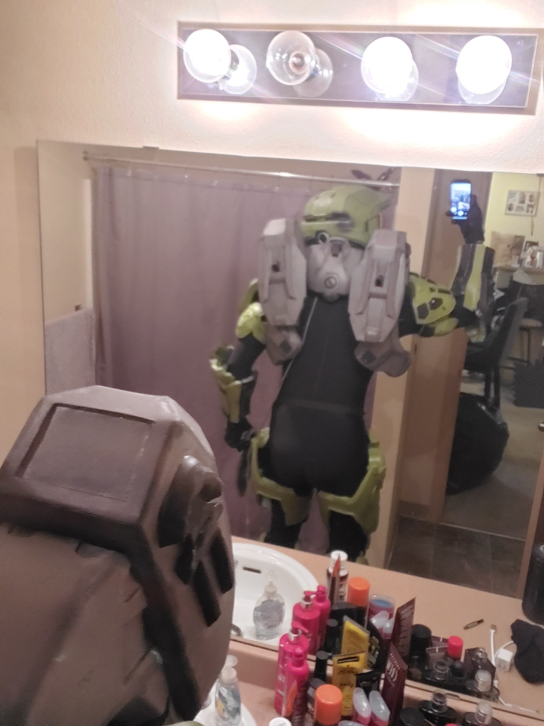 Progress update: the build is coming along and I think I'll finish in time for Halloween with time to spare to try to get some electronics installed: helmet fans, voice amplifier, hearing amplifier, and maybe even some lighting. I was thinking of trying to add a setup with some lights on the armor that glowed a steady blue but when I press a button a speaker plays the shield break sound effect and then the shield recharge effect, with the blue light changing to a flashing red light and back to blue when the sheilds recharge. I found some kits for the sound effects but am unsure how to get the led lights to sync with the sound effect, so we will see.