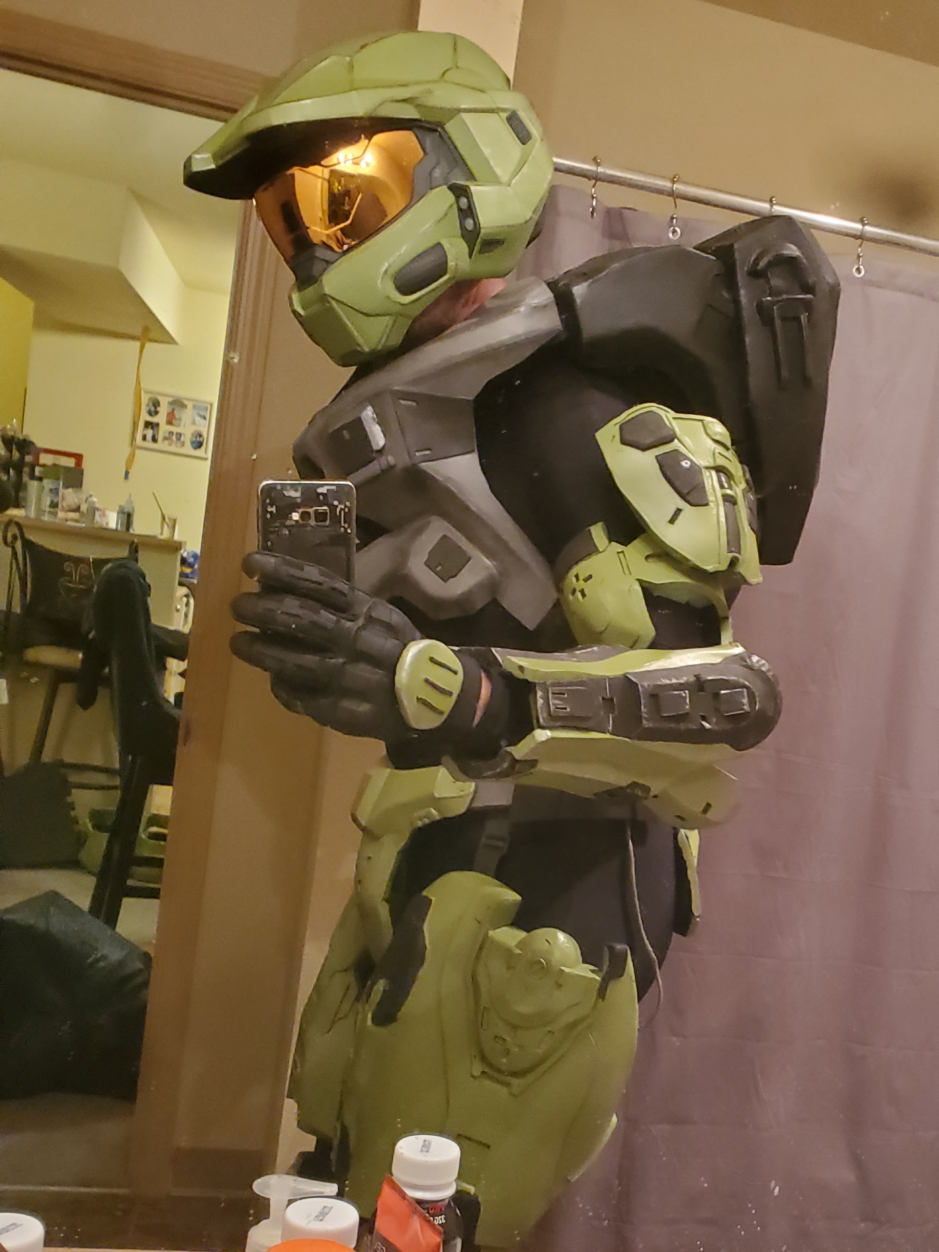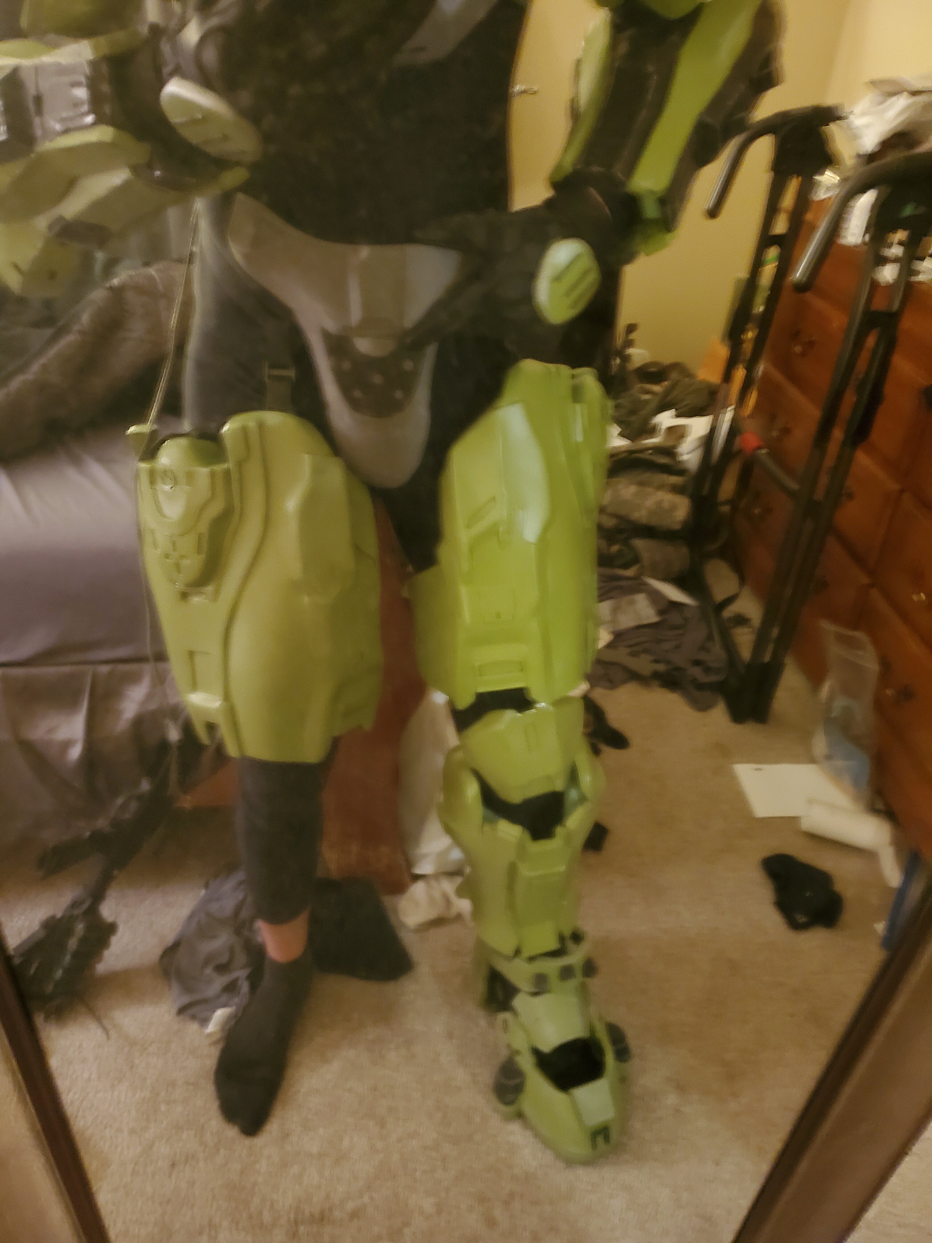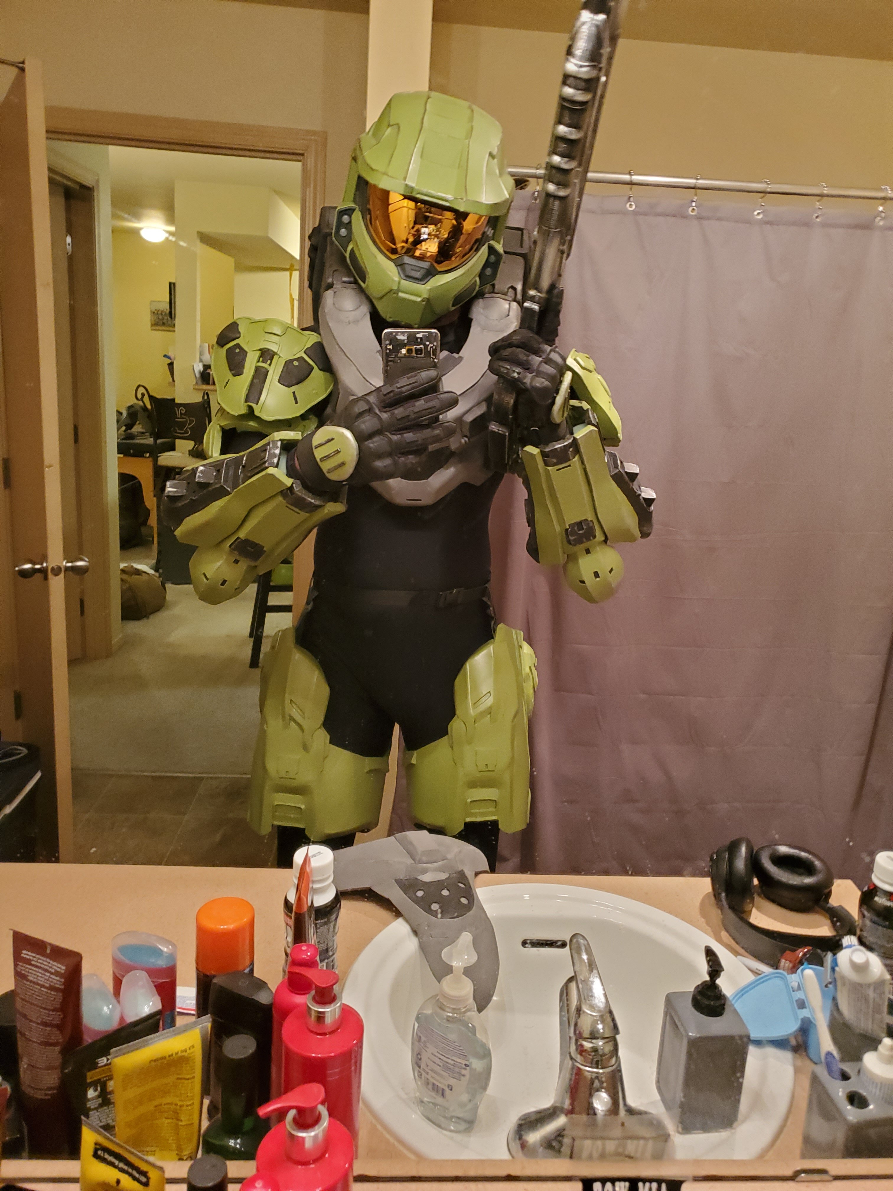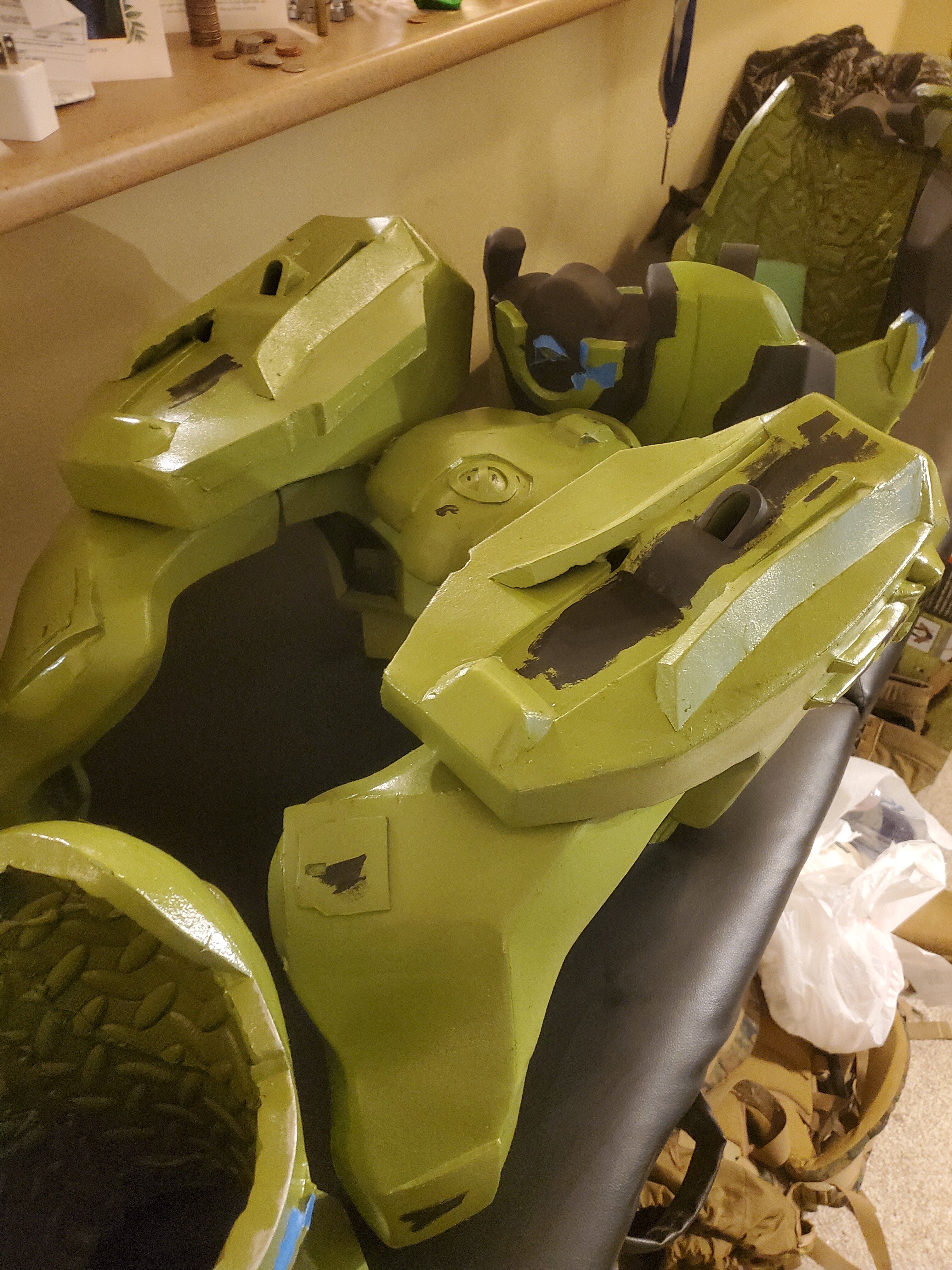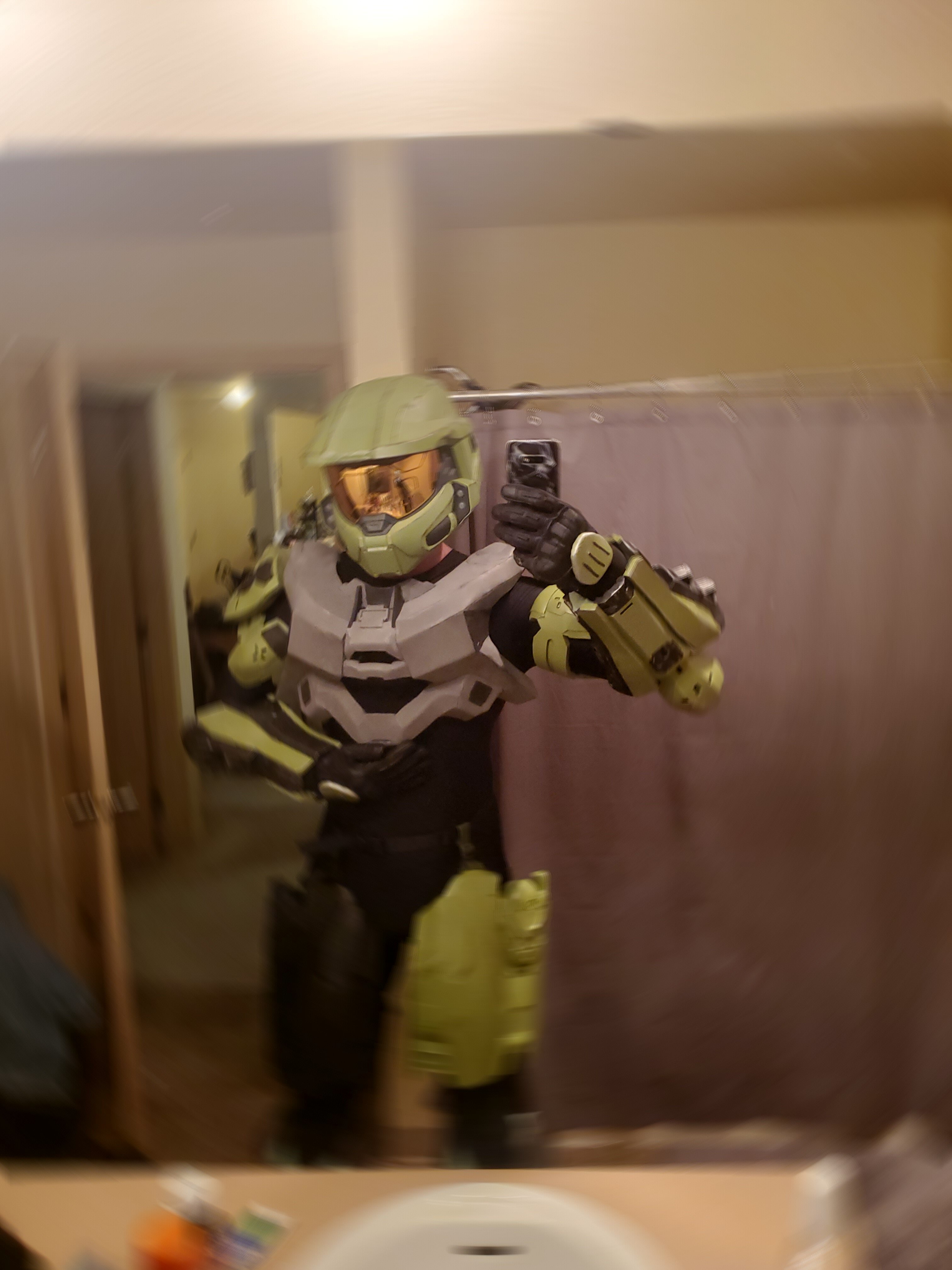 Progress update: the build is coming along and I think I'll finish in time for Halloween with time to spare to try to get some electronics installed: helmet fans, voice amplifier, hearing amplifier, and maybe even some lighting. I was thinking of trying to add a setup with some lights on the armor that glowed a steady blue but when I press a button a speaker plays the shield break sound effect and then the shield recharge effect, with the blue light changing to a flashing red light and back to blue when the sheilds recharge. I found some kits for the sound effects but am unsure how to get the led lights to sync with the sound effect, so we will see.