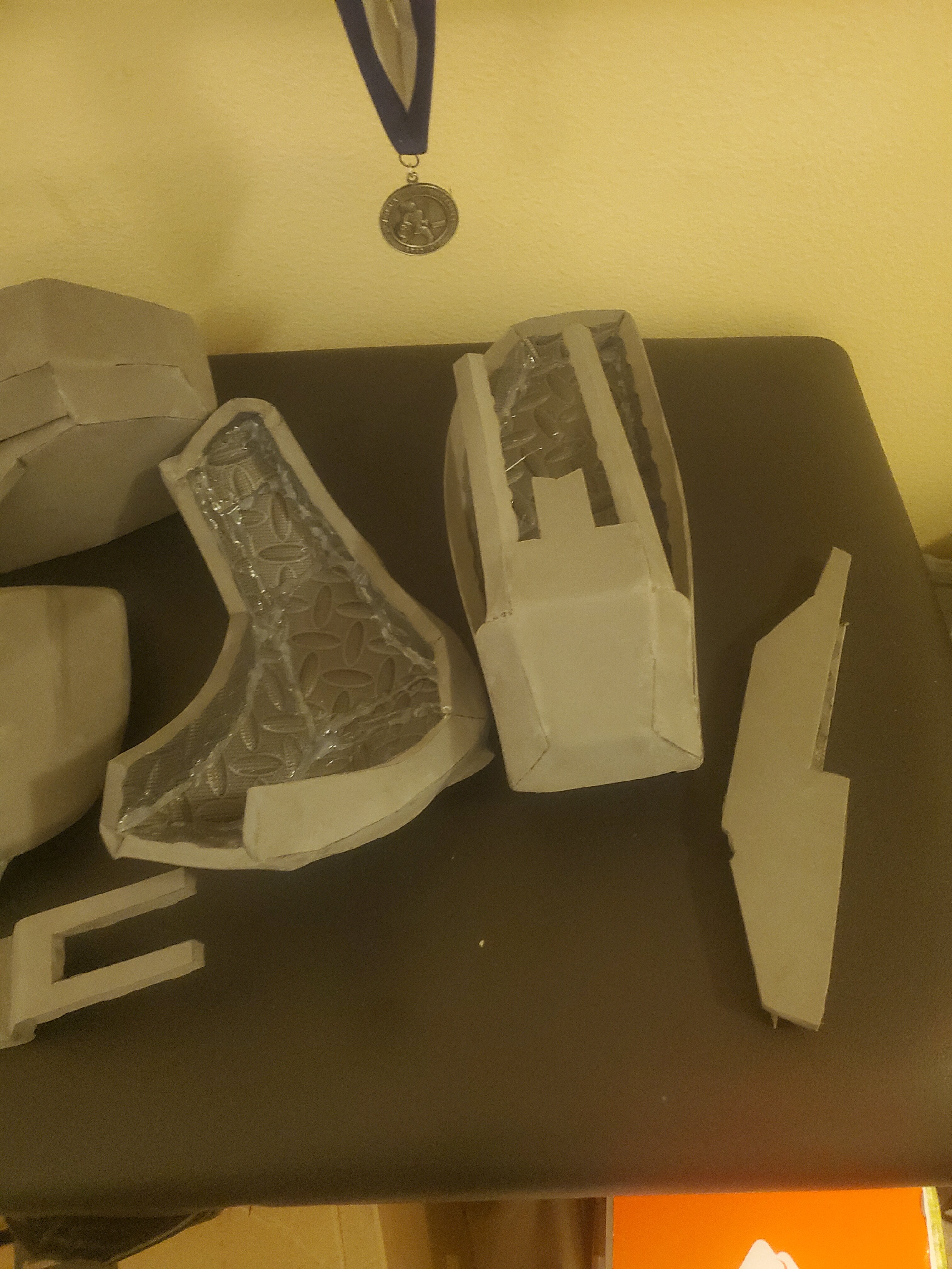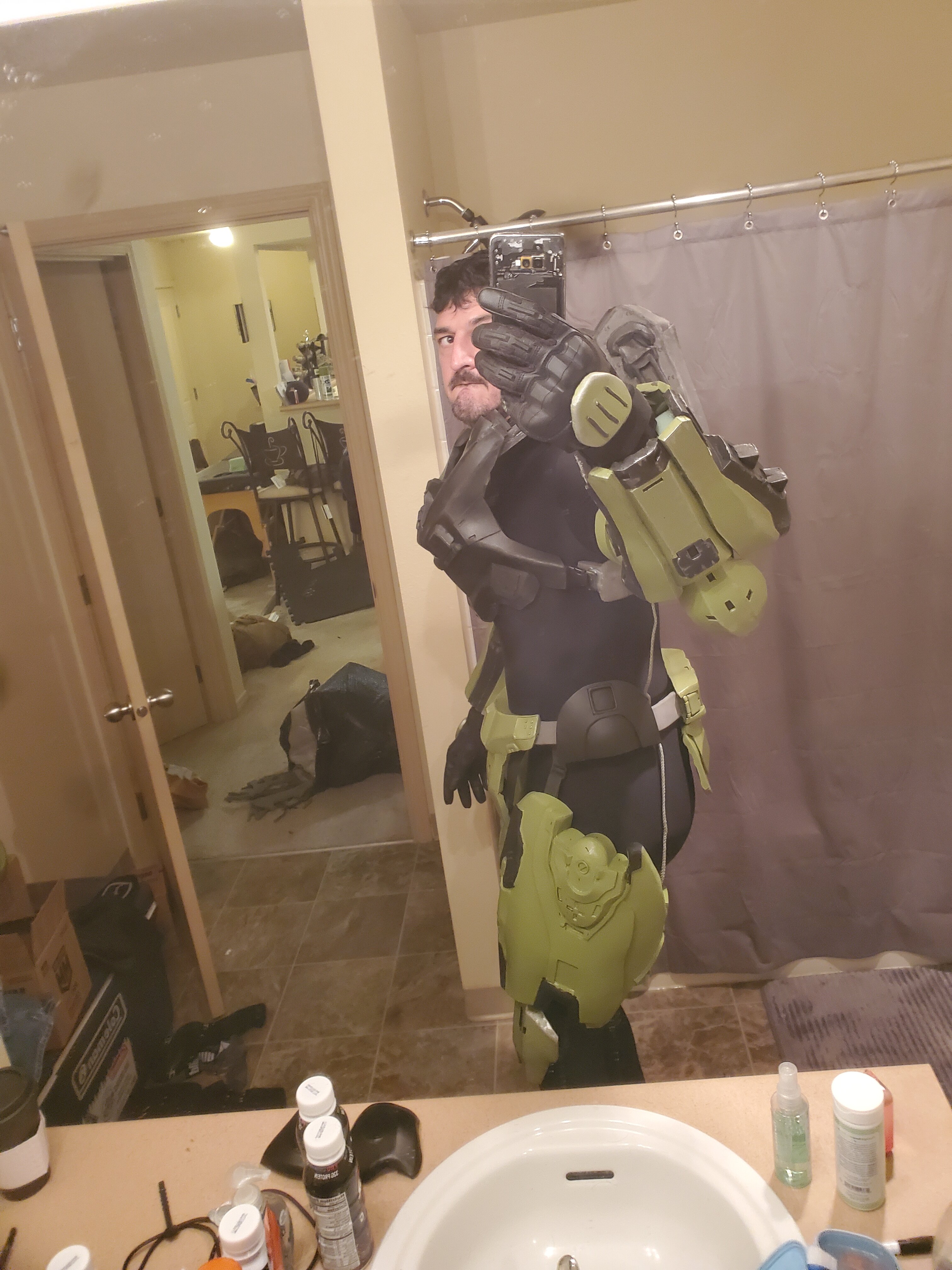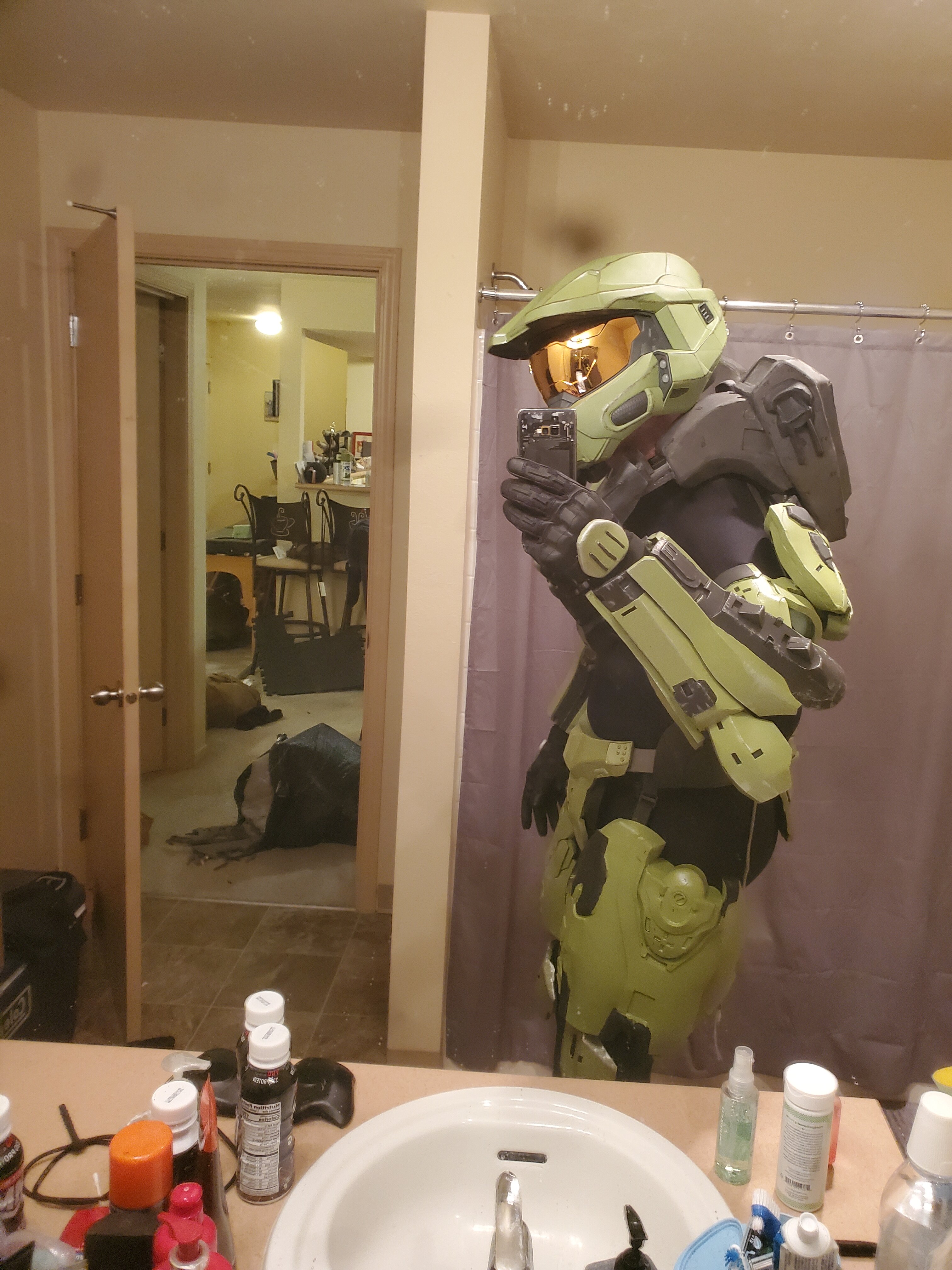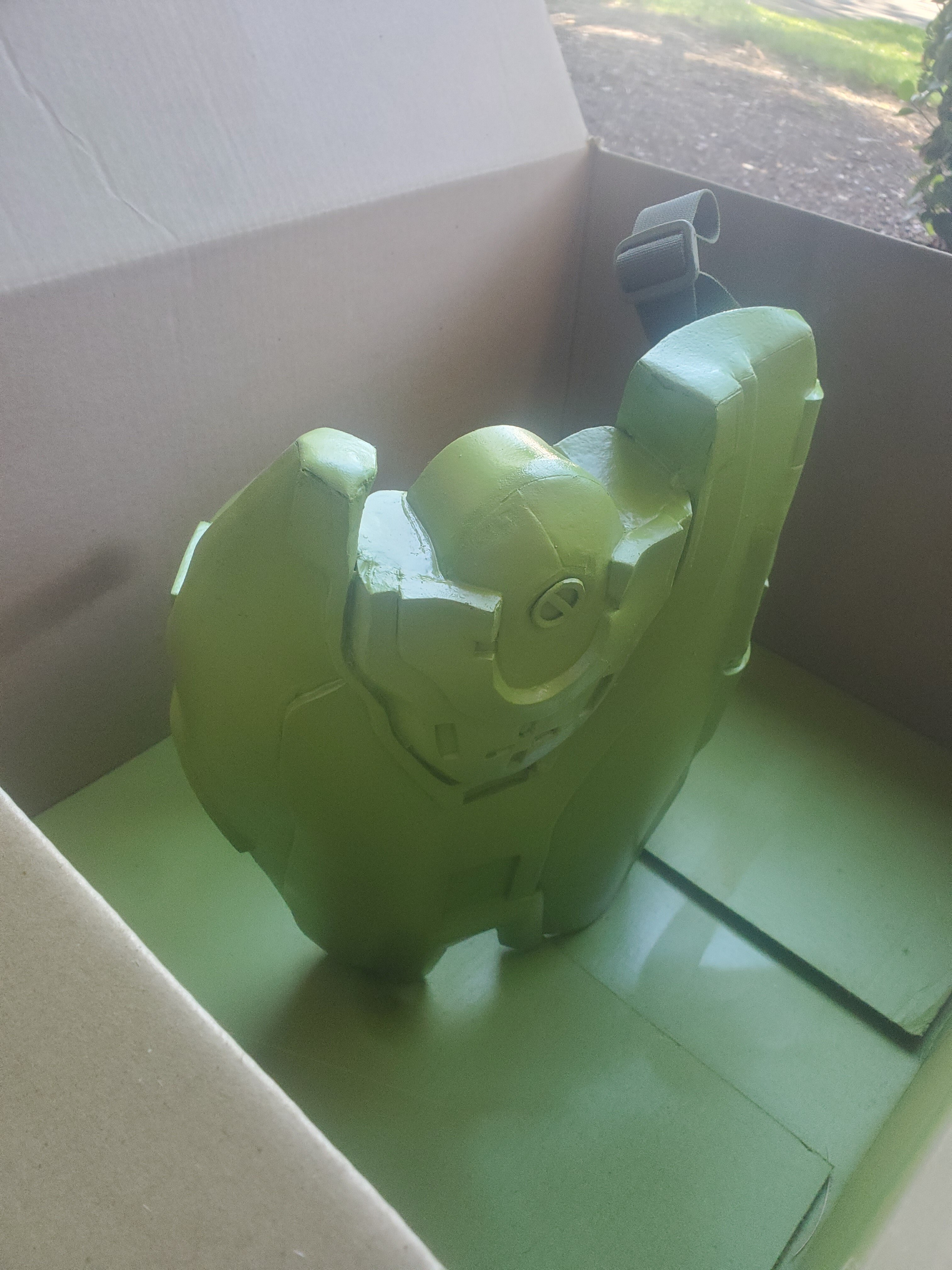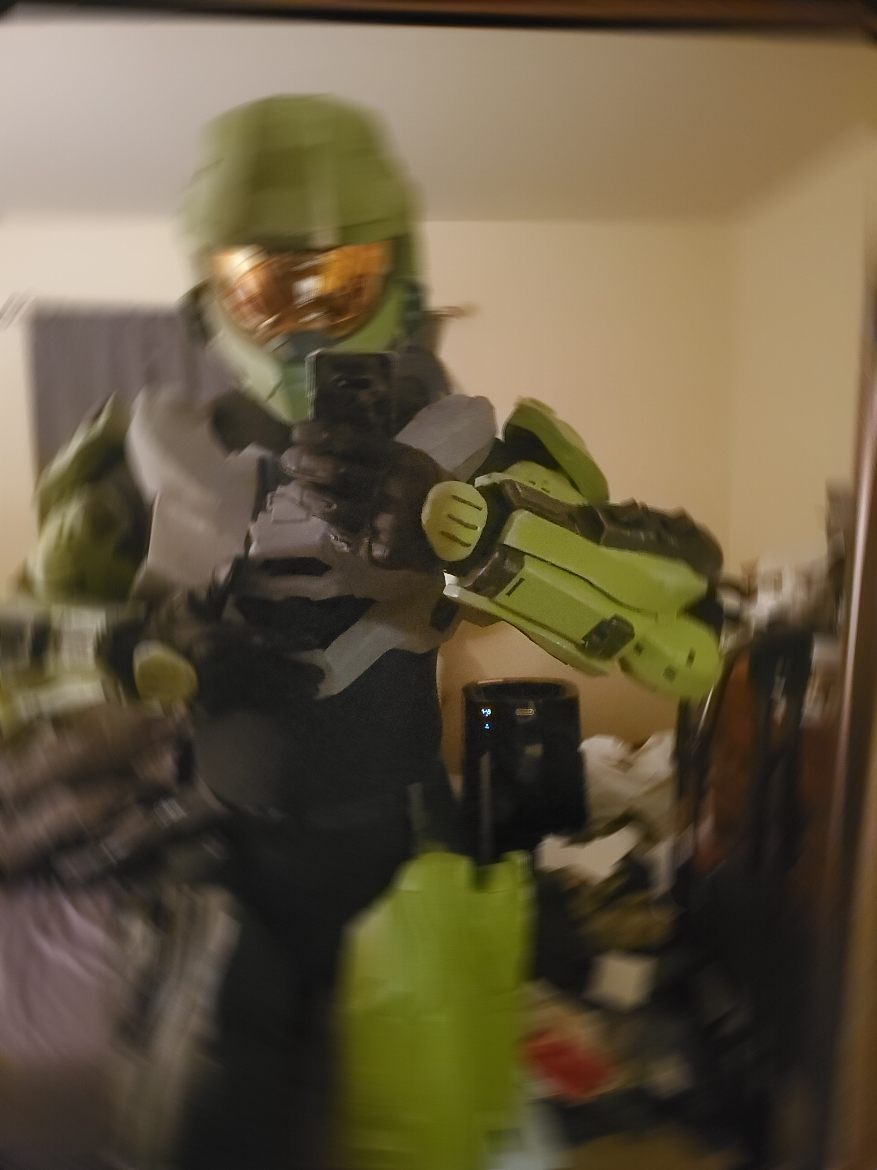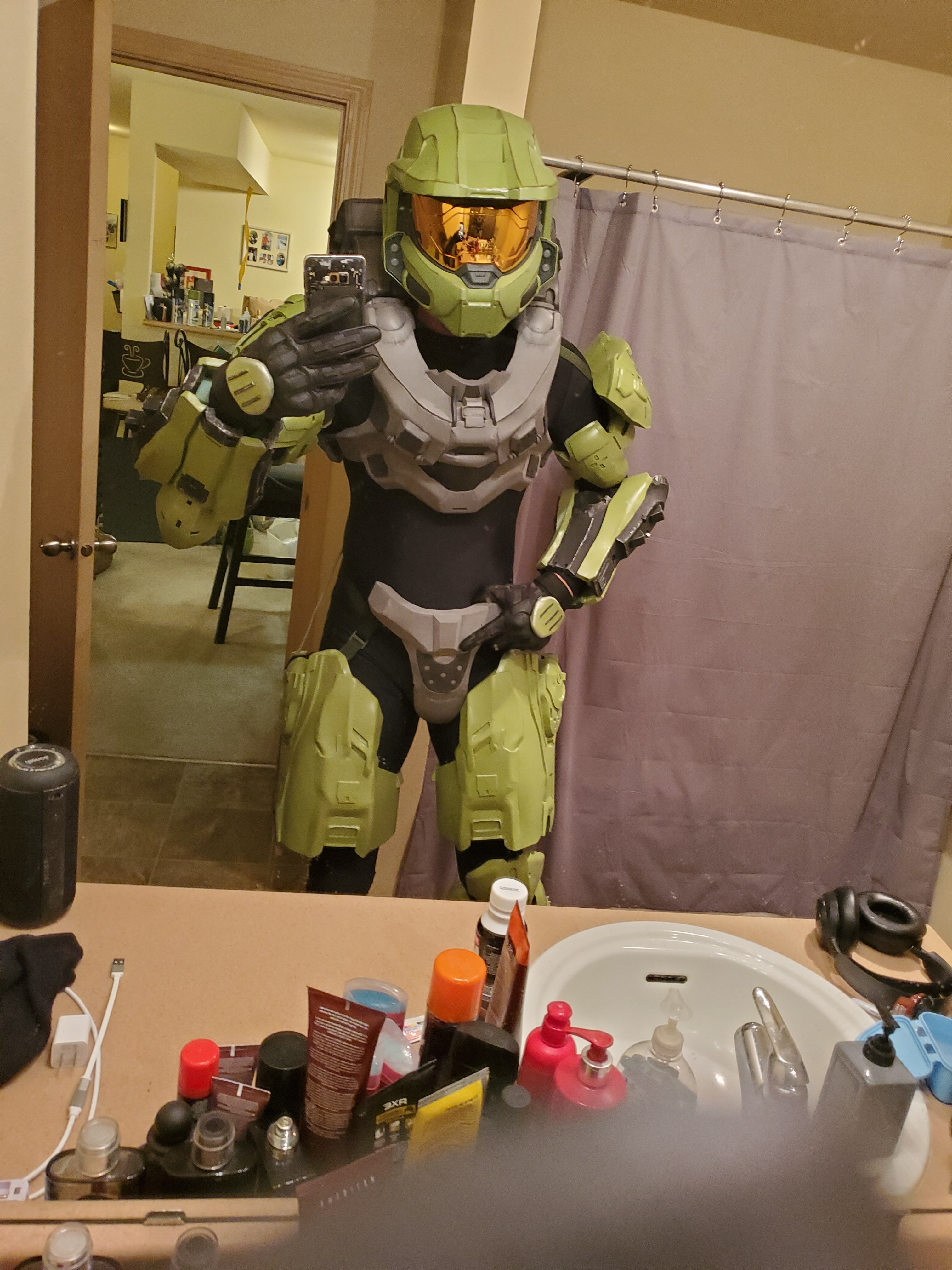 Progress update: the build is coming along and I think I'll finish in time for Halloween with time to spare to try to get some electronics installed: helmet fans, voice amplifier, hearing amplifier, and maybe even some lighting. I was thinking of trying to add a setup with some lights on the armor that glowed a steady blue but when I press a button a speaker plays the shield break sound effect and then the shield recharge effect, with the blue light changing to a flashing red light and back to blue when the sheilds recharge. I found some kits for the sound effects but am unsure how to get the led lights to sync with the sound effect, so we will see.