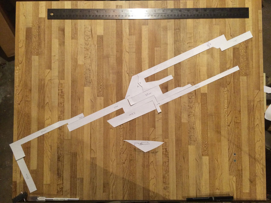From here, I broke it down into sections and put together a skeleton, based on the widths of the narrowest points within the sections and the widths of MDF I had available (If you're building an MDF gun, source 1/8" stock... Going without is harder than it seems). Then I fit it to letter size paper and printed it:
