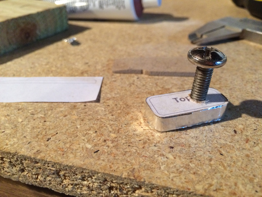 The cap for the chassis keyhole before cutting. Two sheets of styrene.