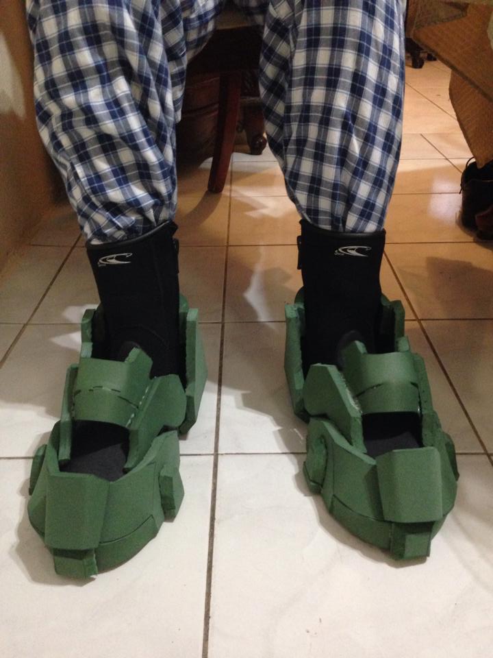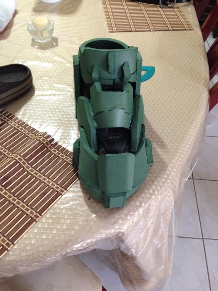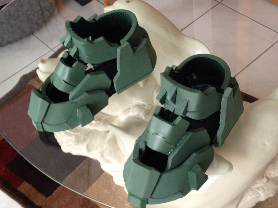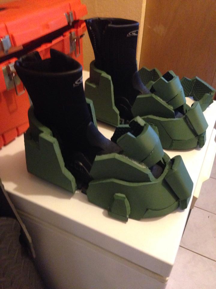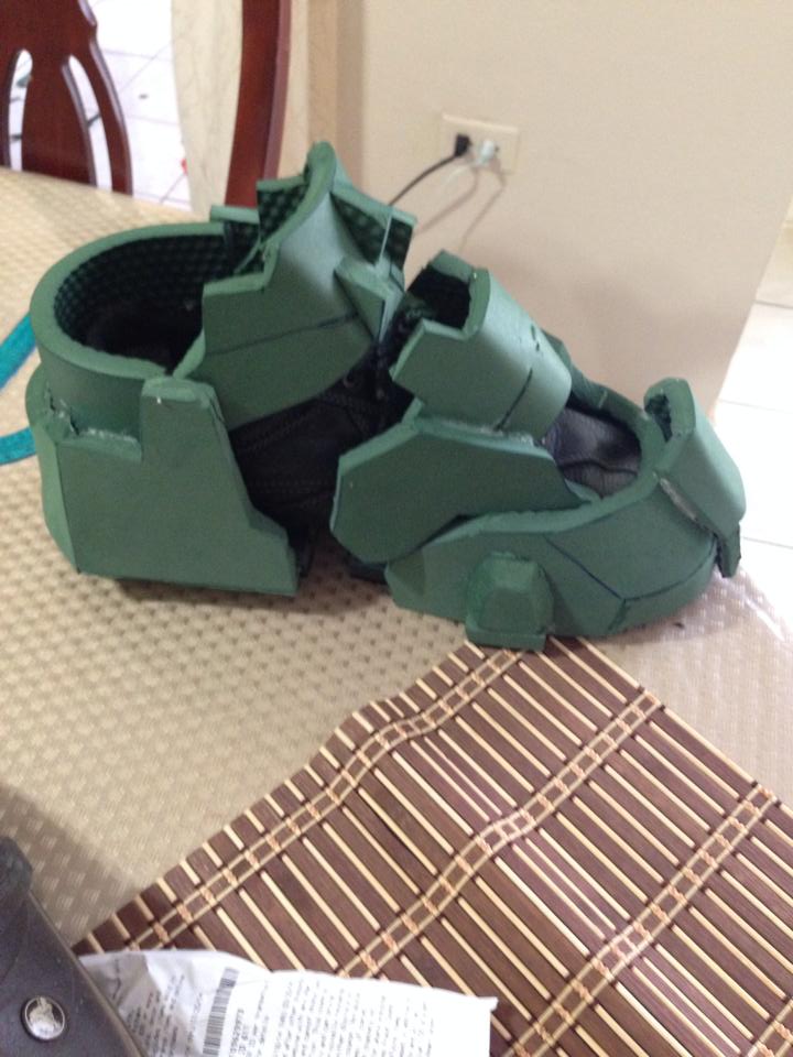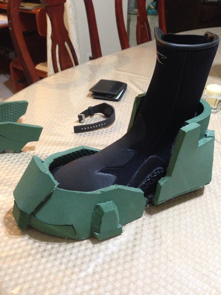 So am back again, started my armor again since i wasn't happy with the other boots i made and the foam i used was thin so they were all wobbly. So the boots , i bought some thick foam and i also bought some surf boots or wetsuit boots. Watever you want to call them, i bought them not because of their awesome details but because they are high top wetsuit boots. So i will be figuring out how to attach the top piece that has the 3 trinagle details to the wetsuit so it can look like its appart from the armored boot. Same goes for the piece that goes inside the top of the feet, i will be glueing them on the bottom of the wings ( making a foam piece so the wings stay float and can look like they are appart from the armored boot as well). Ill post a picture so you can understand better , its like an extended piece for support. the hole thing is raw soo the pictures show pieces that are like misplaced so the thing aint glued or completed yet. So hope you guys like it.